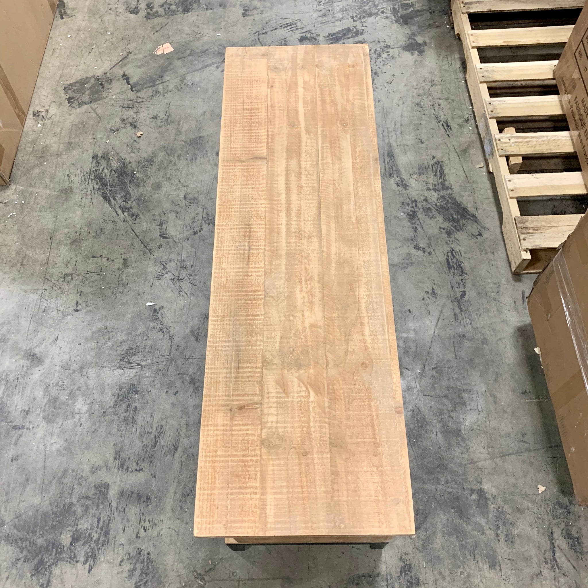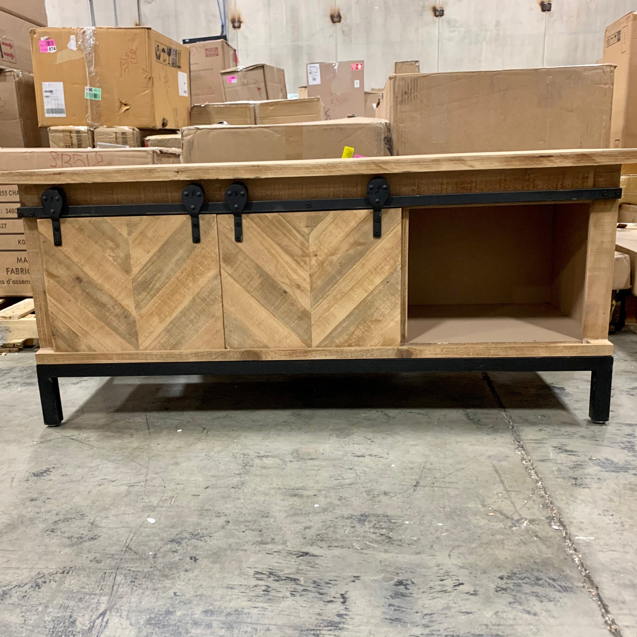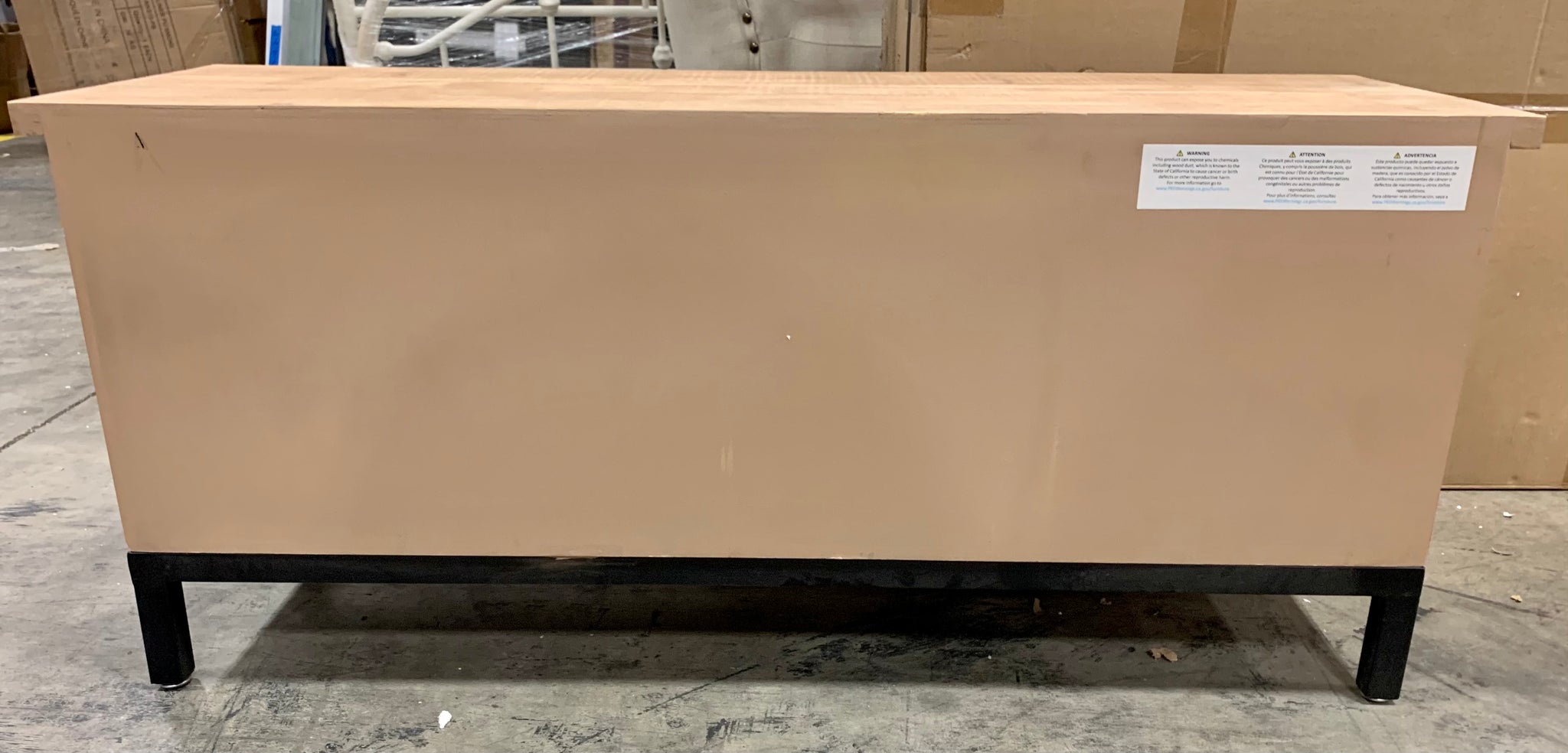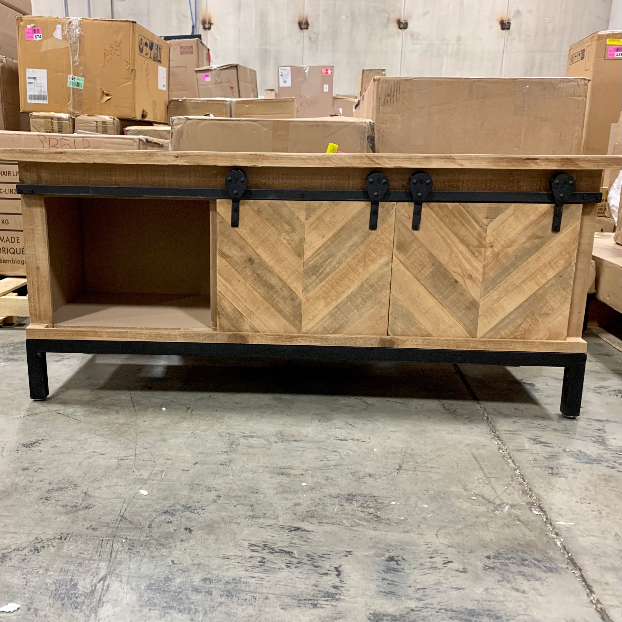 Out of box item. Fully assembled TV stand made of solid and manufactured wood in a natural wood grain color variation finish. While the easy glide rails and the legs are made of metal in a brown finish. This TV stand includes 2 drawers and 2 cabinets for ample storage and can be paired with TV's up to 55 inches in width.