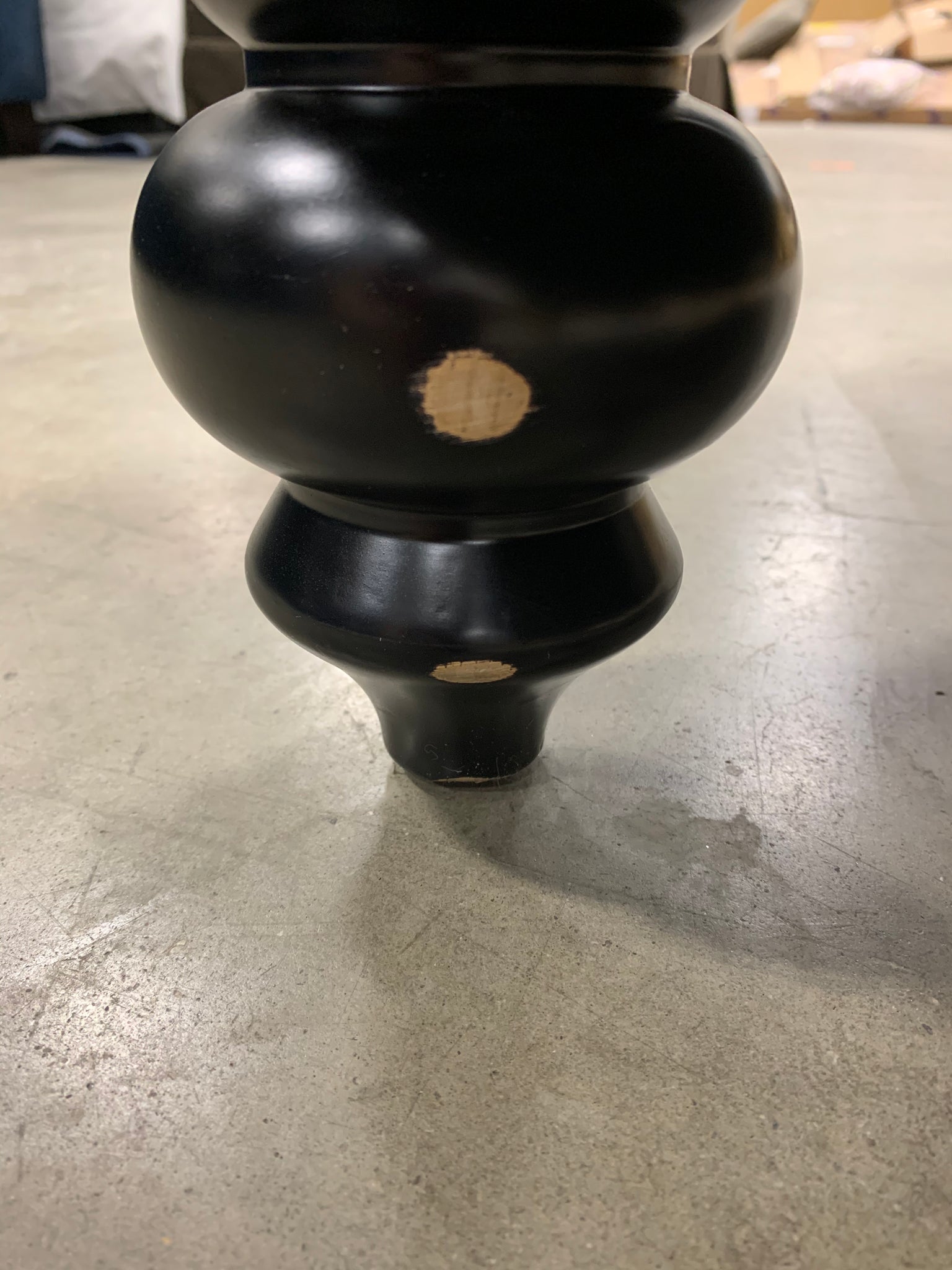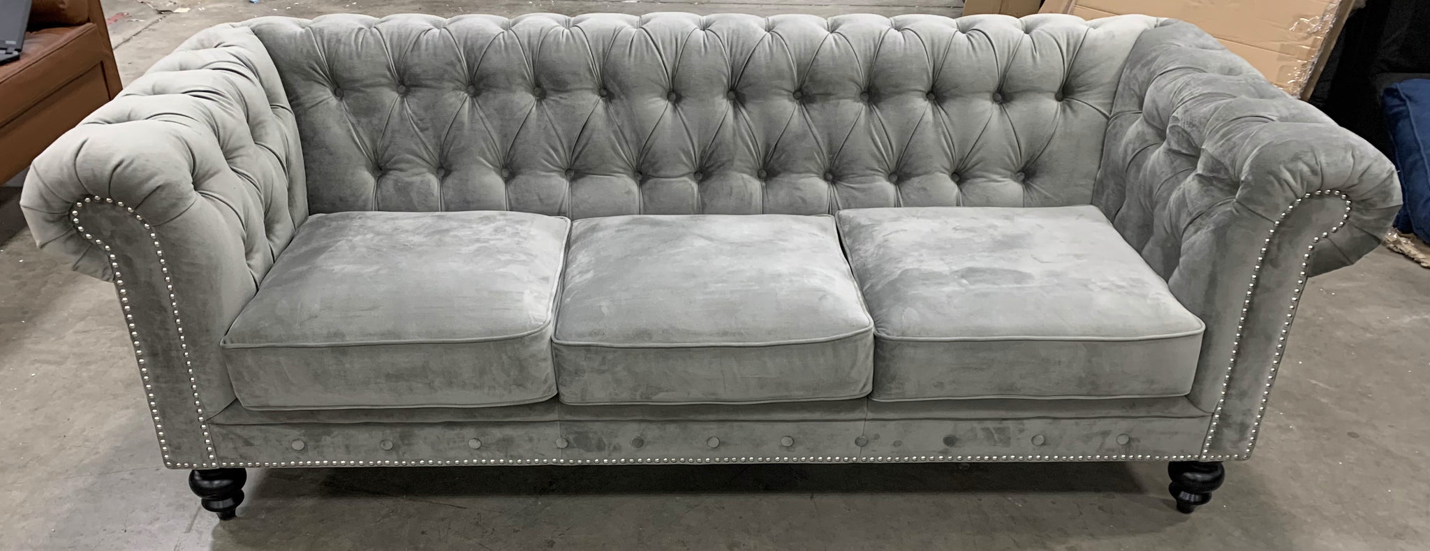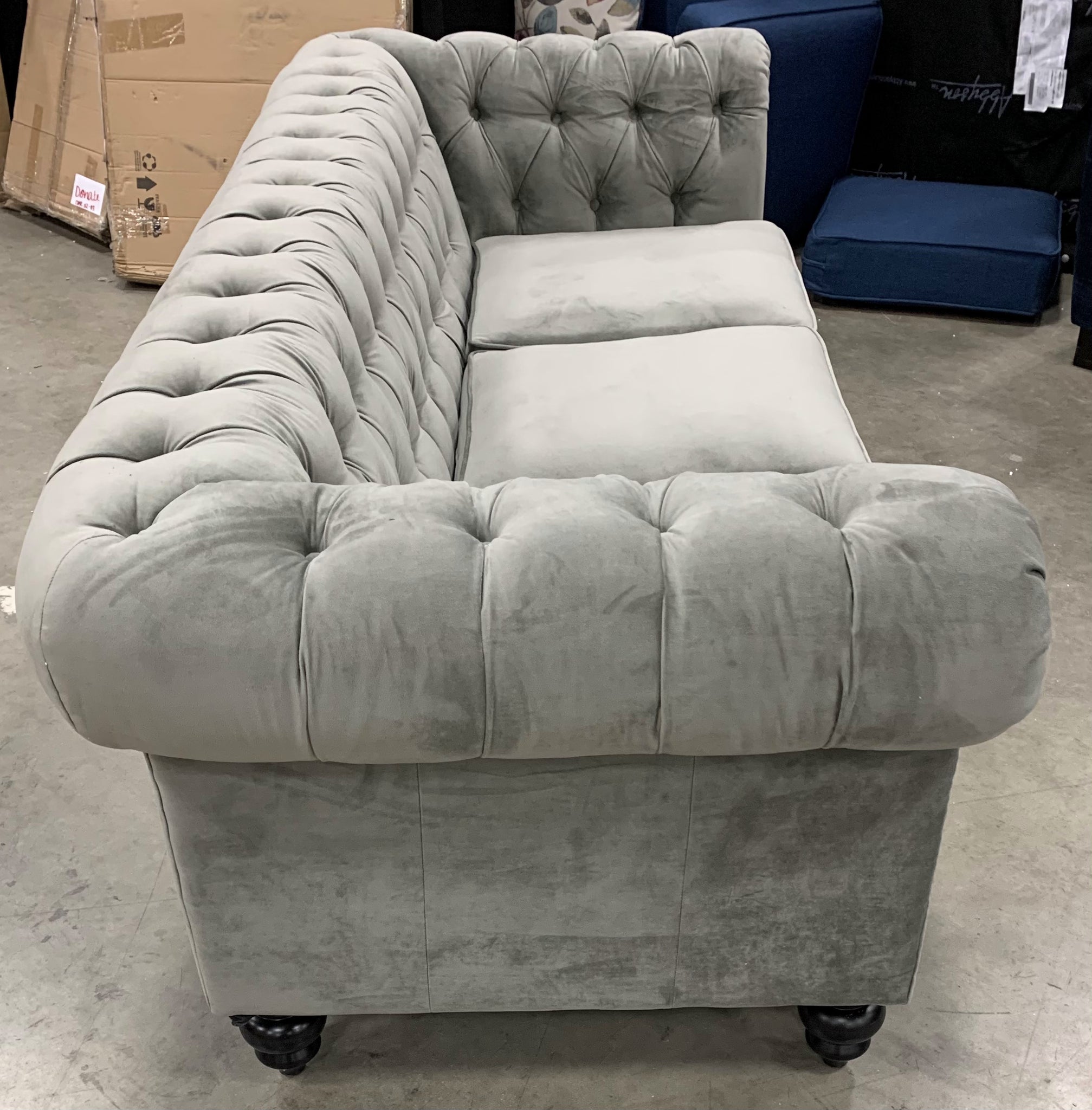 The size is 87" wide. One legs does have a scratch (see pictures).