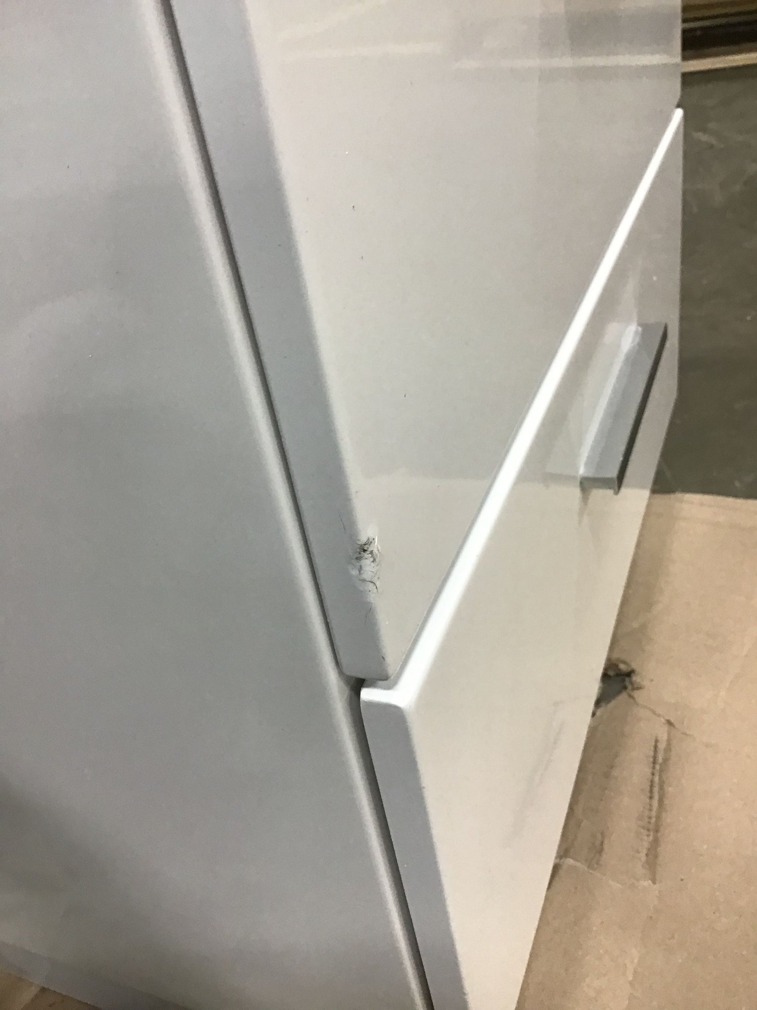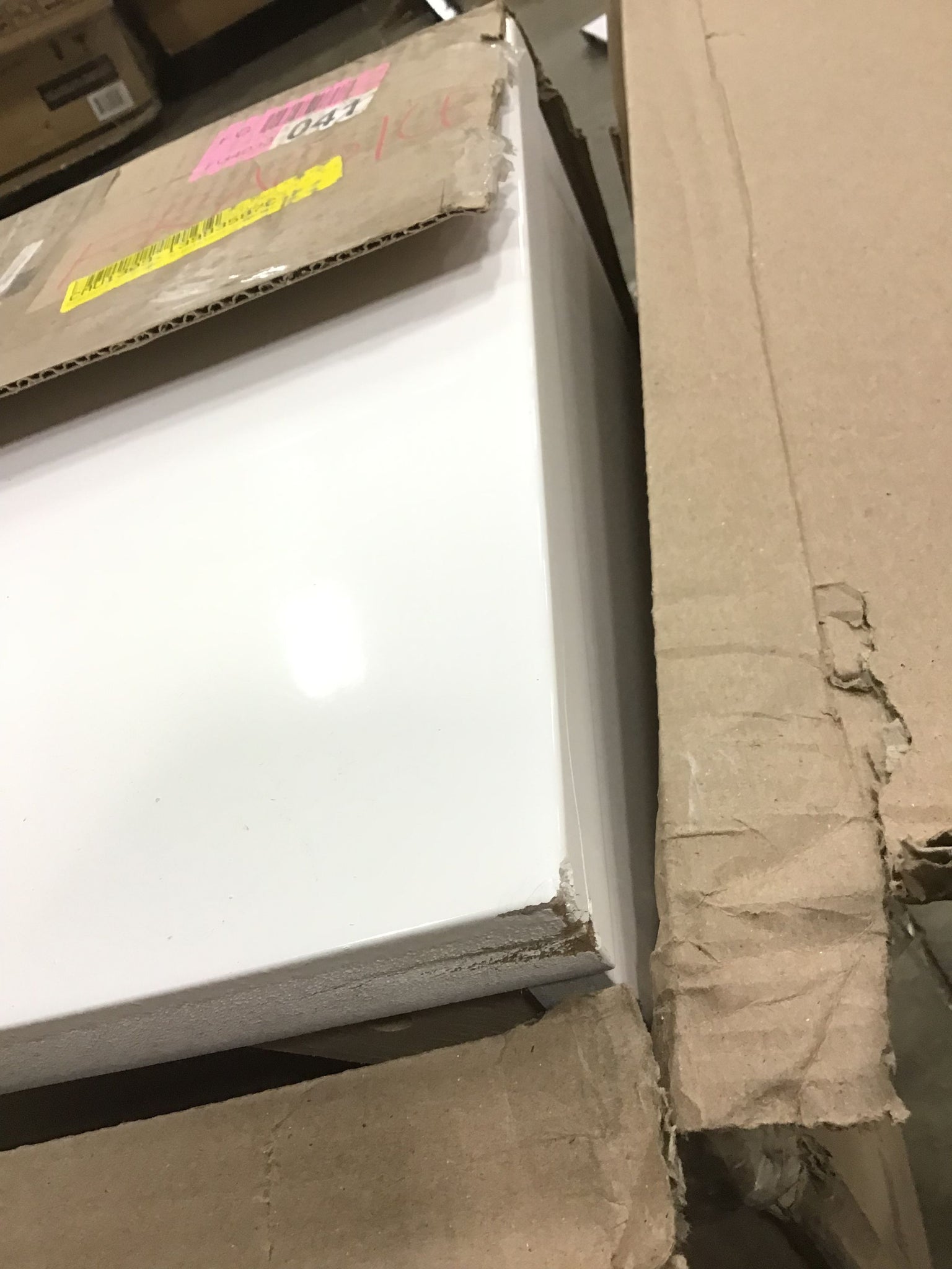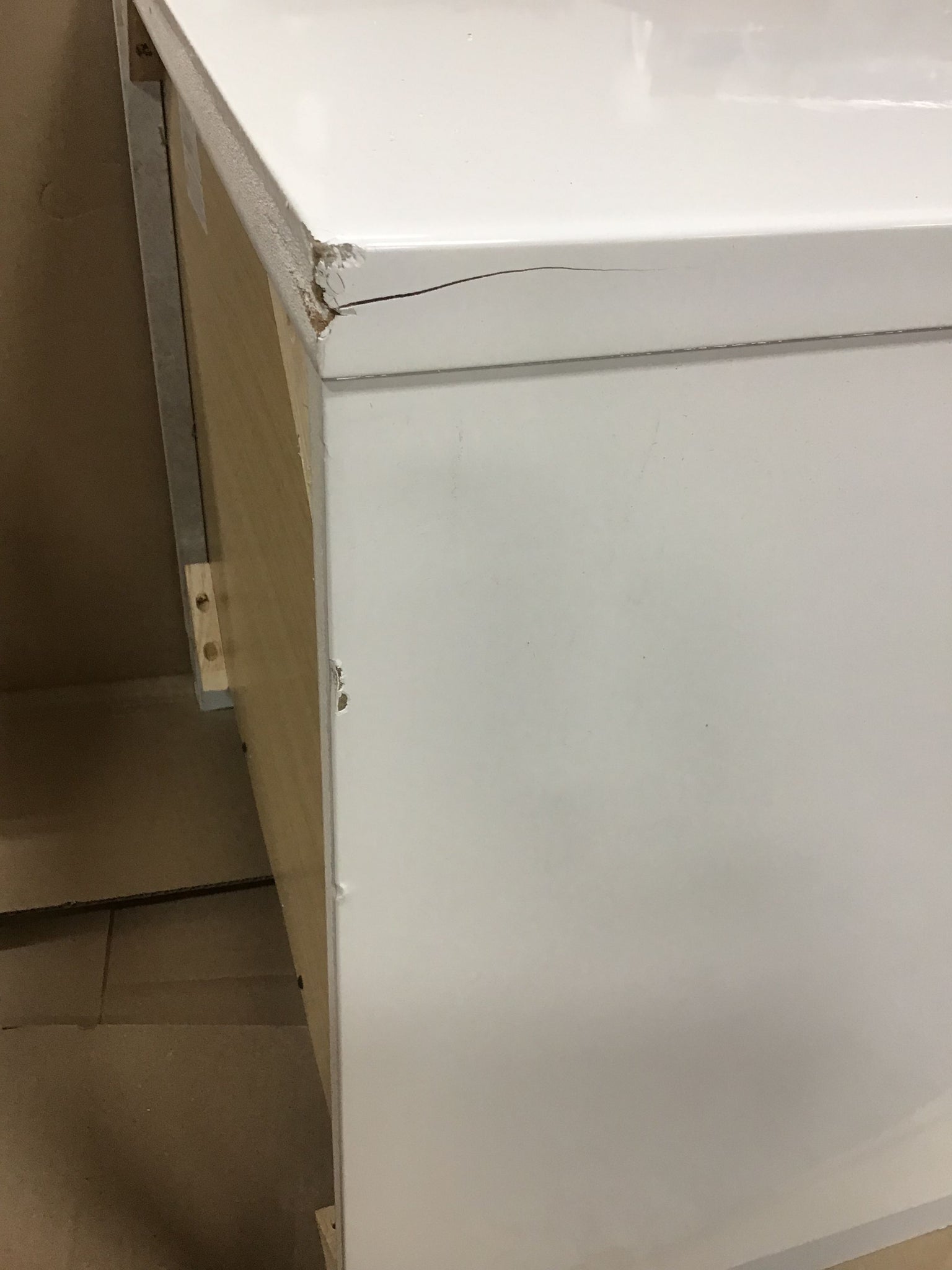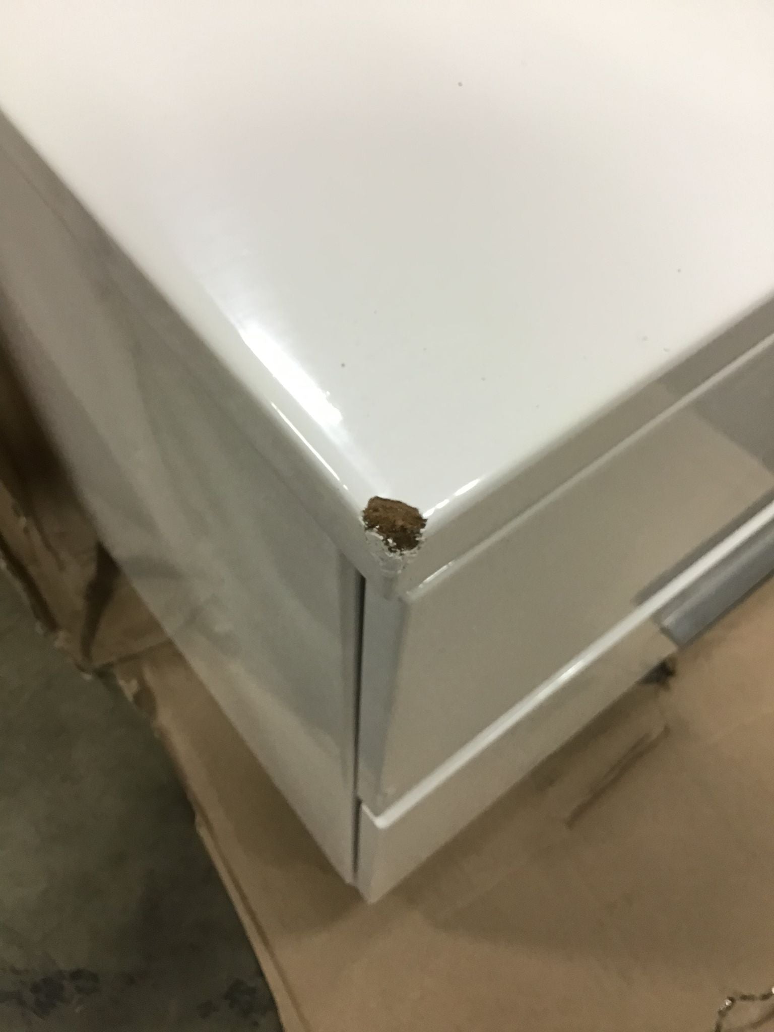Open box, The color is white, AS IS: Dresser has chips on corners and a couple of the sides. See photos