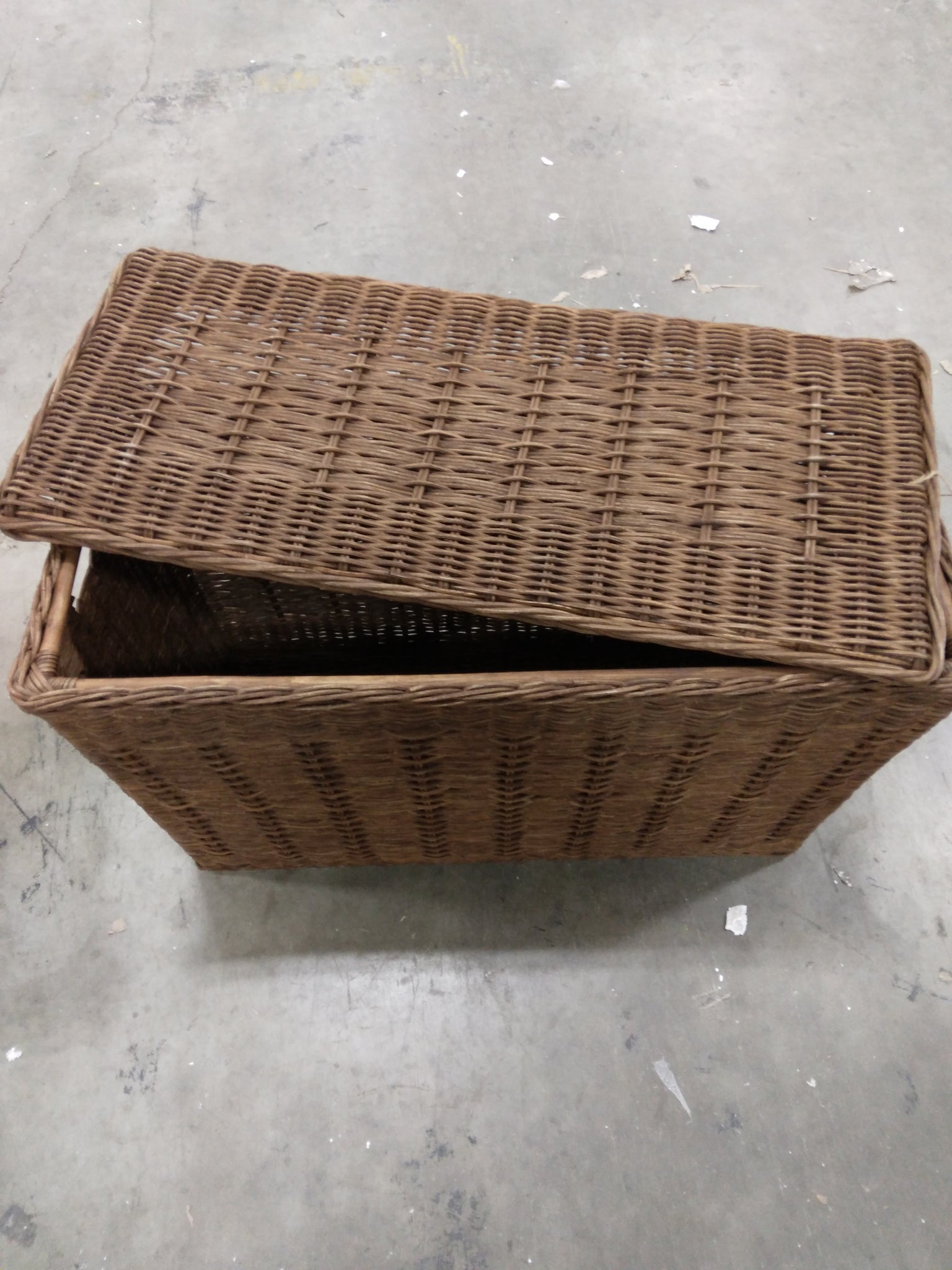 Open Box, The color is chocolate brown, Size: 16"L x 35"W x 24"H, Previously opened. See for photos of wicker basket.