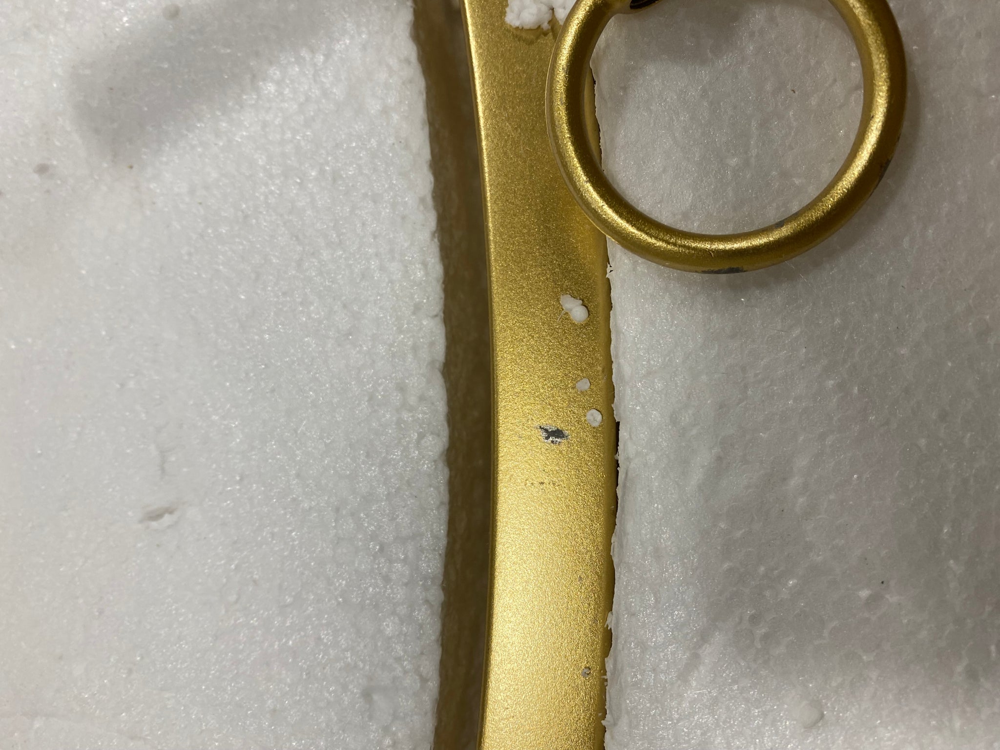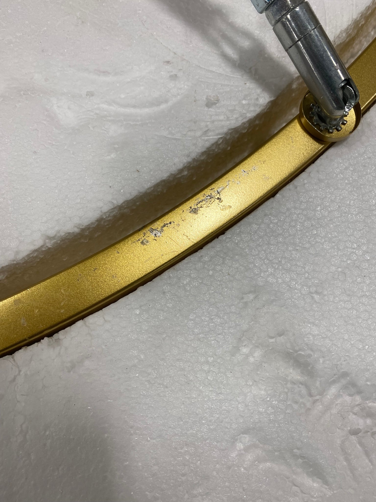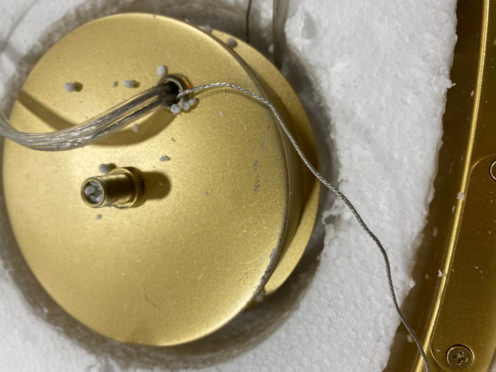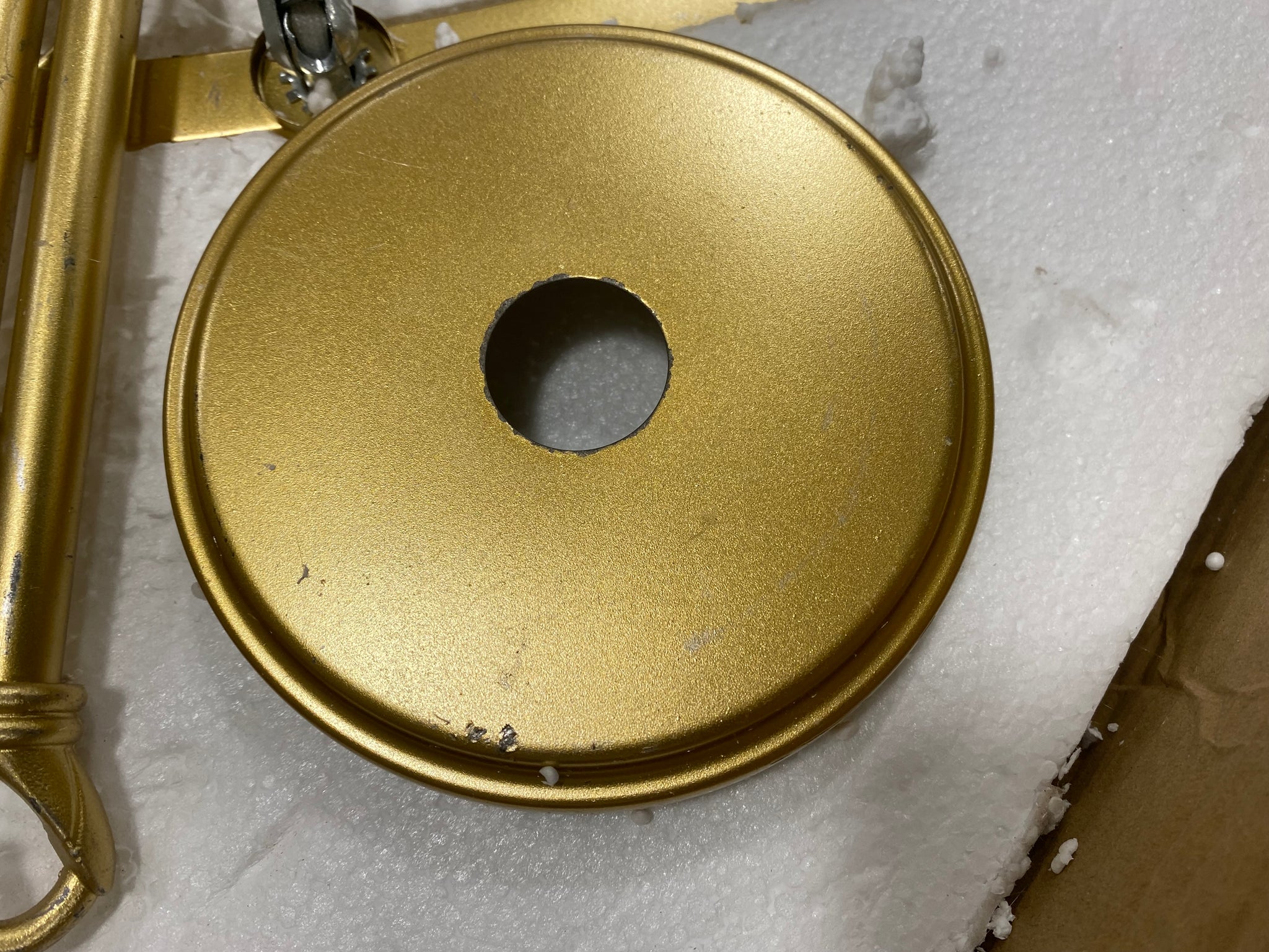 Open Box, The color is satin brass, AS IS Condition: Item has scratches/scuffs on throughout on ceiling cap and chandelier ring. See photos.