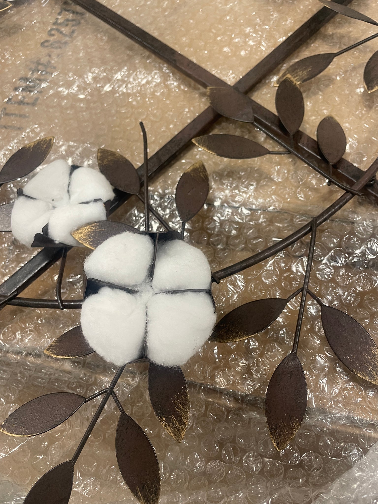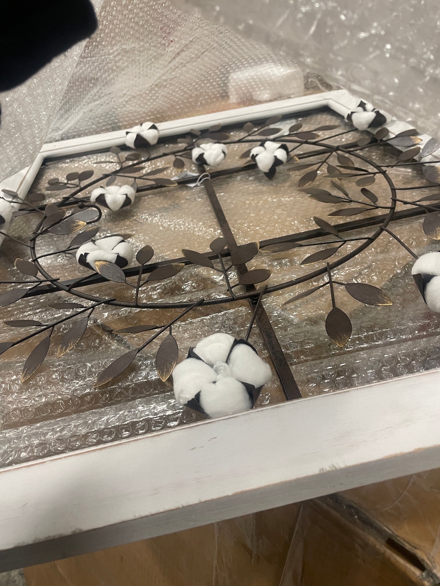 Open box item, good condition except for one of the cotton flowers have fallon off. It is in the box but it's hard to tell where it came off of because the wreath looks pretty good without it, see pics.