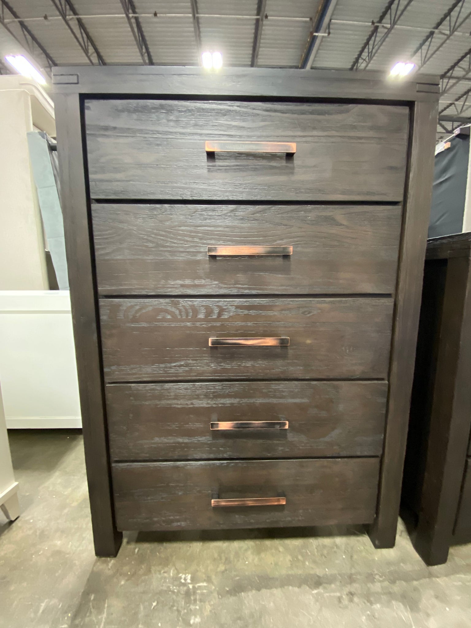 Out of the box, The color is brushed brown, Please Note: Drawer pulls have been replaced; not original to piece. Chest has some slight white marks on right side panel. Item in otherwise good condition.