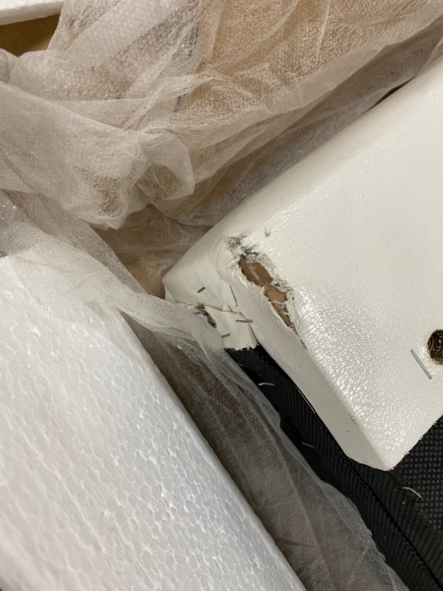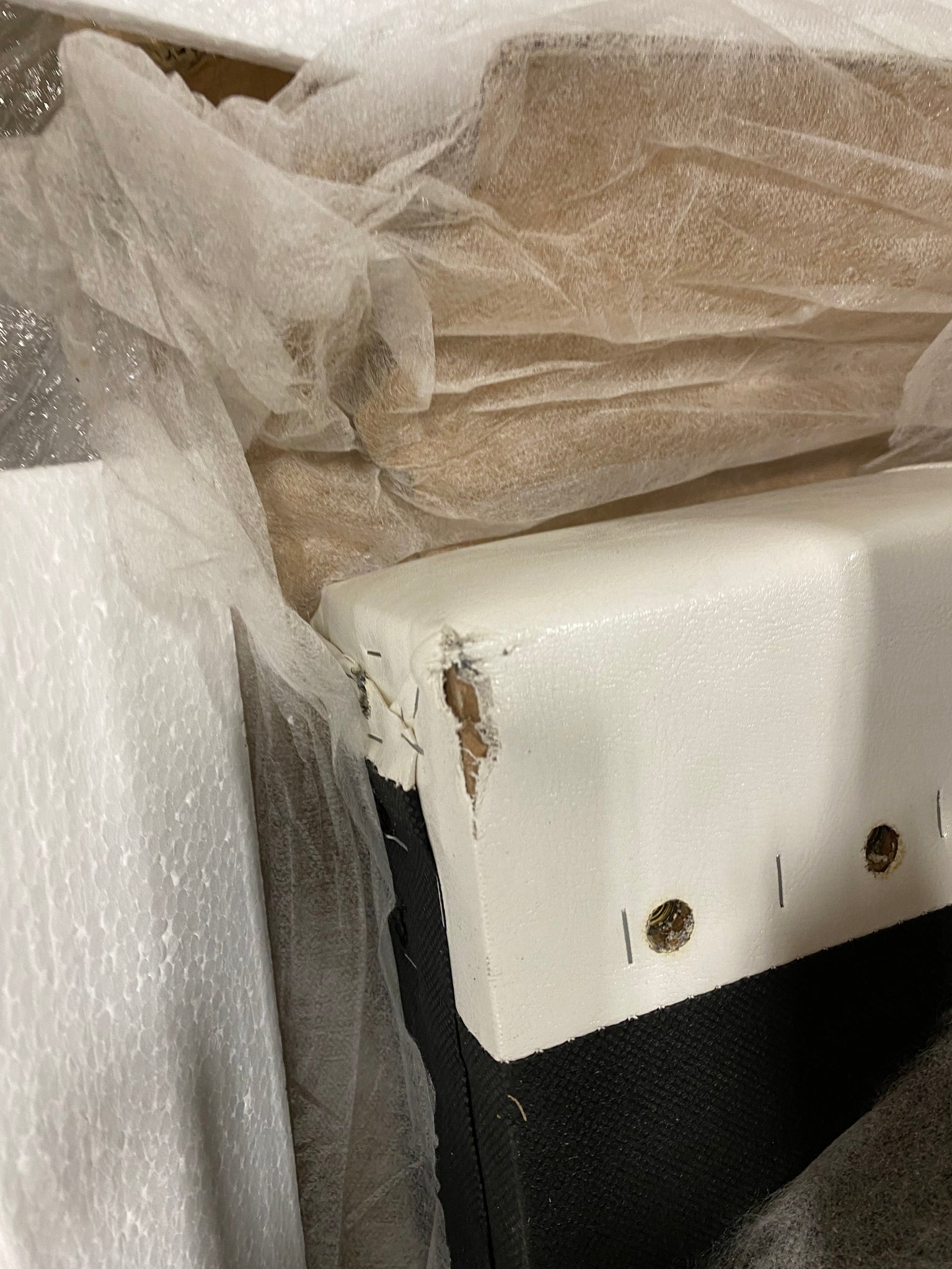 Note: Small torn area on bottom left corner of headboard. See photo.