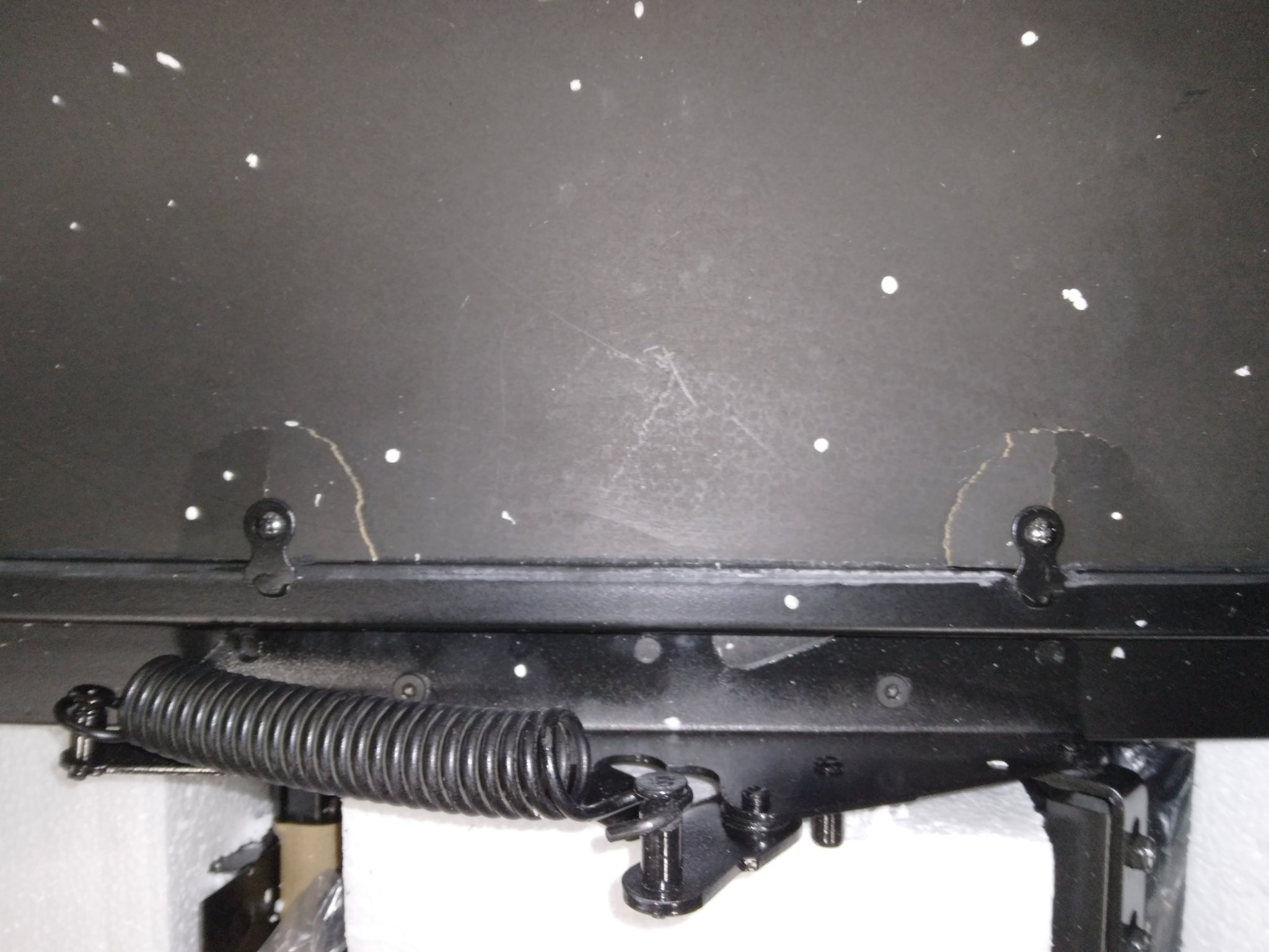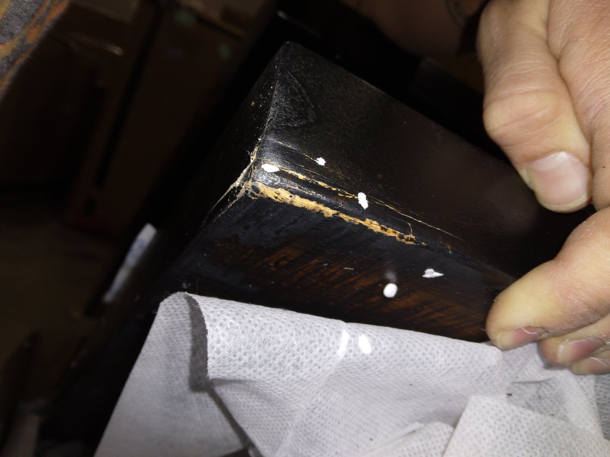 Note: There is a chip on one corner of the table top. There is also 2 decent crack underneath the bottom storage piece. Please see the actual photos.