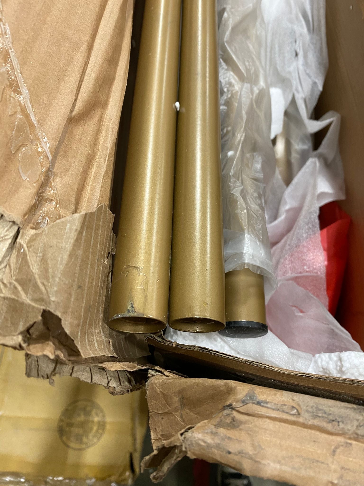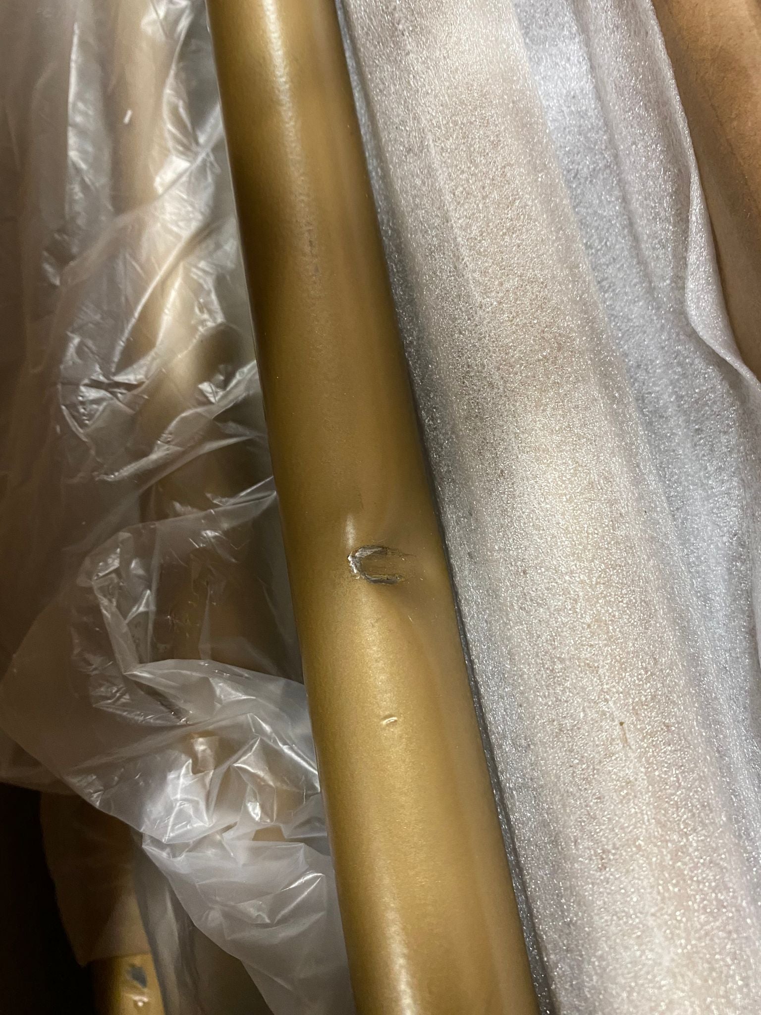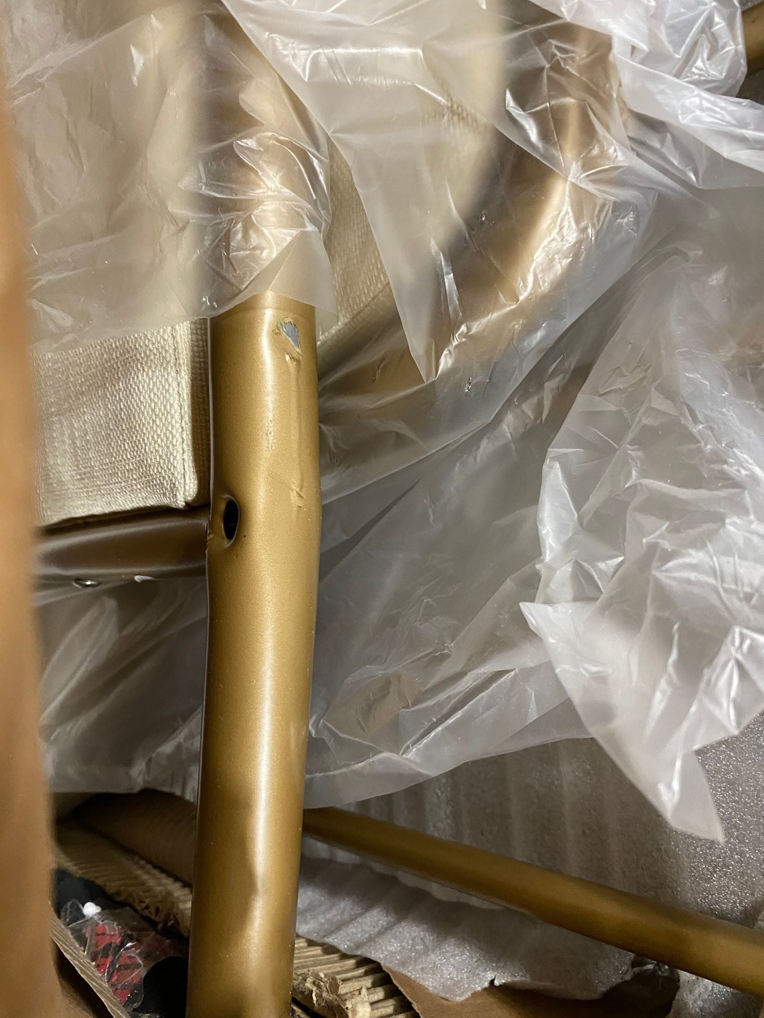 Open Box, The color is gold, Item in AS IS condition: Item has some dent damaged on side panel rail; dented/bent near foot. Hardware is included but is loose.