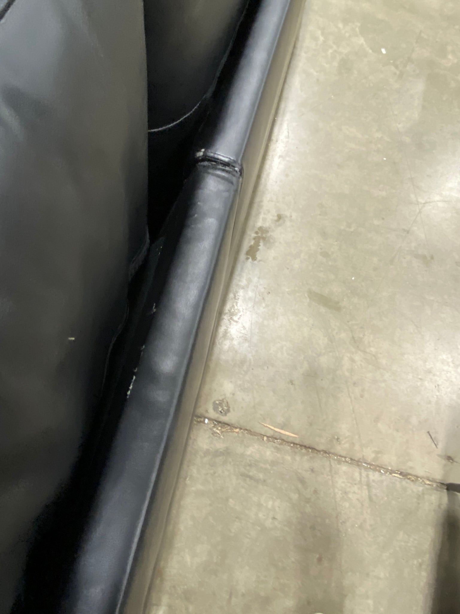Out of box, The color is black, Has a tear on top seat cushion/back corner of arm on sofa piece; slight scuffing on top corners of sofa and chaise pieces. Slight scuffing throughout. Item in otherwise good condition.