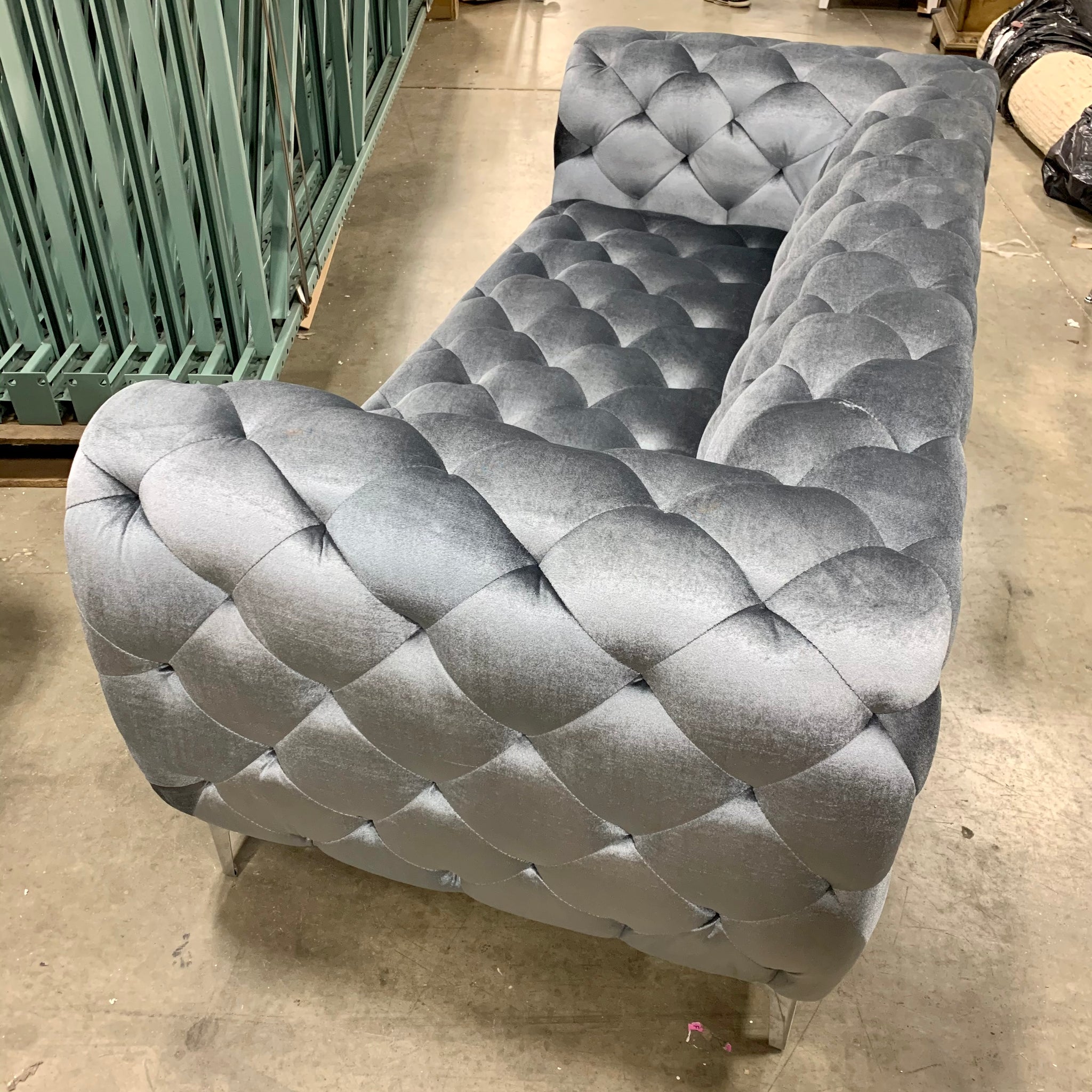 Fully assembled loveseat upholstered in gray velvet with a solid wood frame and metal legs in a silver finish. Item appears to be in great condition.