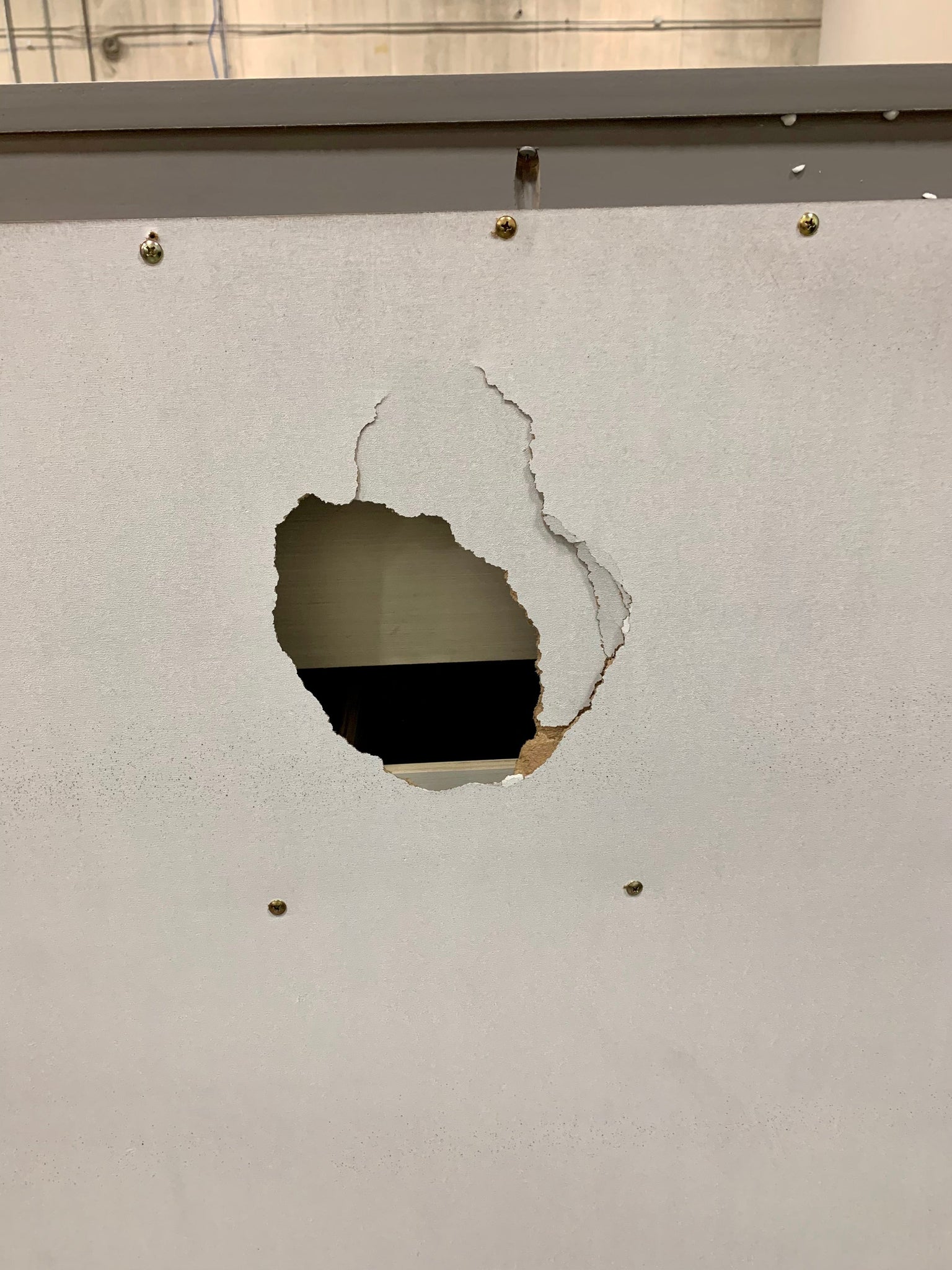Out of Box, The color is Gray. Item has minor damage on the back of the dresser due to open shipment. There is a small/medium hole on the back side of the dresser, but item is otherwise in excellent condition. See photos for reference.