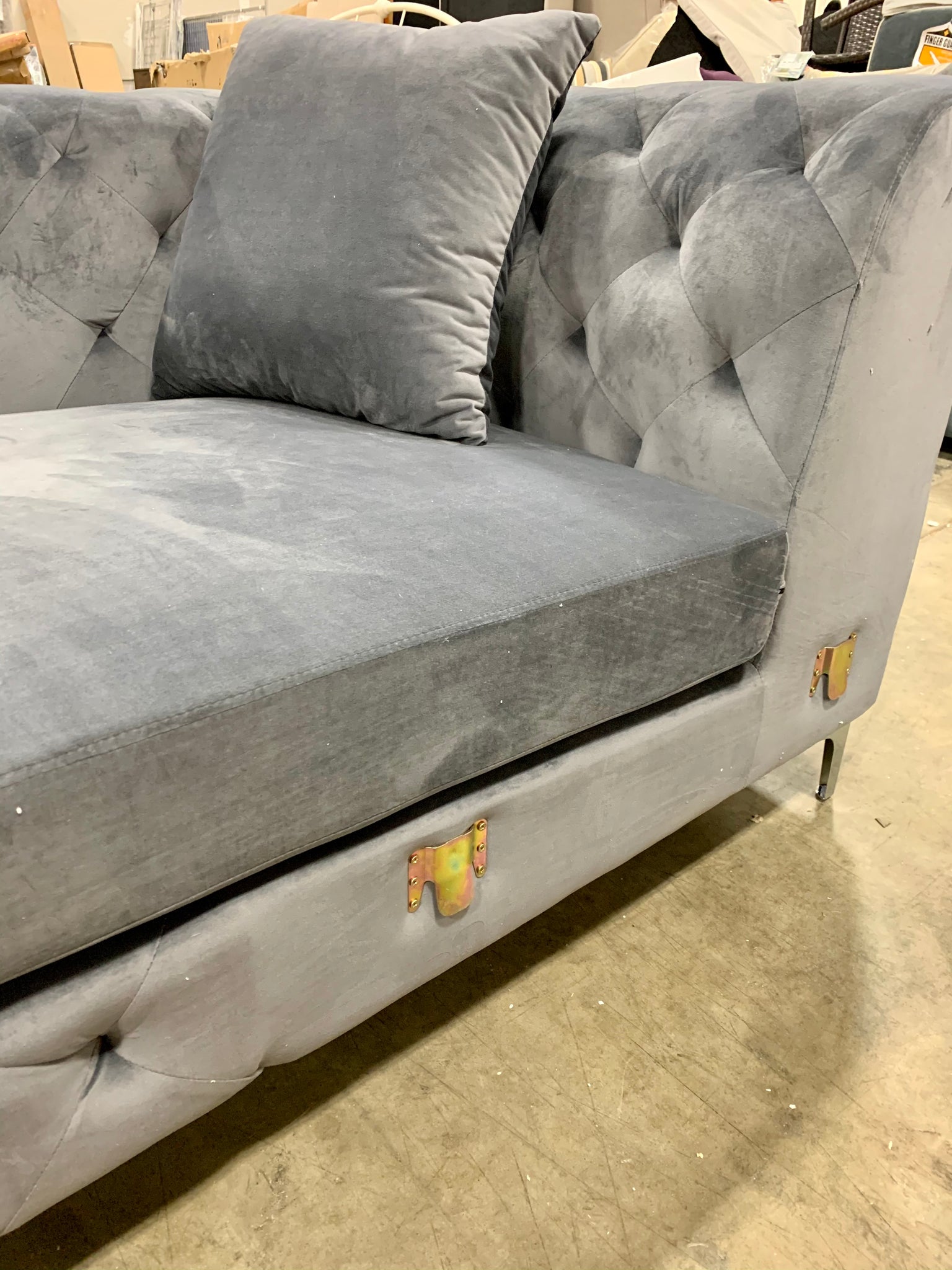 Open box item. This chaise is upholstered in grey velvet with deep tufting, chrome legs, and a pillow included. This item is being sold separately as 1 part of a 3 piece sectional.