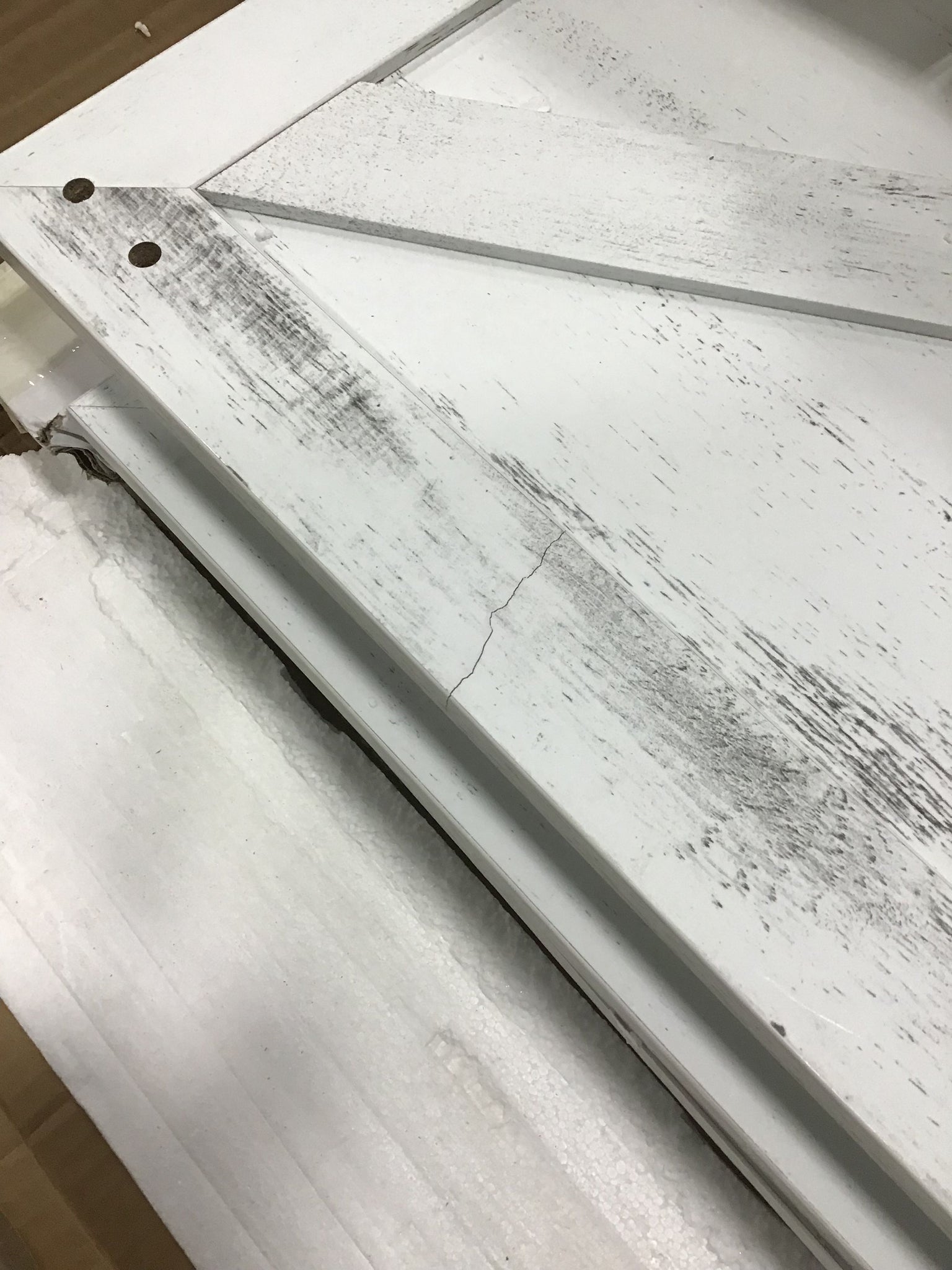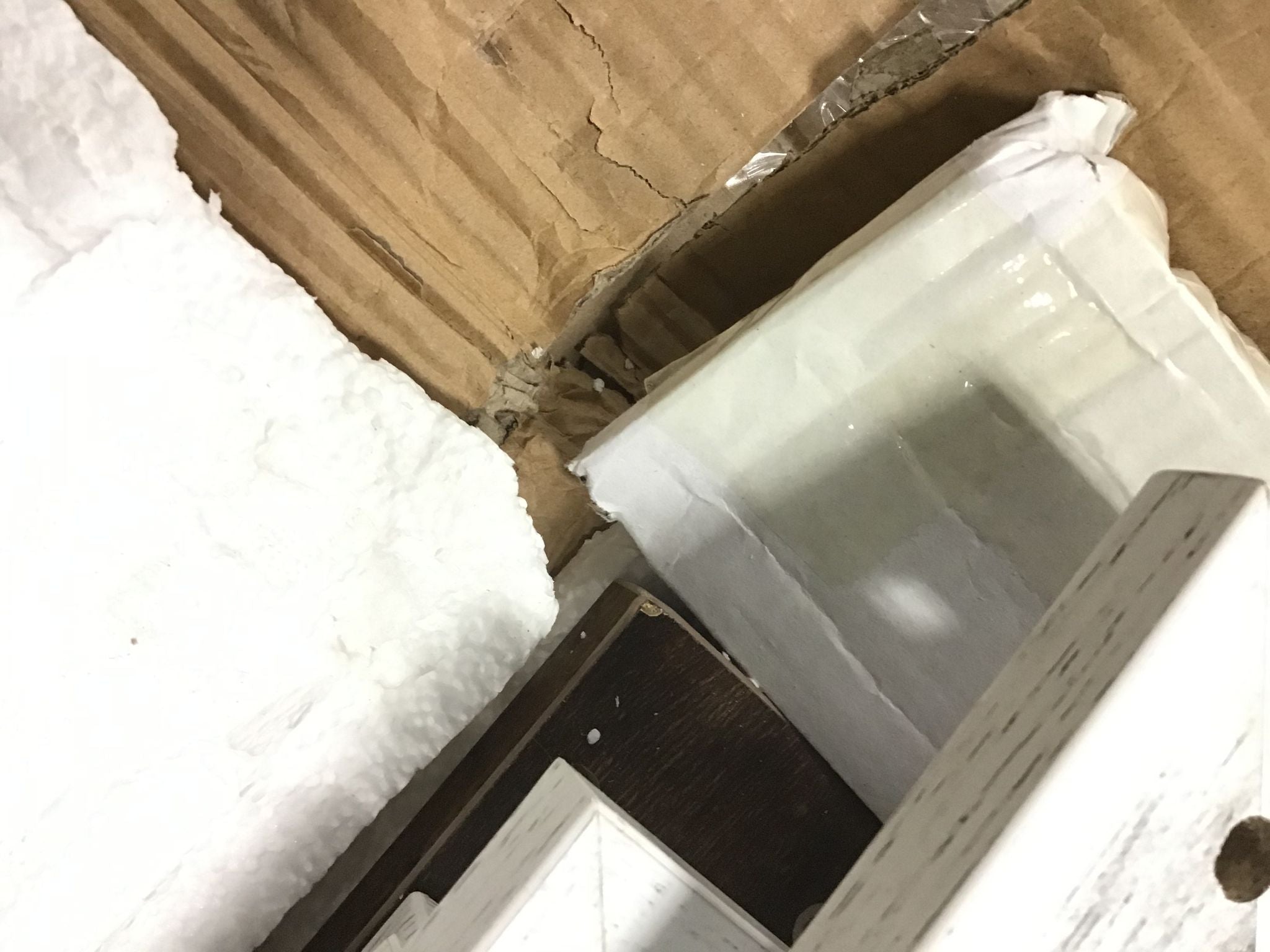 Open box, The color is white, One door piece has a decent sized crack and will need clamped/glued or repaired. A couple of small chips on corners. See photos.