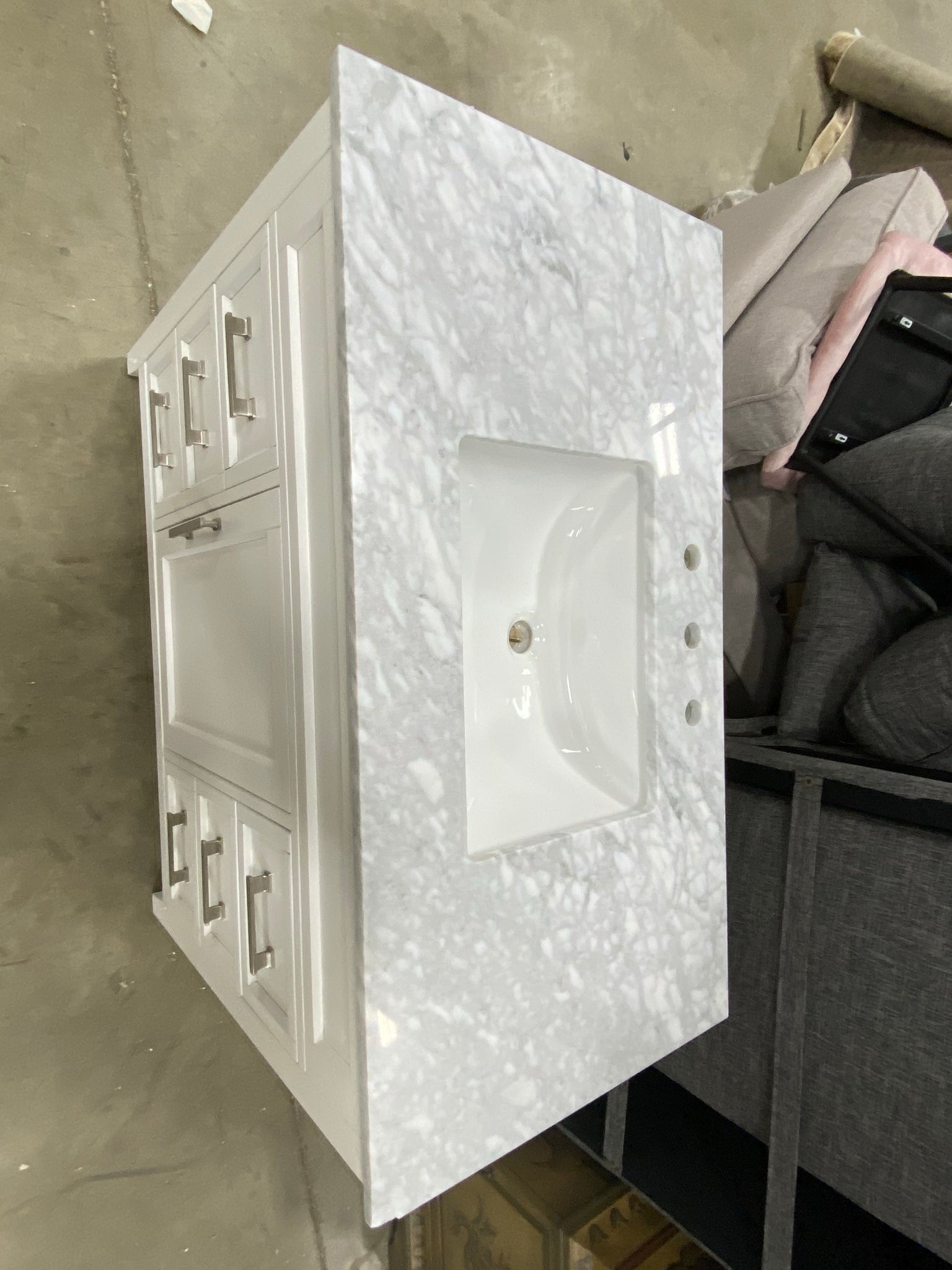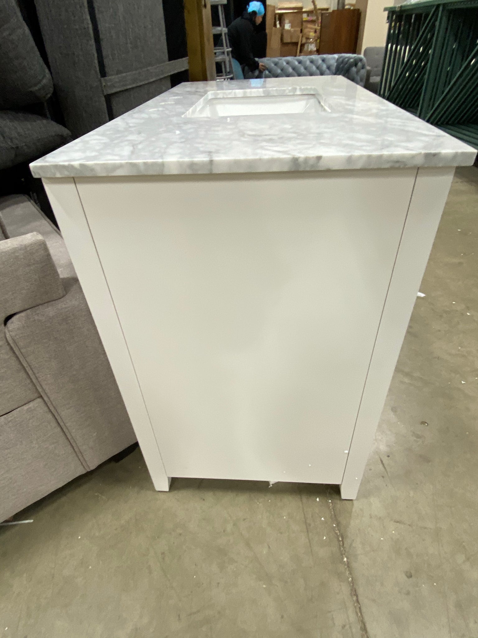 Please Note: Corner of sink top marble chipped off due to shipment. See photo. Item in otherwise great condition.