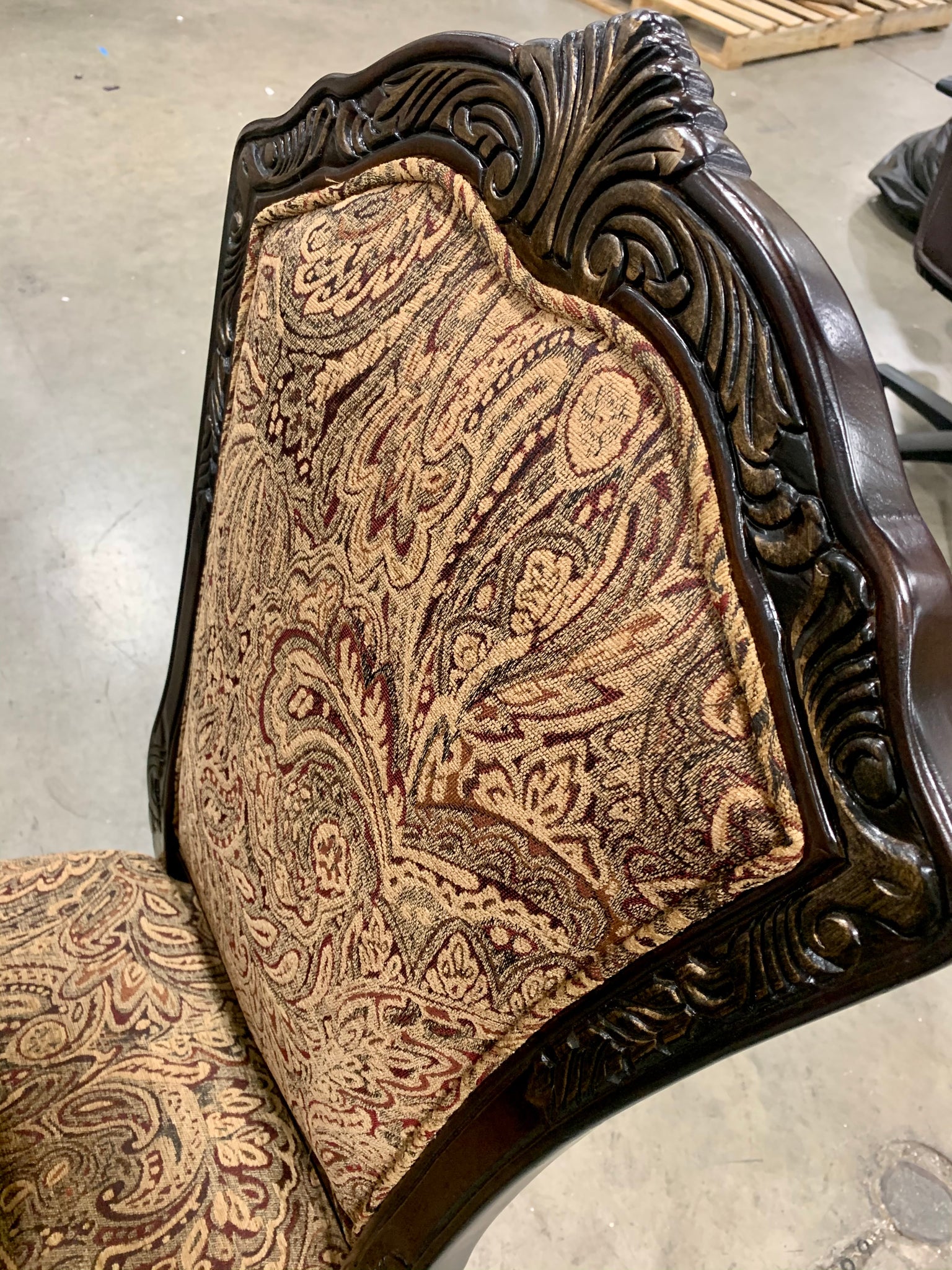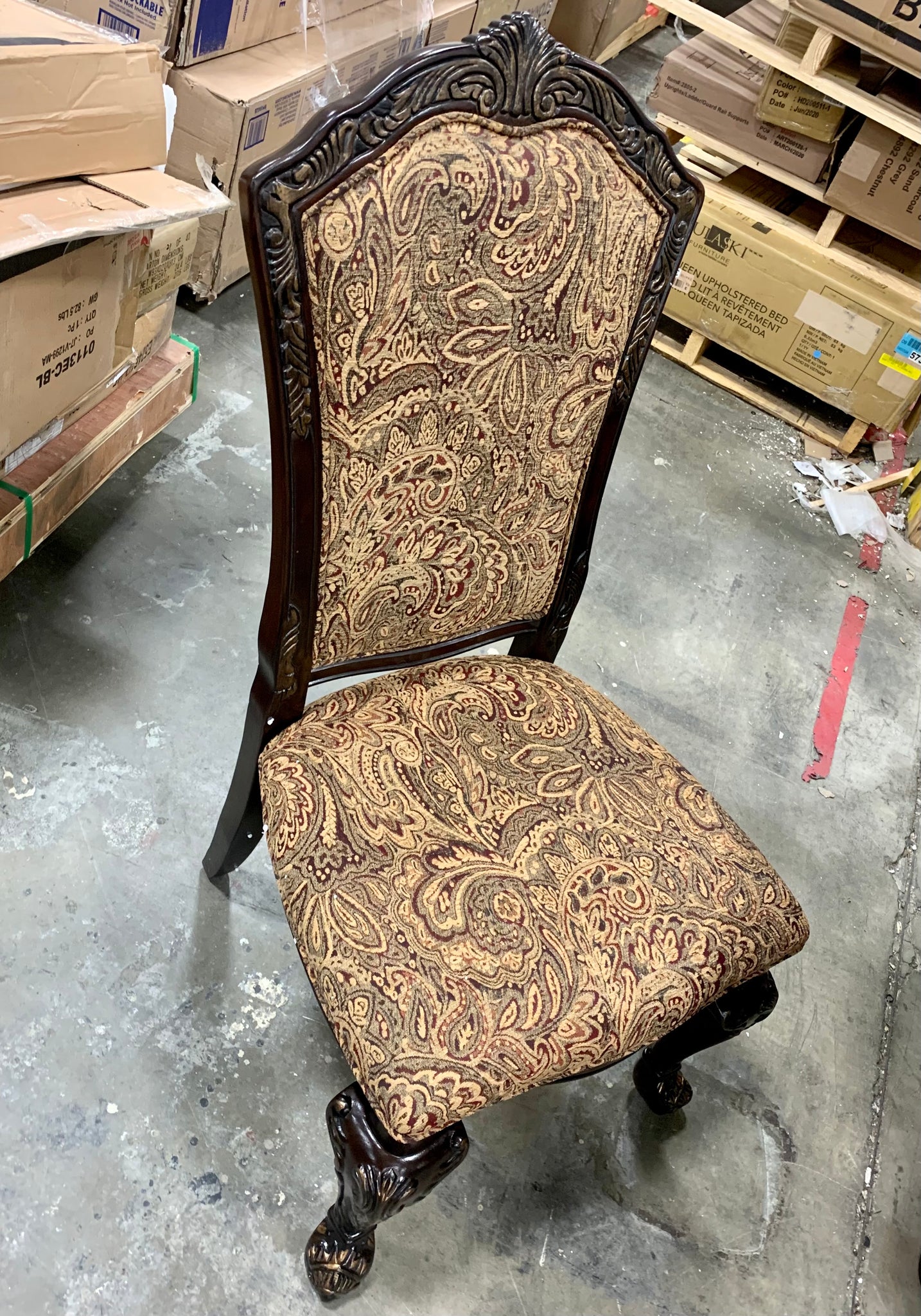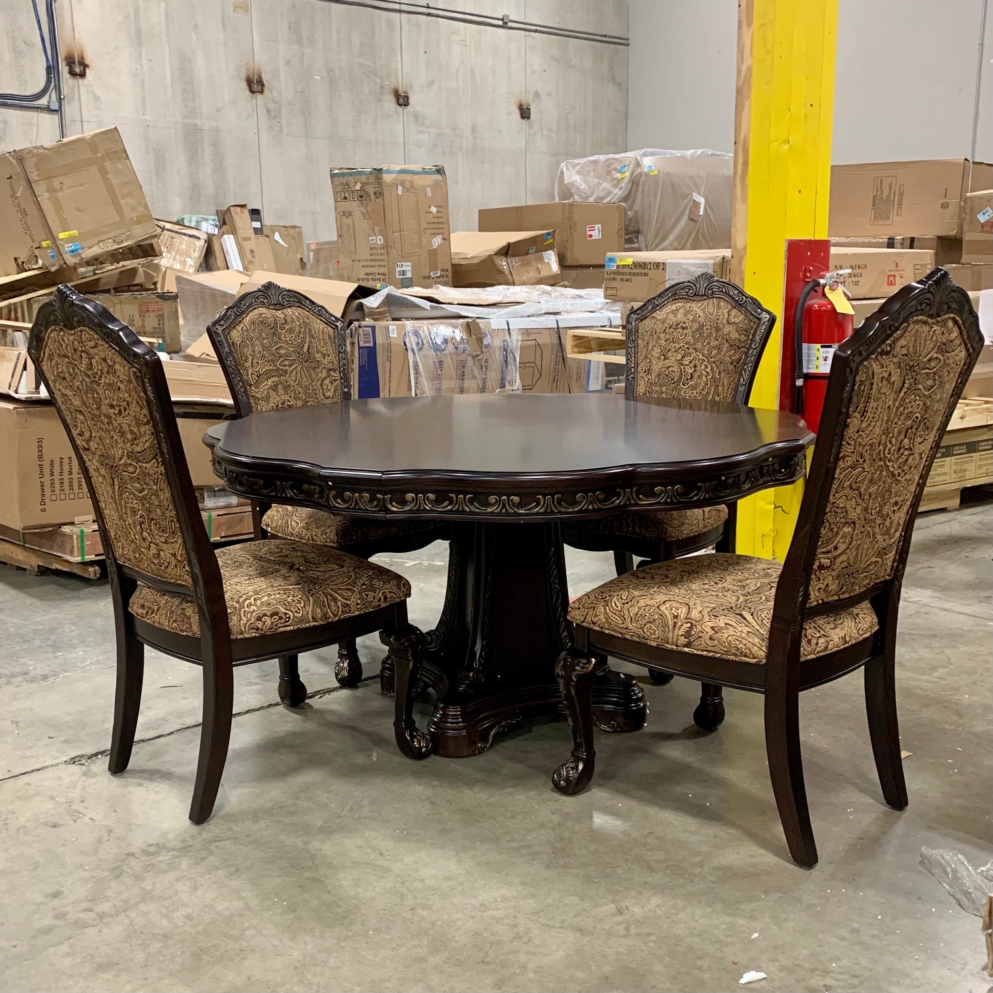 Out of box item. Fully assembled 5 piece dining set that includes 4 chairs and 1 table. This set is made of solid and manufactured wood in a cherry and light cherry finish. This dining set also features thick foam seats and backs covered in a traditional tapestry Chenile fabric.
