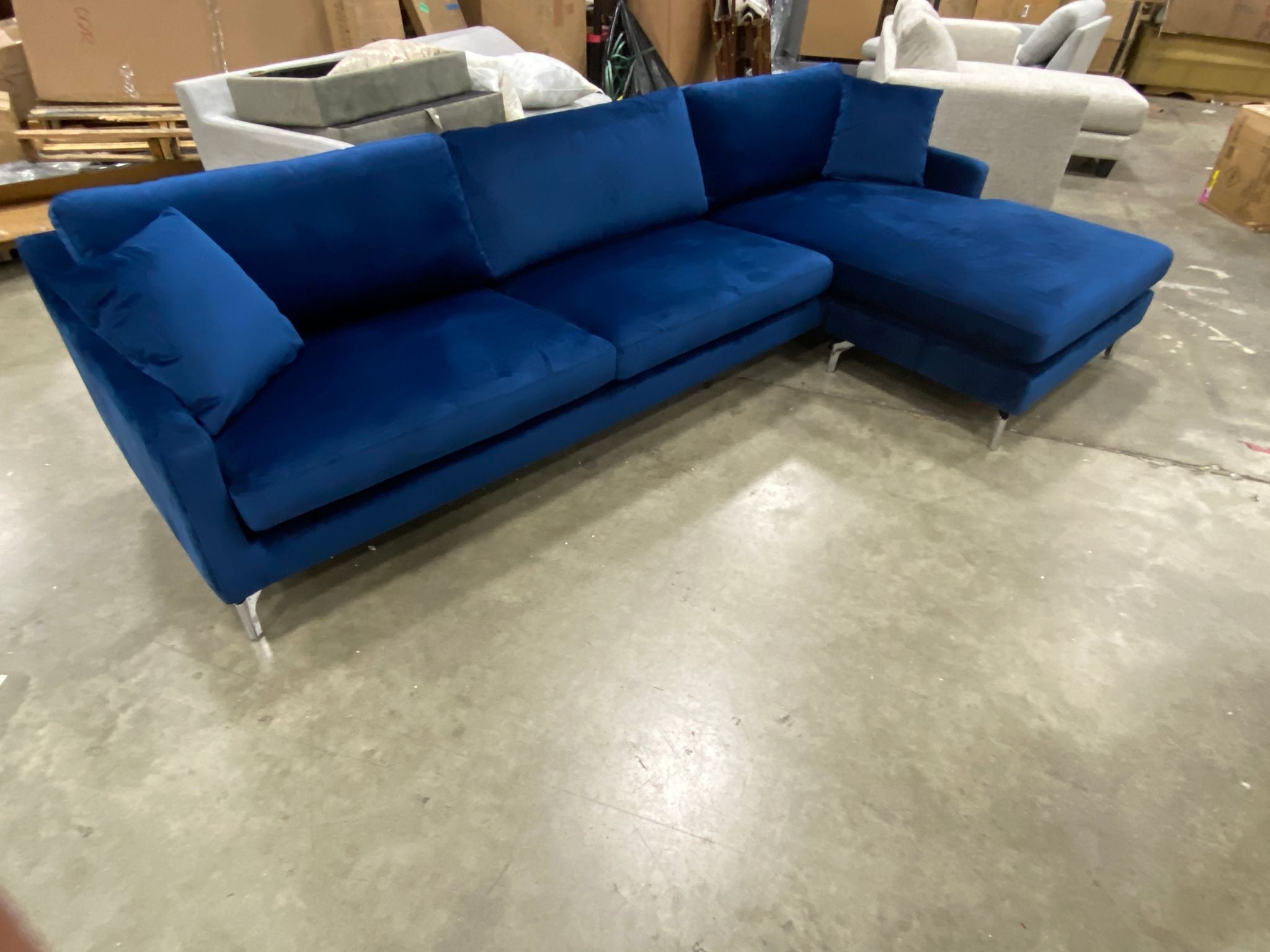 Out of box, The color is stax dark blue, Item has some slight imperfections in the velvet on the back side of sofa. Item in otherwise very good condition.