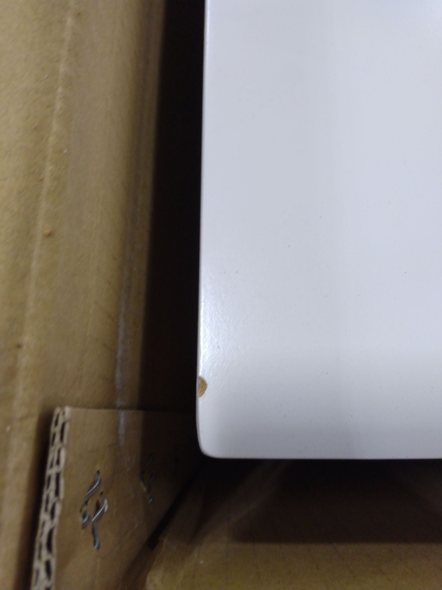 Open box, AS IS!!! There is a small chip on the top, left corner of the dresser.