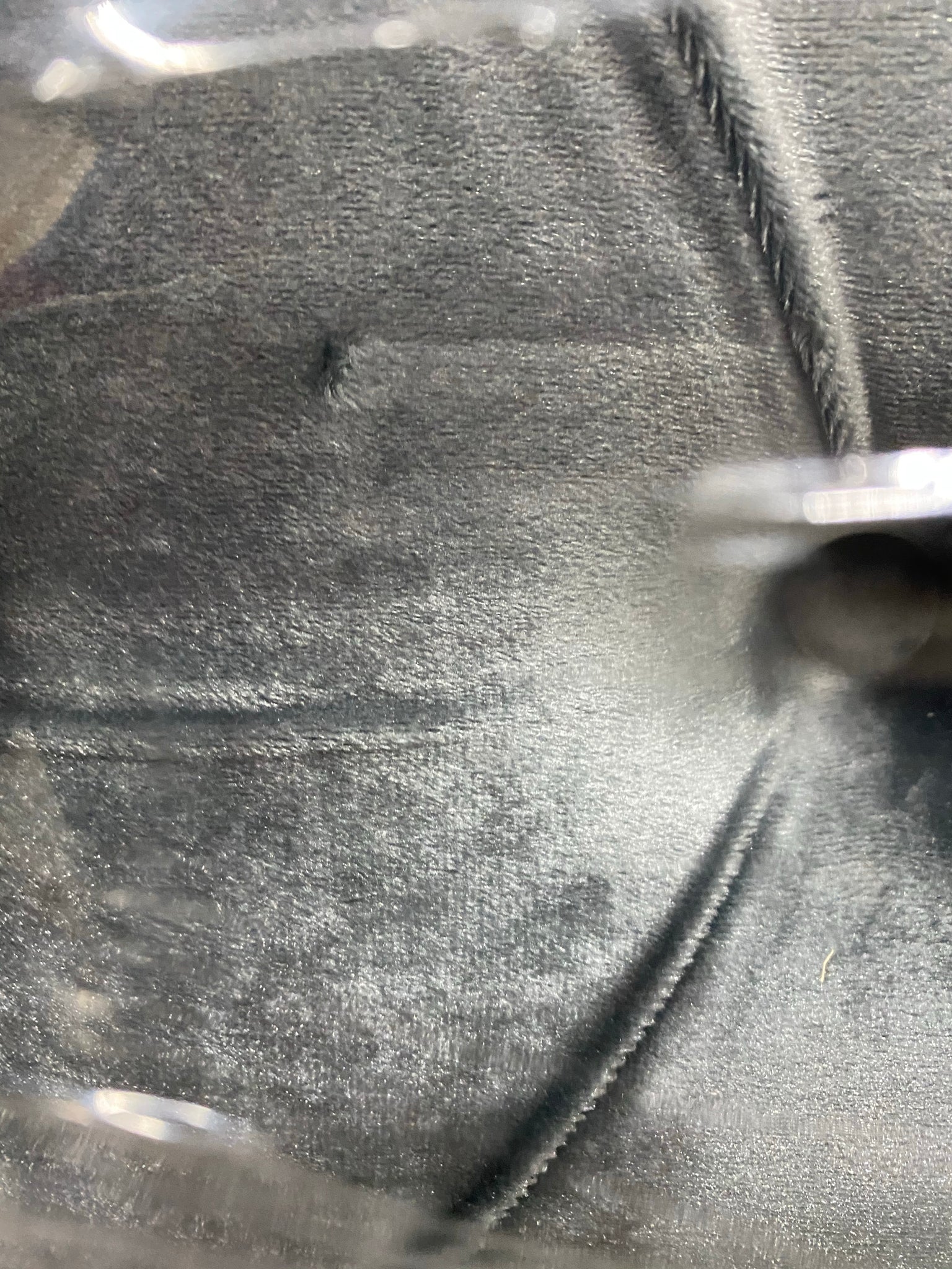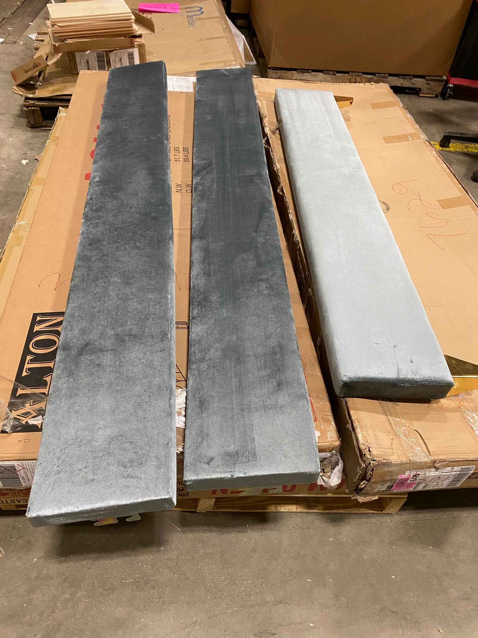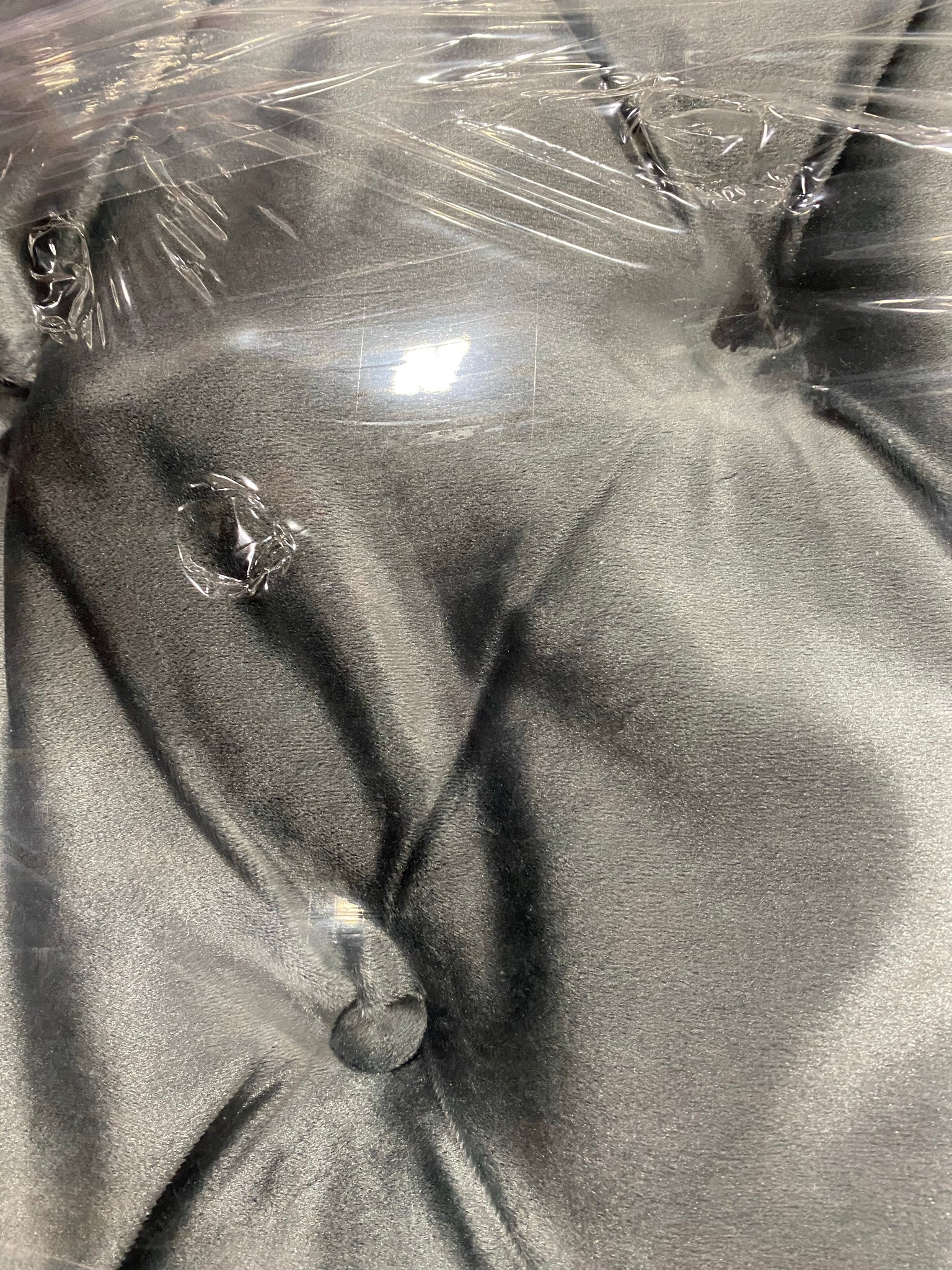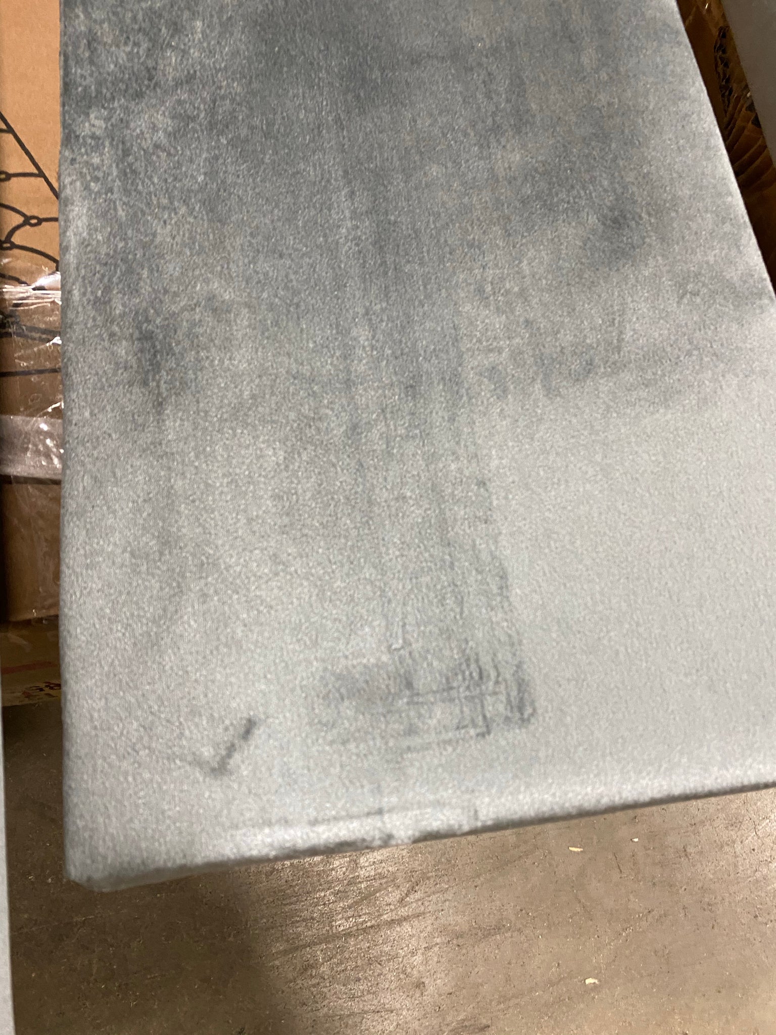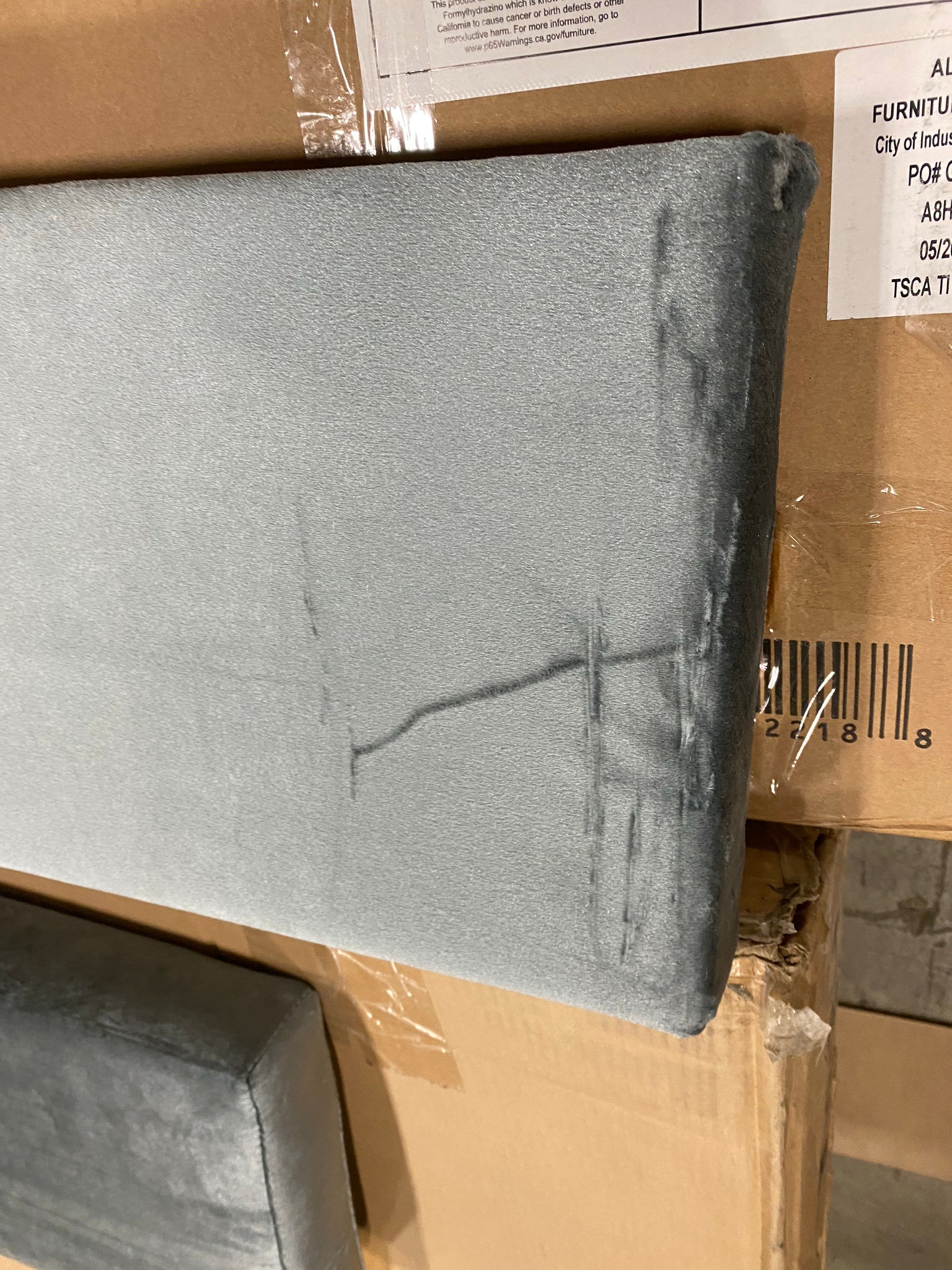 AS IS Condition: Headboard has tears around 3 buttons in the center of headboard. Some imperfections in the velvet on side rails,footboard, and right wing of headboard. See photos. Most hardware attached to bed pieces; may be missing a few screws. Center support and slats missing. Final Sale. Item is nonreturnable/refundable.