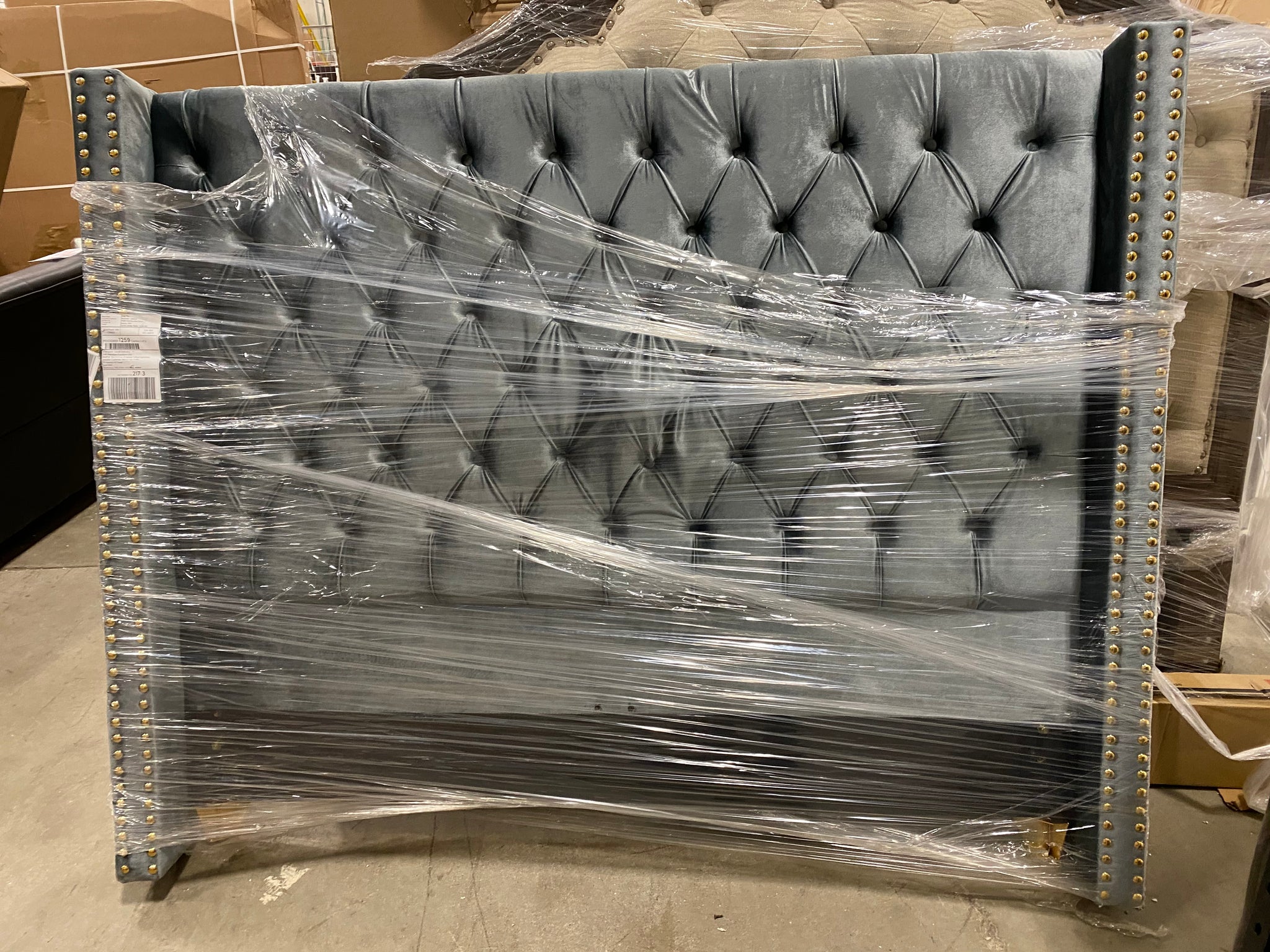 Tufted platform bed in Gray velvet with Gold nailhead trim. Queen size. Assembly required.