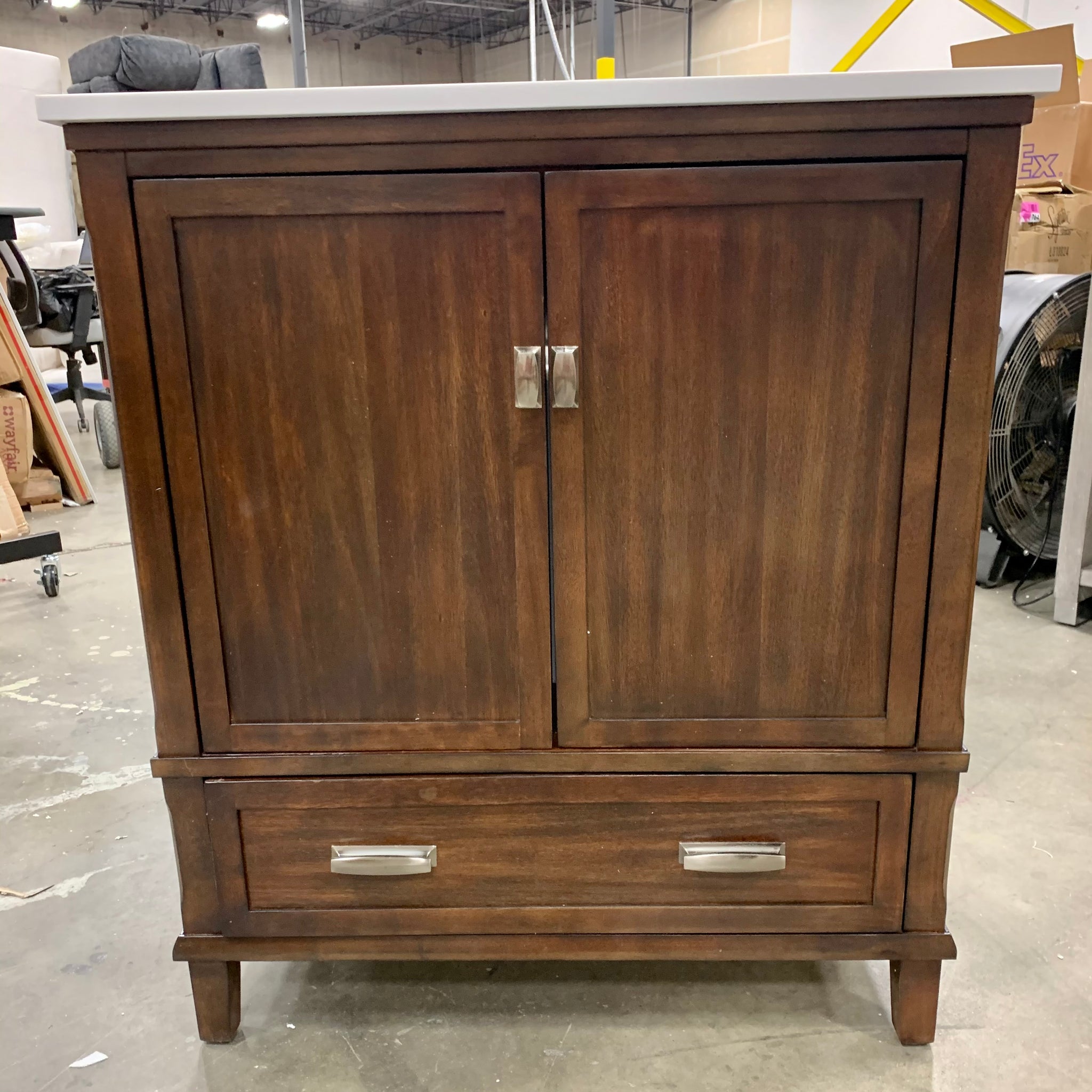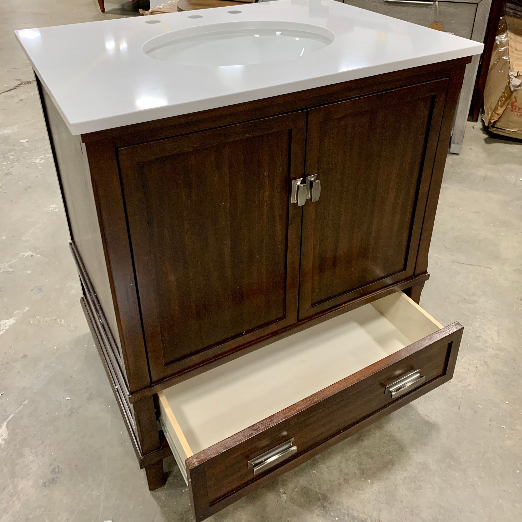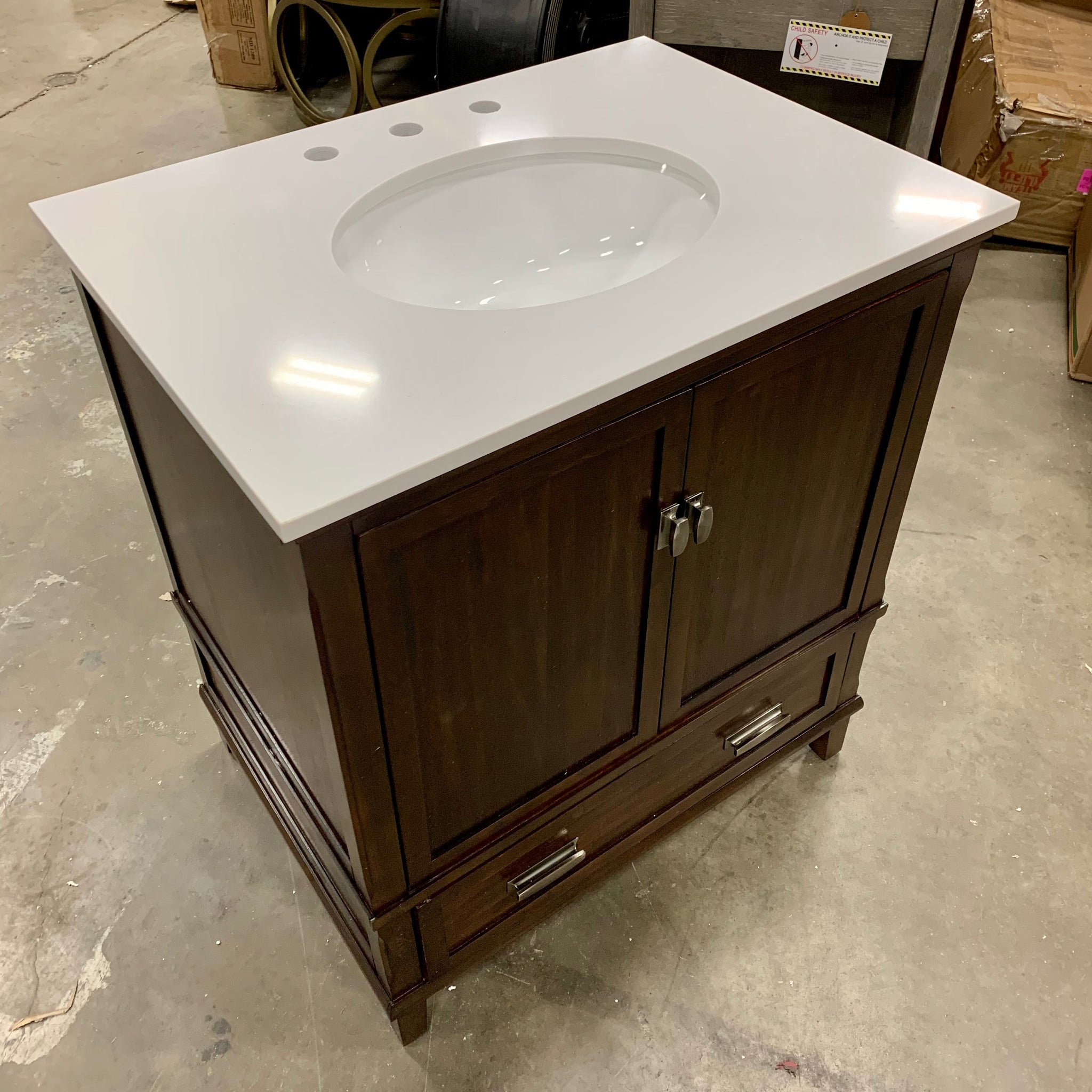 Out of box item. Fully assembled free standing single bathroom vanity set with a base crafted with manufactured wood in a dark walnut finish and a white stone top. This vanity includes the sink, backsplash, and cabinet handles. Faucet not included. The cabinet door hinges are soft close and there is 1 drawer for storage.