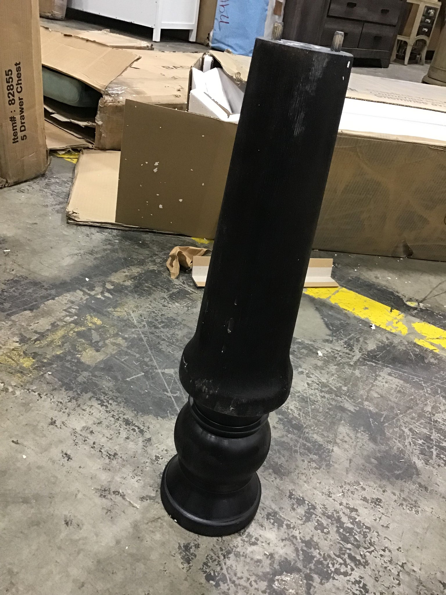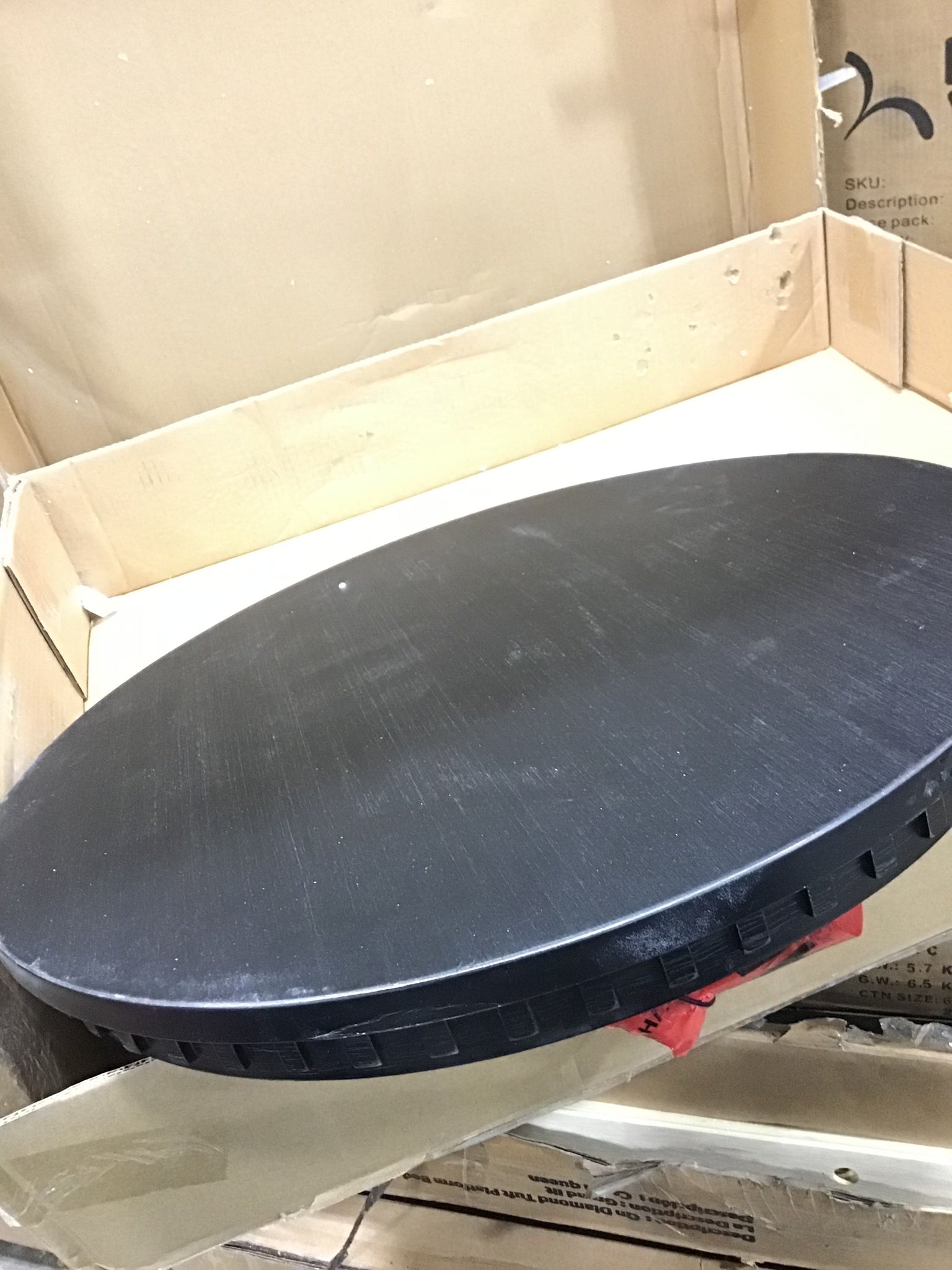 Open Box, The color is black. discoloration on both table top and base. chips/ scratches on all pieces.