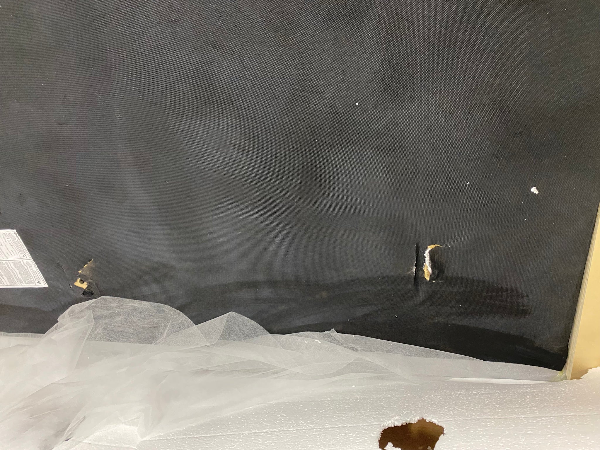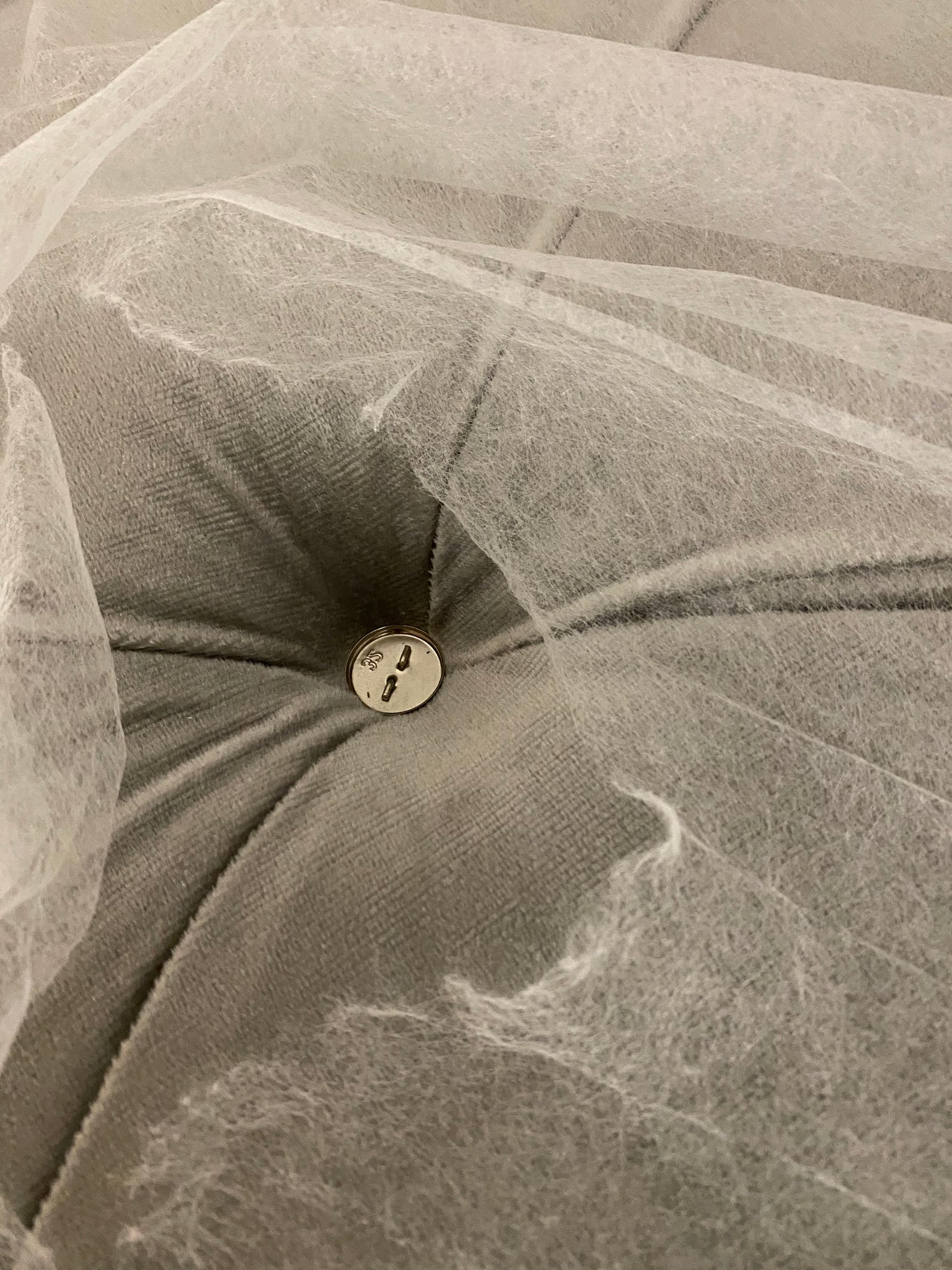 Please note: AS IS condition: Headboard ONLY; bed platform NOT included. Missing 1 button cover on tufting. See photo. Item in otherwise good condition. Item should attach to any universal bedframe. No screws included. Item has 2 small tears on backing fabric of headboard.