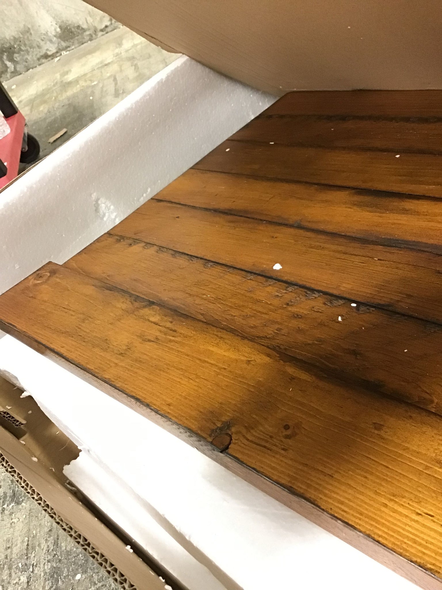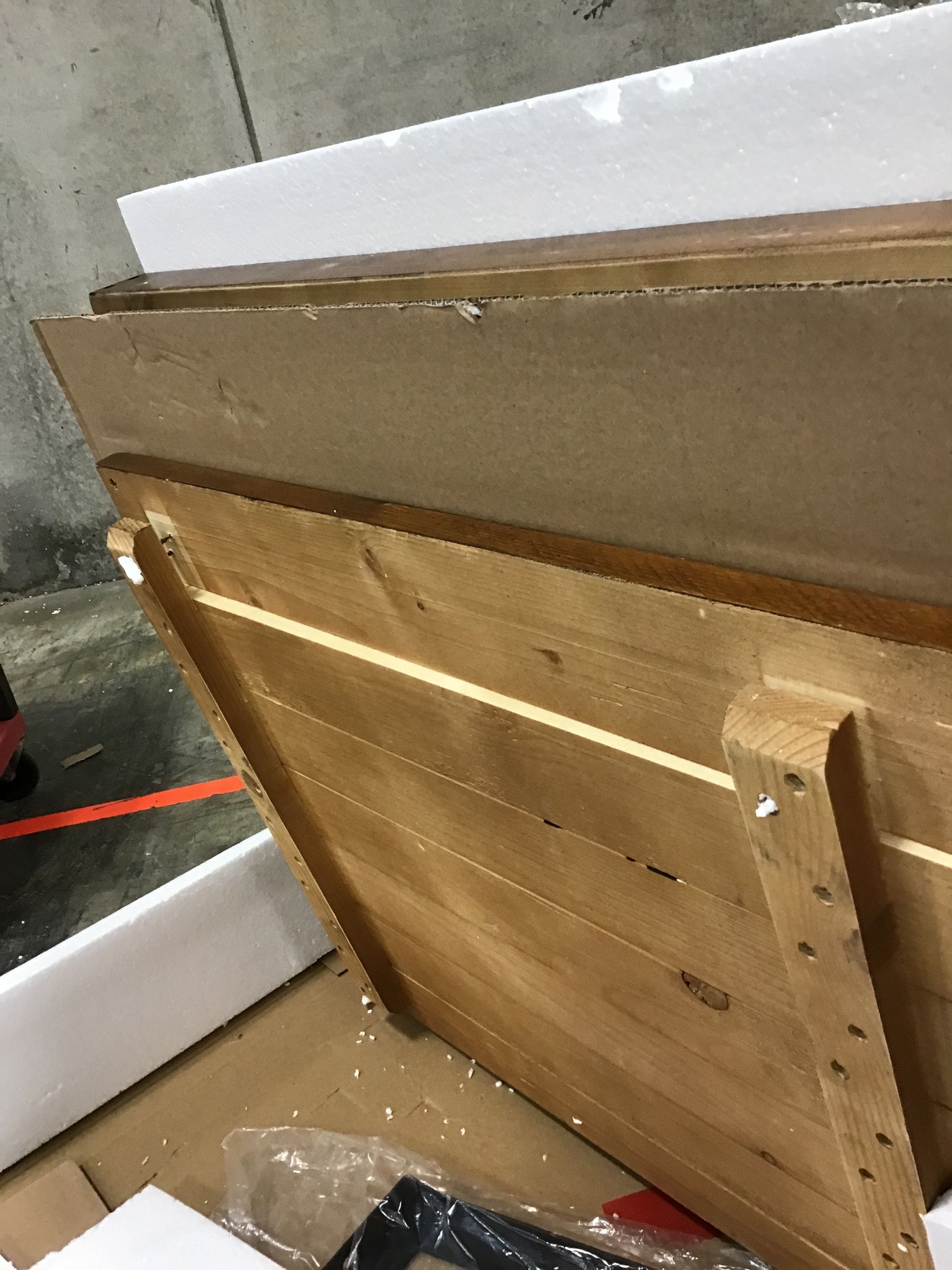 Open box, The color is natural brown pine, AS IS: There is a board loose on the top piece of wood. Just needs to be rescrewed back in . See DB for photos. Previously opened with no hardware.