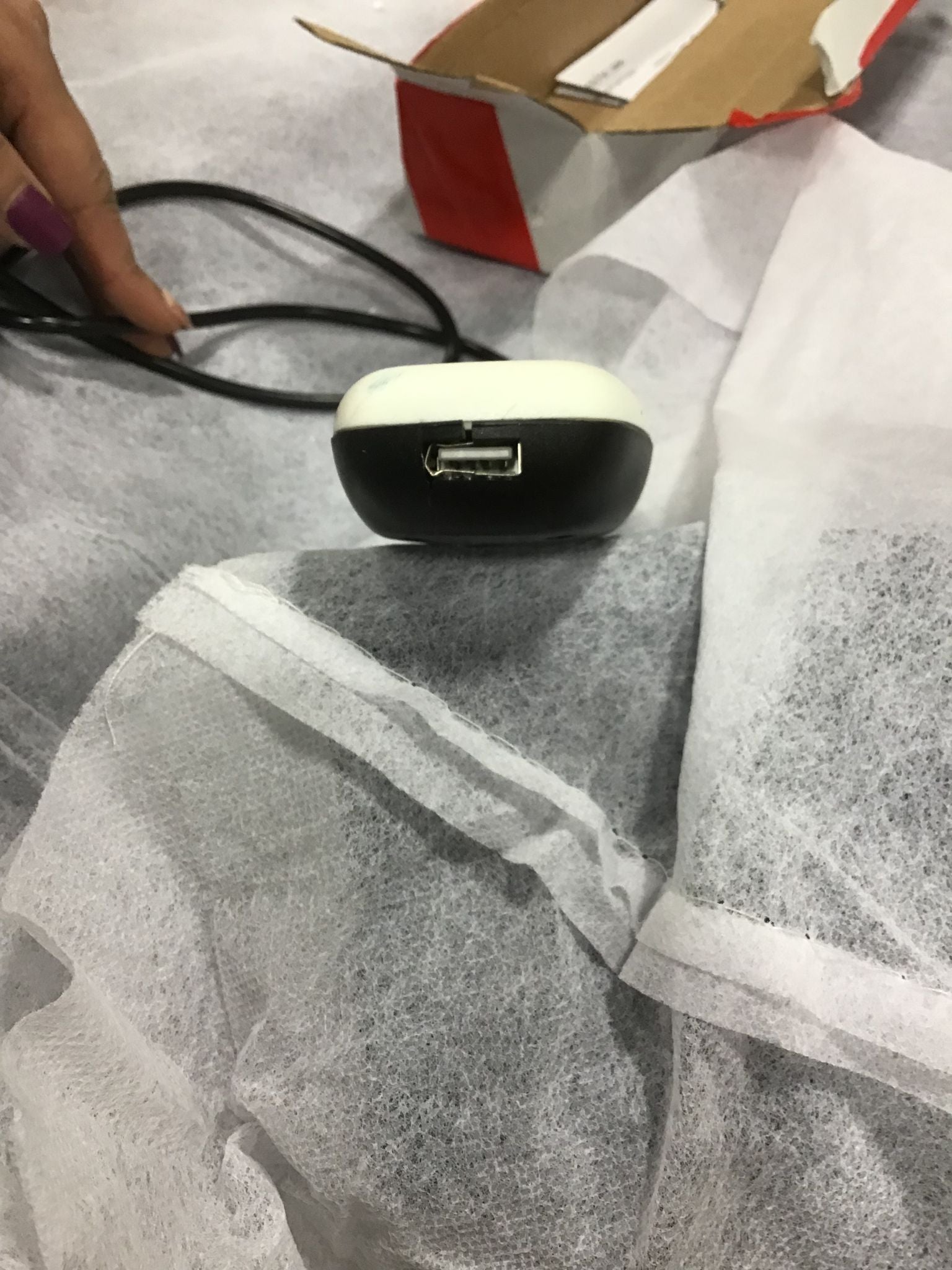 Open box, The color is blue faux leather, USB port slightly bent. See photo.