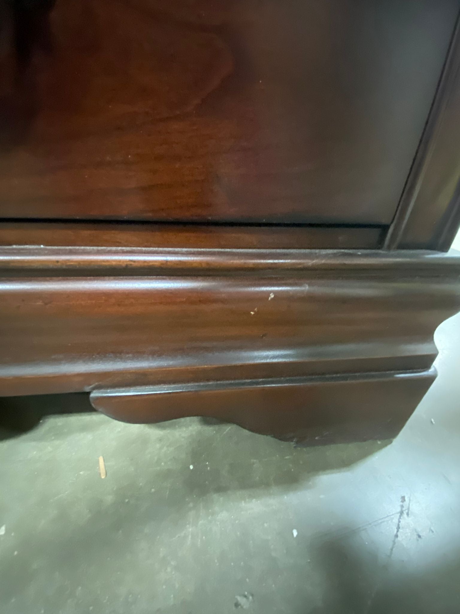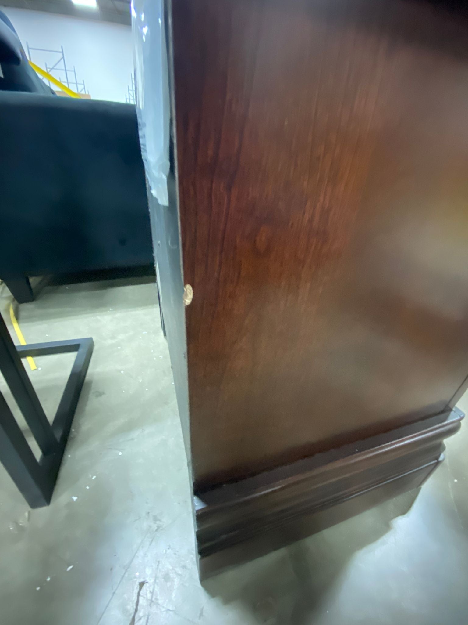 Out of box, Please Note: Item has small dings of bottom front edge of nighstand. Ding on back edge of side panel. See photos. Item in otherwise good condition.