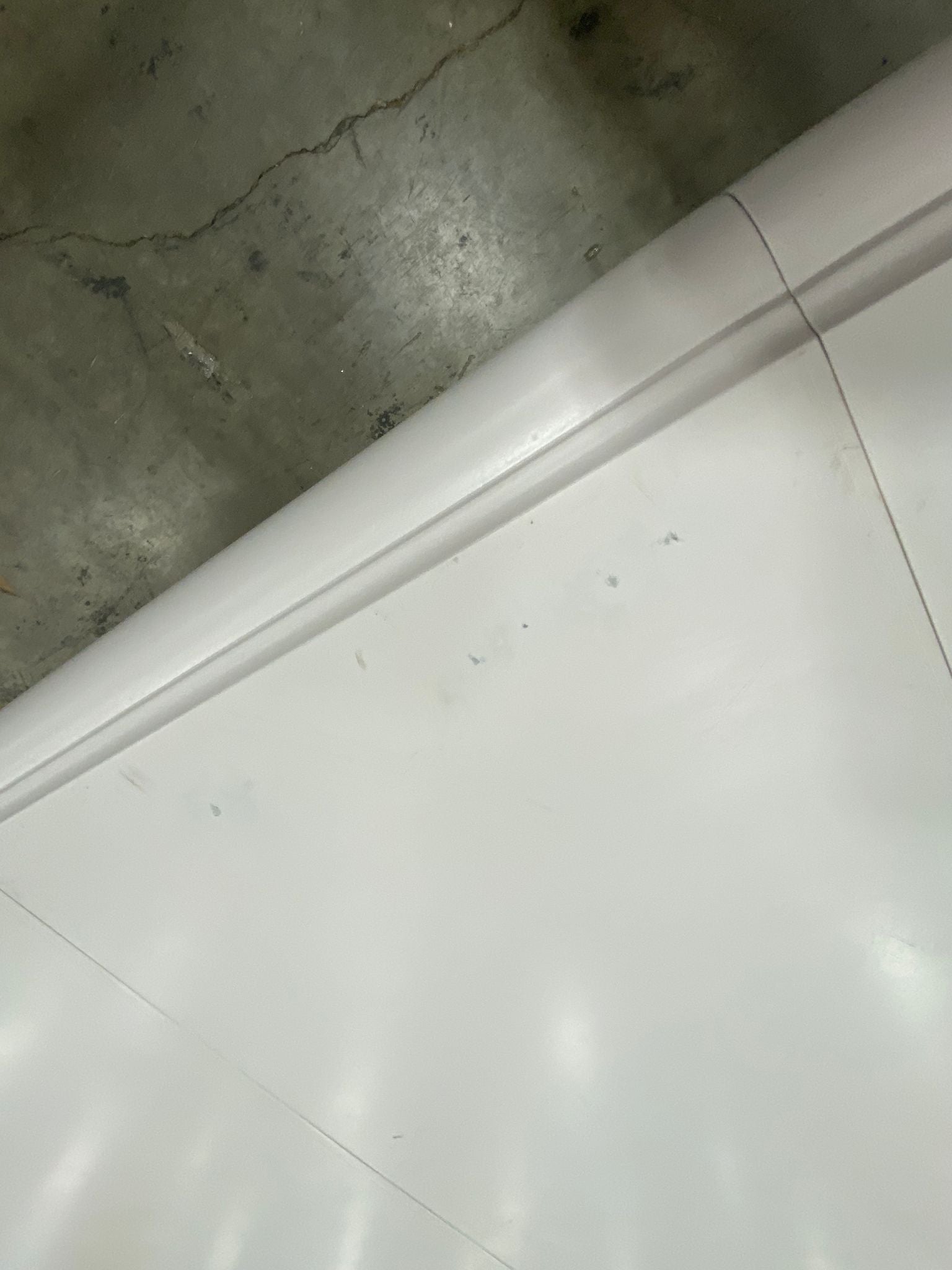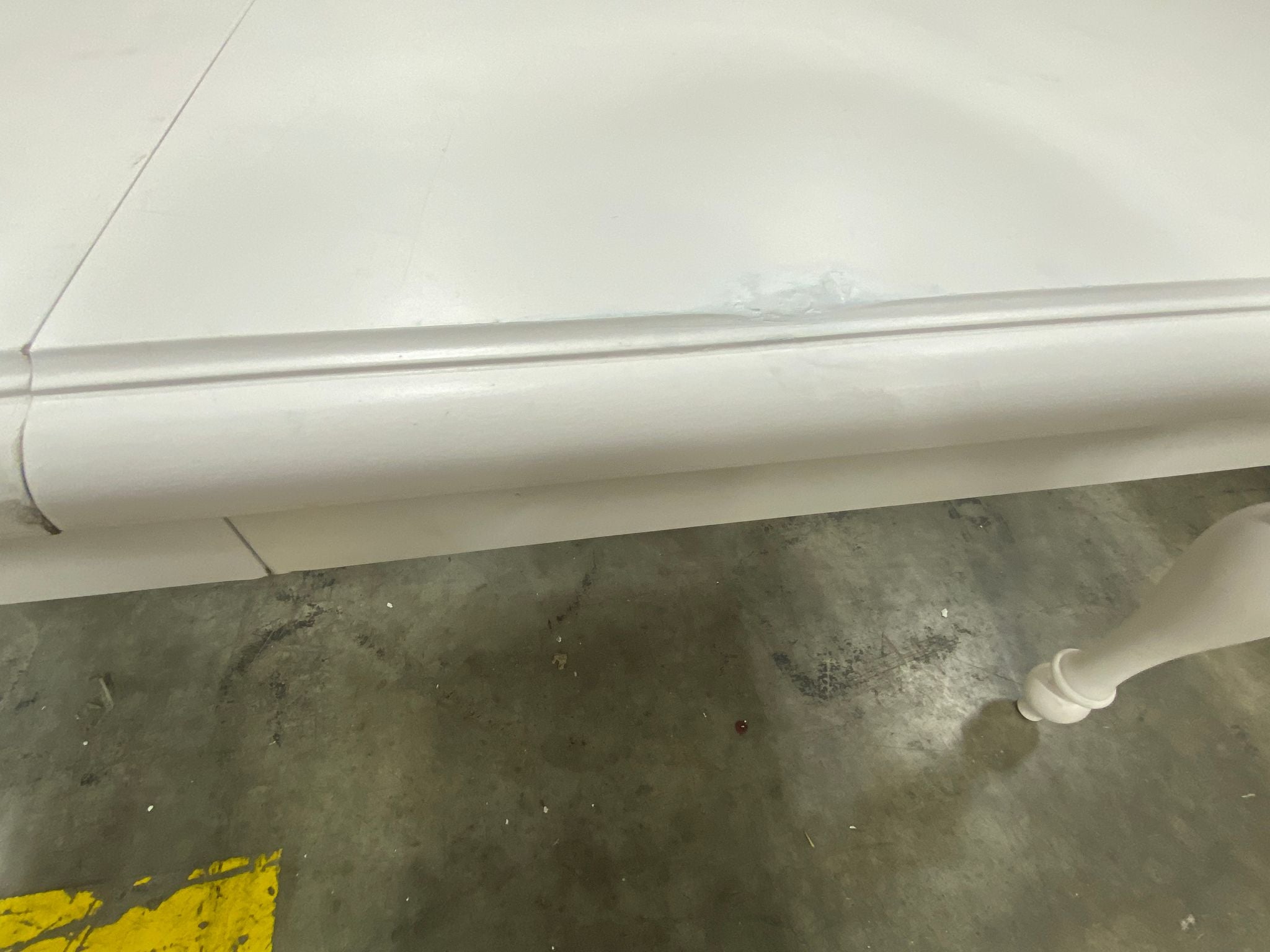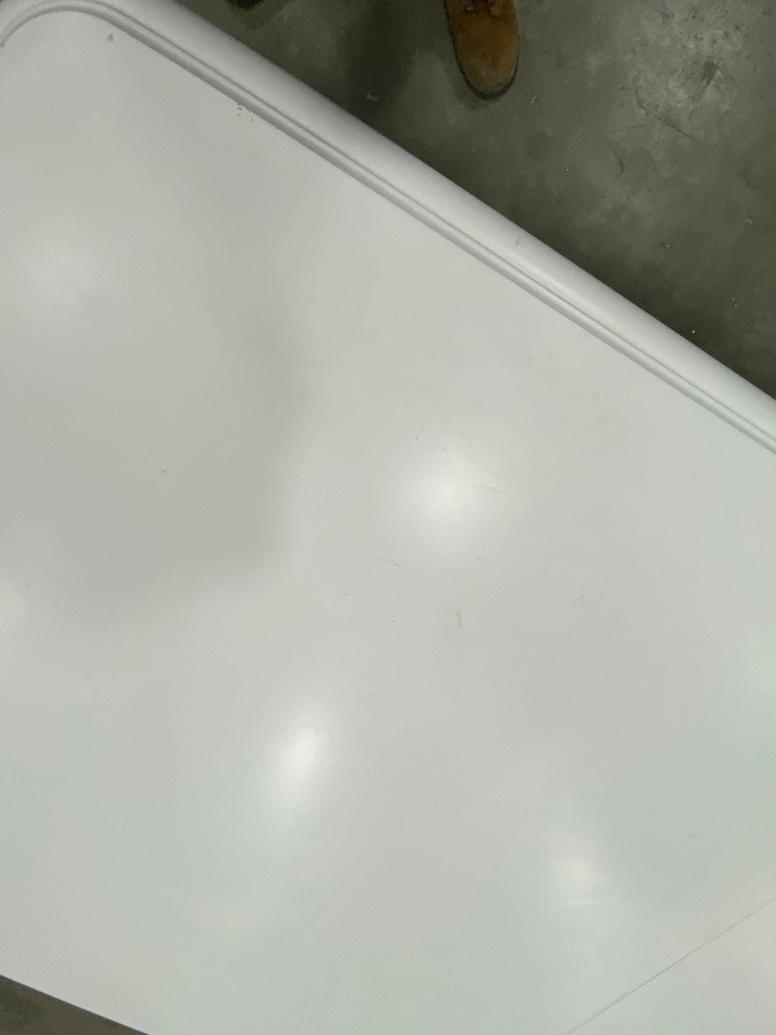 Open box, The color is oyster white, AS IS Condition: Item has scuffing/scratches/marks on table top due open shipment. Some slight sticker residue on under ledge on one side. Some chipped areas have been paint touched up. See photos. Cosmetic issues ONLY. Item in otherwise good condition.