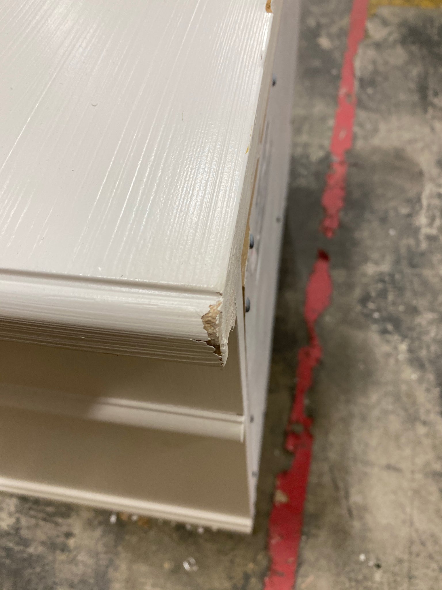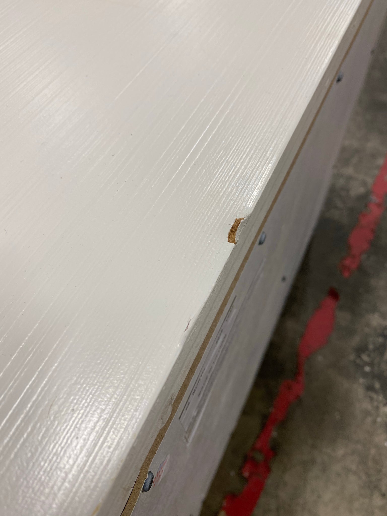Please Note: Item has slight discoloration line on top of nightstand; slight ding damage on all corners of nightstand top due to shipment. See photos.