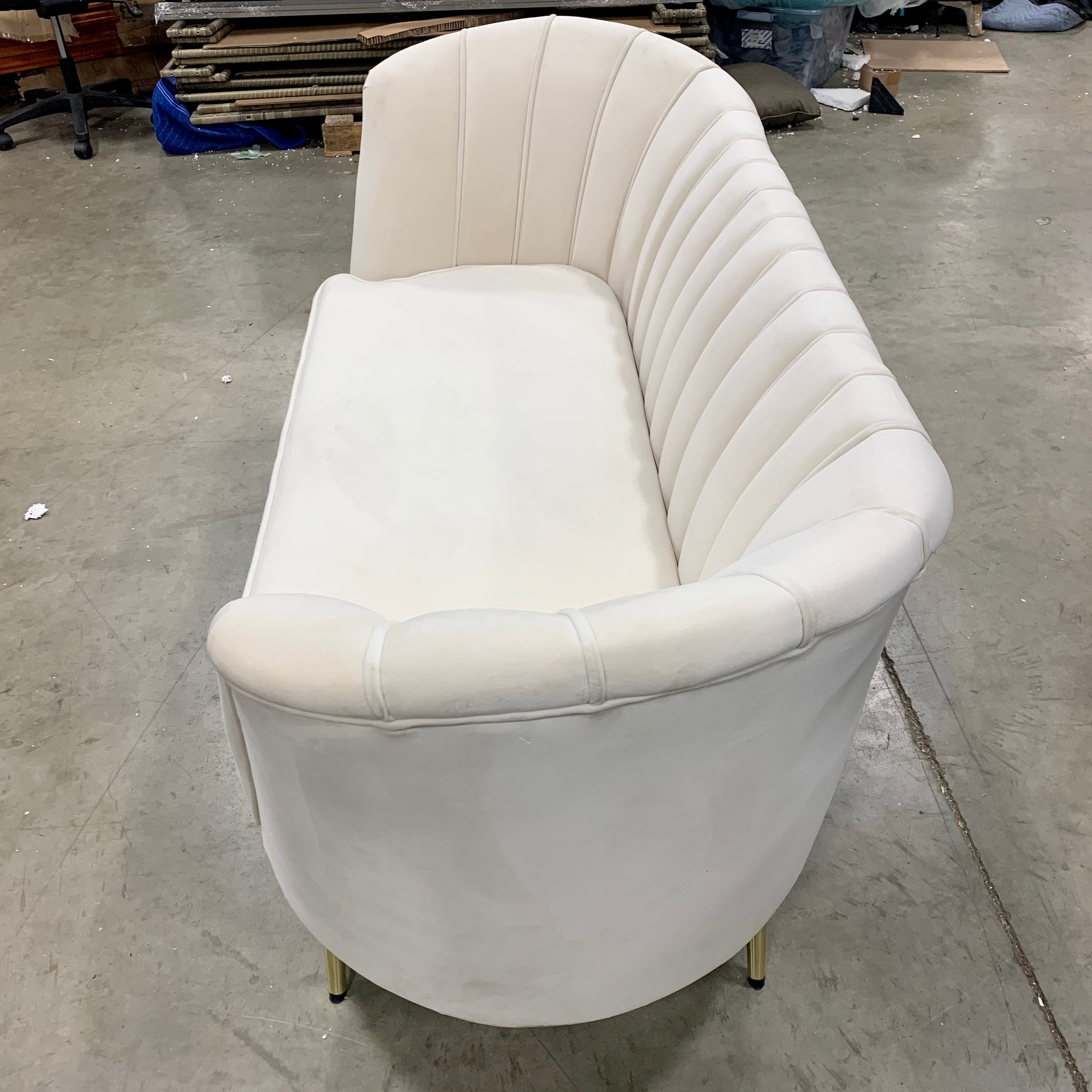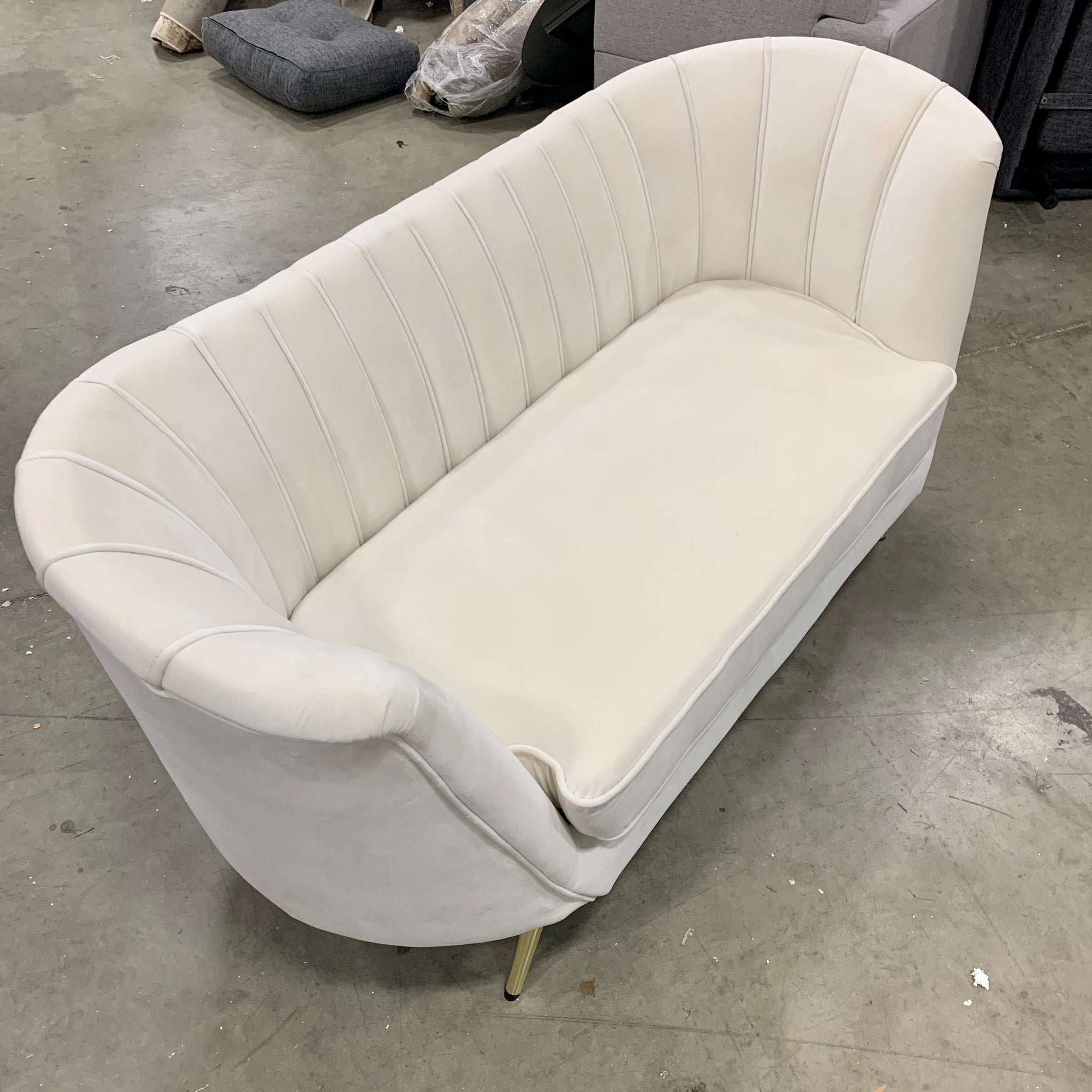Fully assembled round arm loveseat upholstered in cream colored velvet with a solid wood frame and metal legs in a gold finish. Item appears to be in excellent condition.