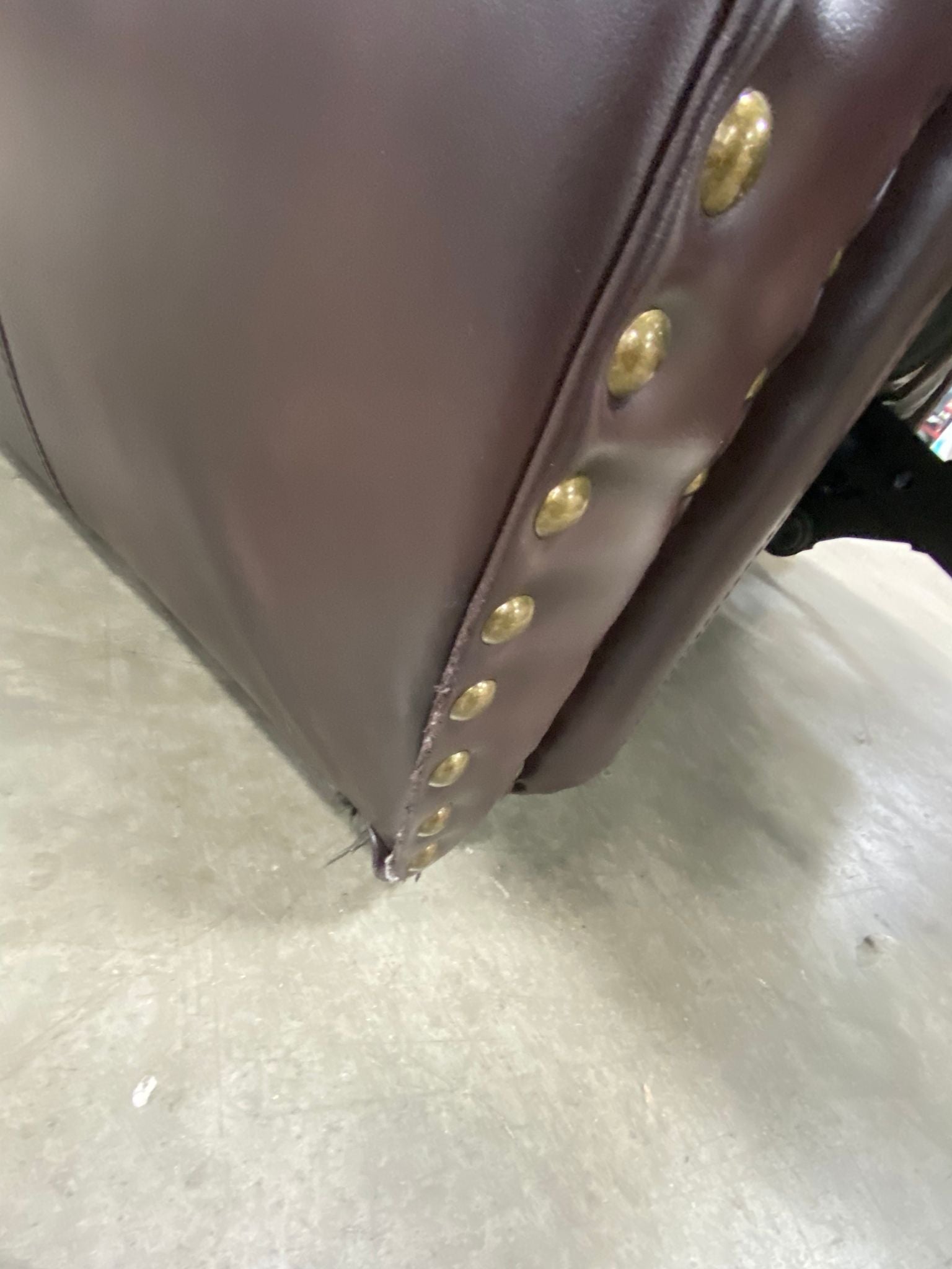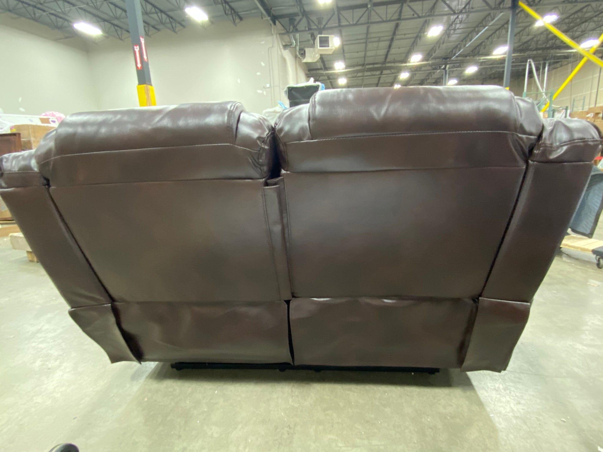 Out of box, The color is brown, AS IS Condition: Loveseat ONLY; Sofa NOT included. Item has some slight scuffing on bottom outer edge of right arm. See photo. Item in otherwise good condition.