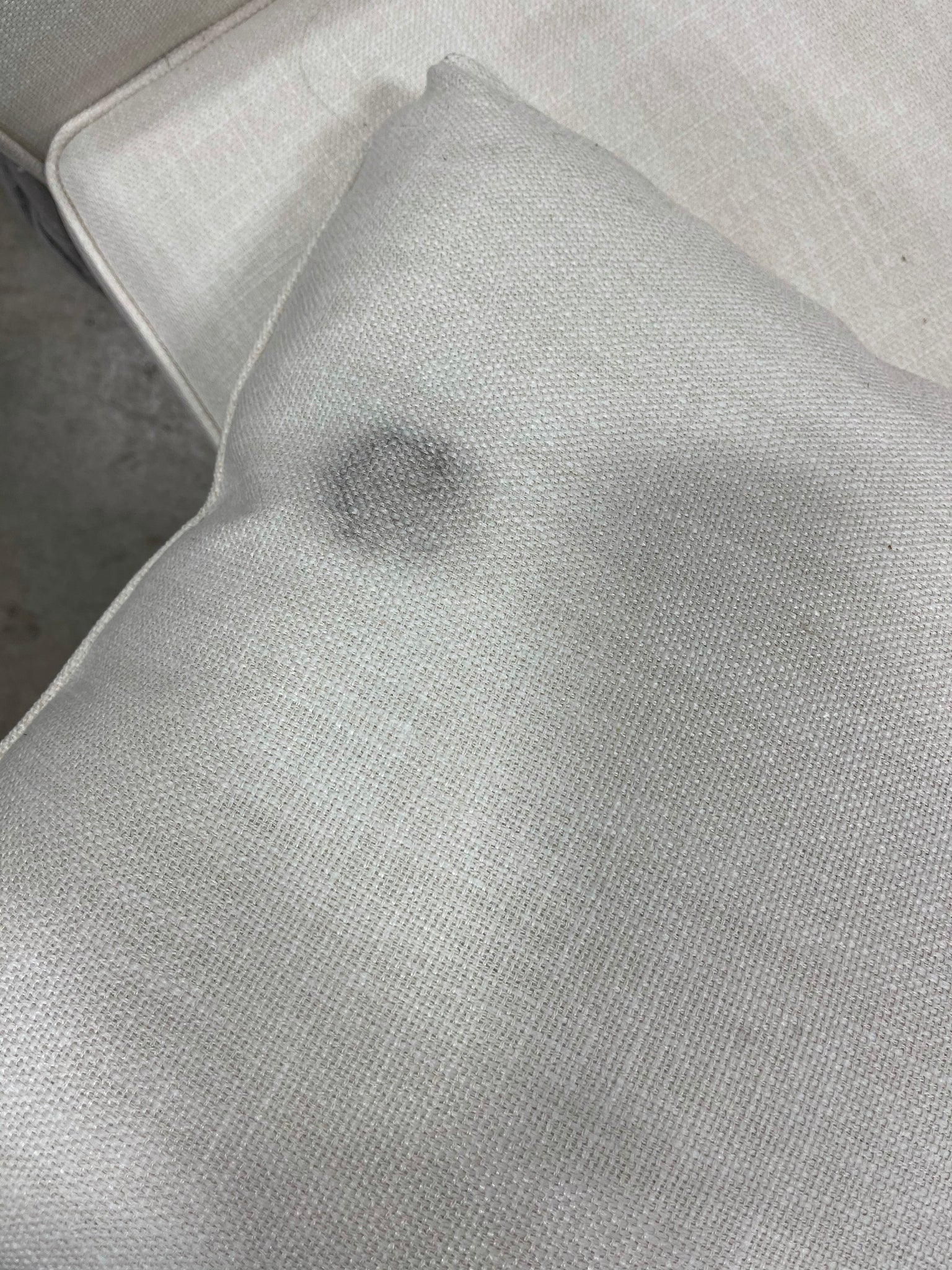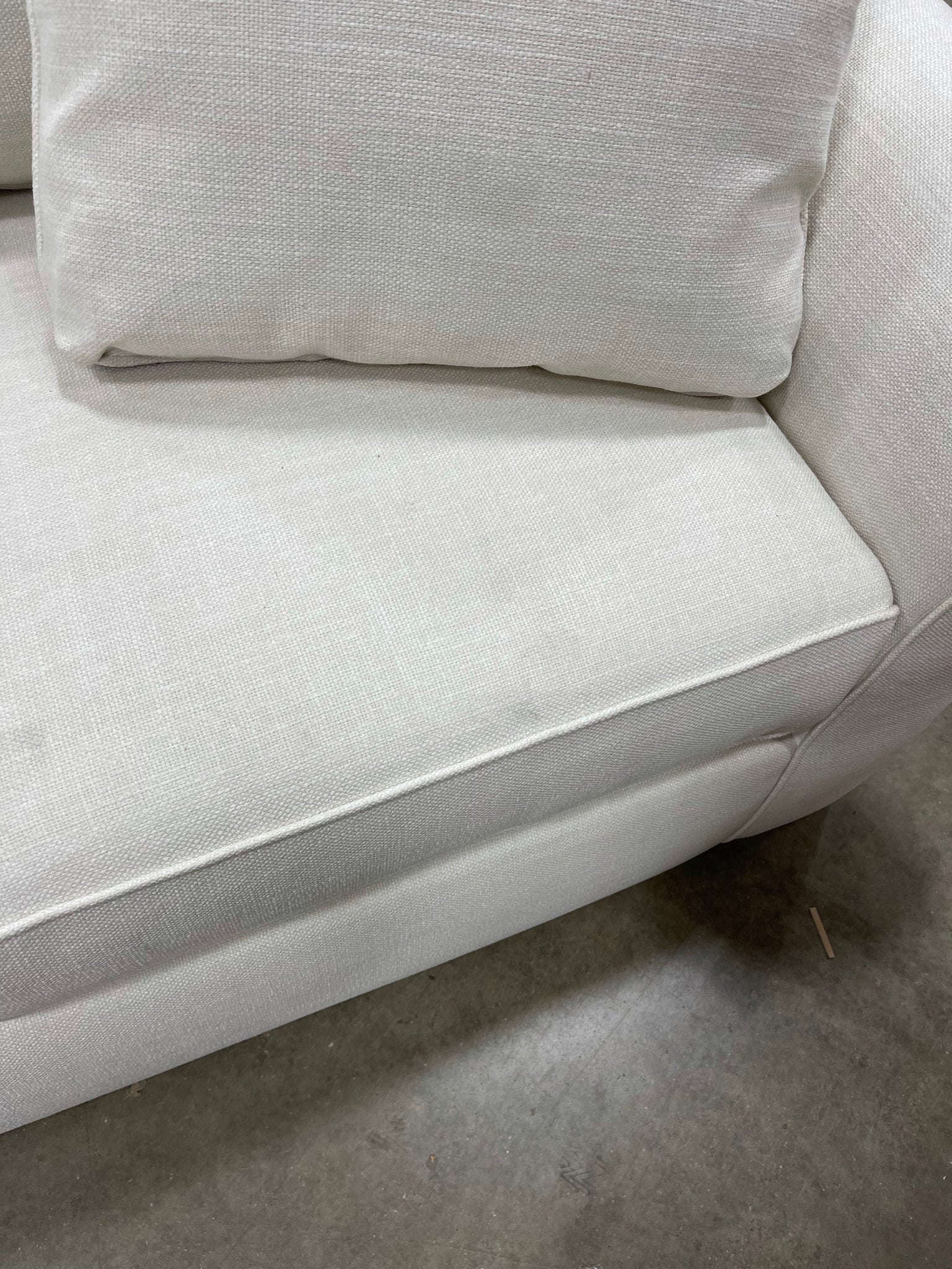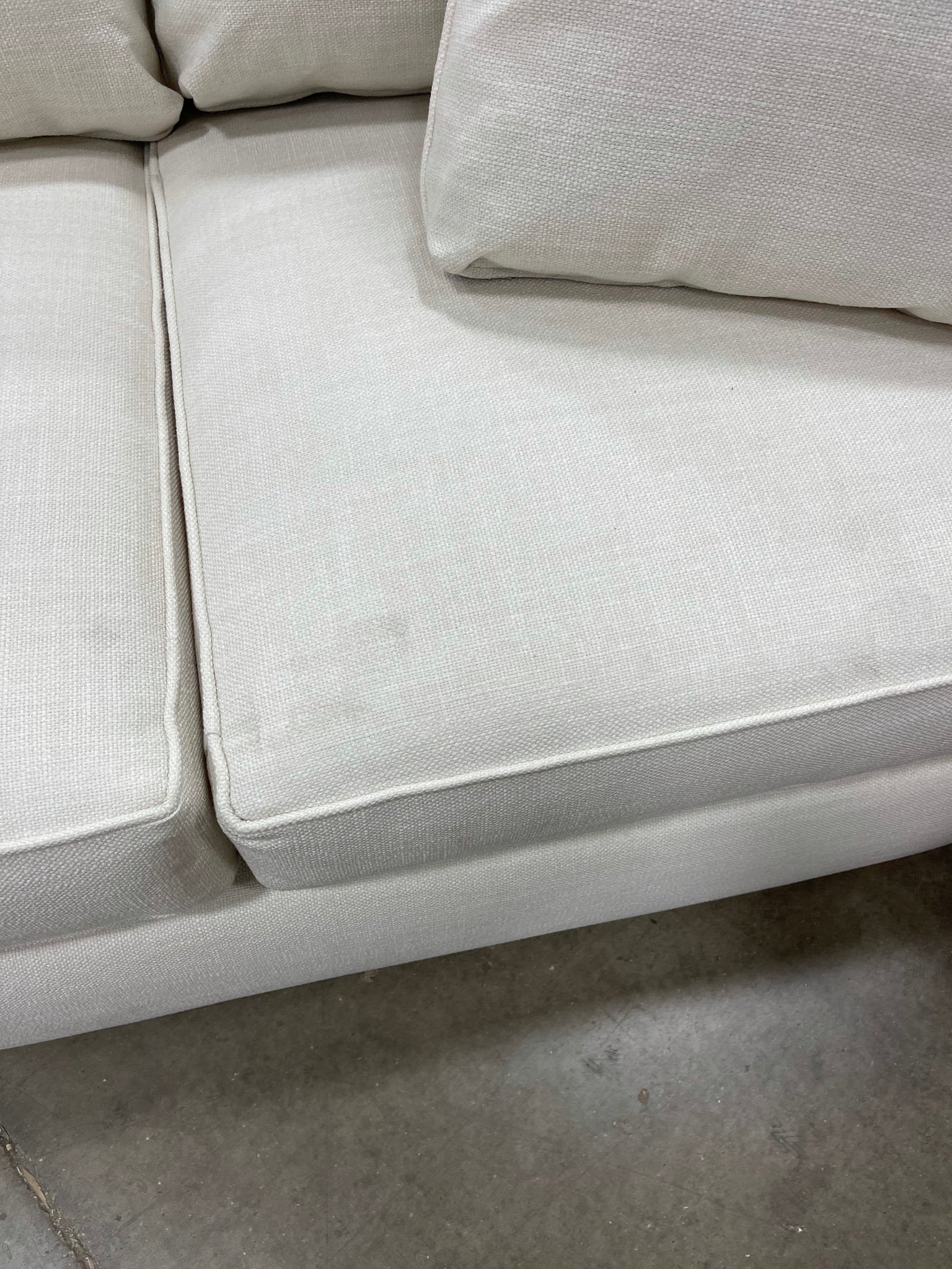 Not in Box - Sealed in Plastic Wrap, The color is Conversation Linen. Sofa does have a couple of spots of warehouse dirt that would need to be cleaned (See pictures)