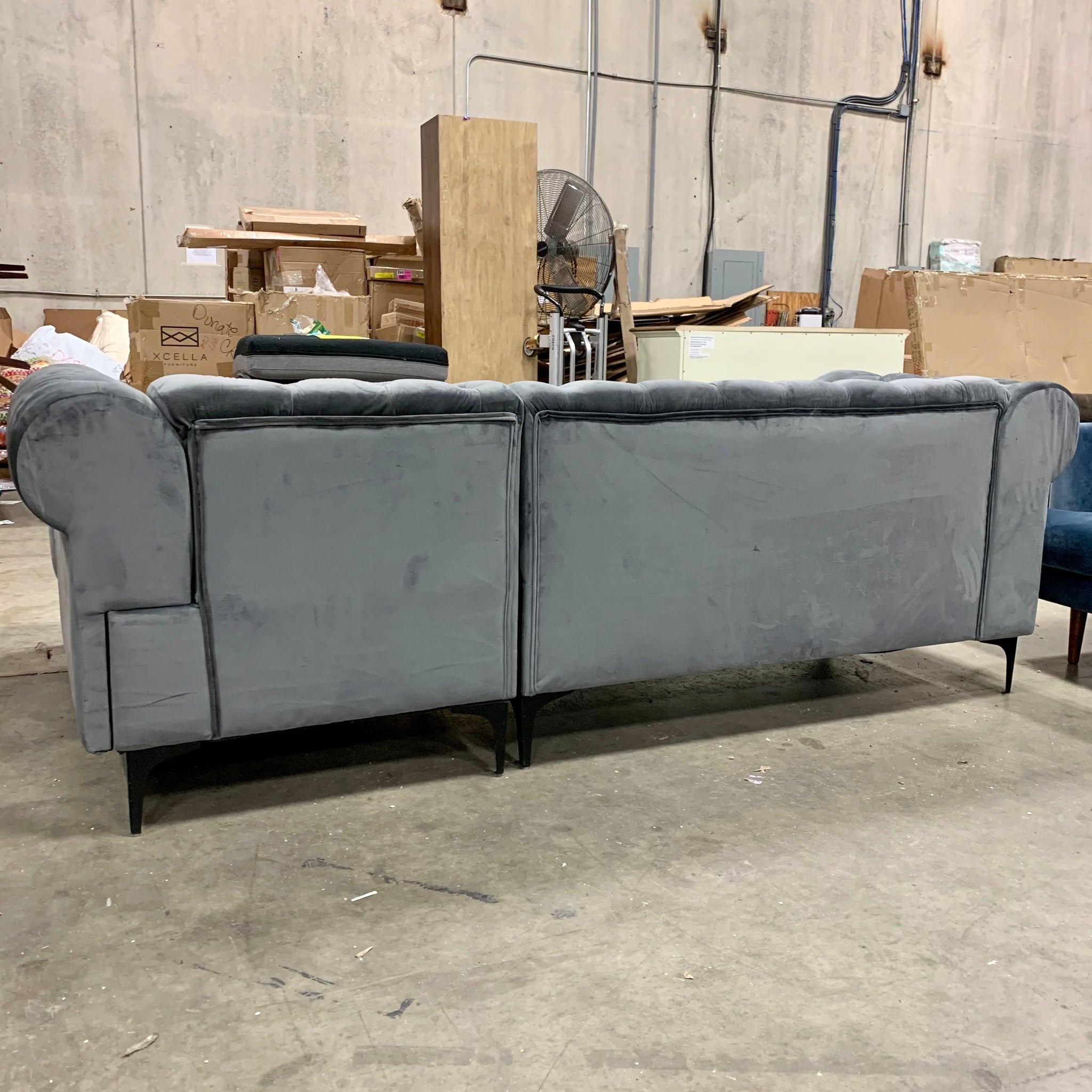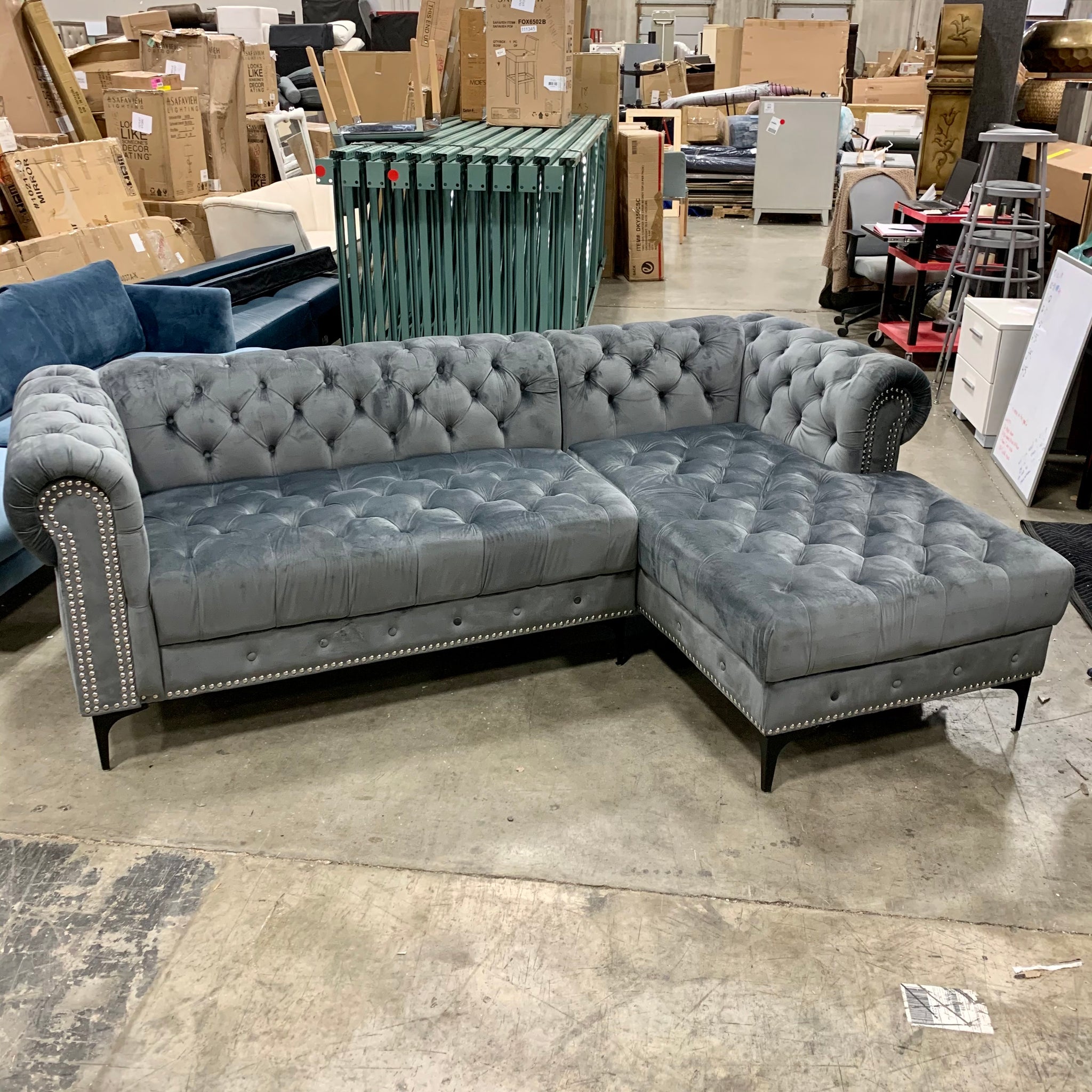 Fully assembled right hand facing sofa and chaise upholstered in gray velvet, featuring tufting and a silver nailhead trim. Item did not come with original feet, so we added black metal feet to the item. Toss pillows are not included. The item appears to be in great condition.