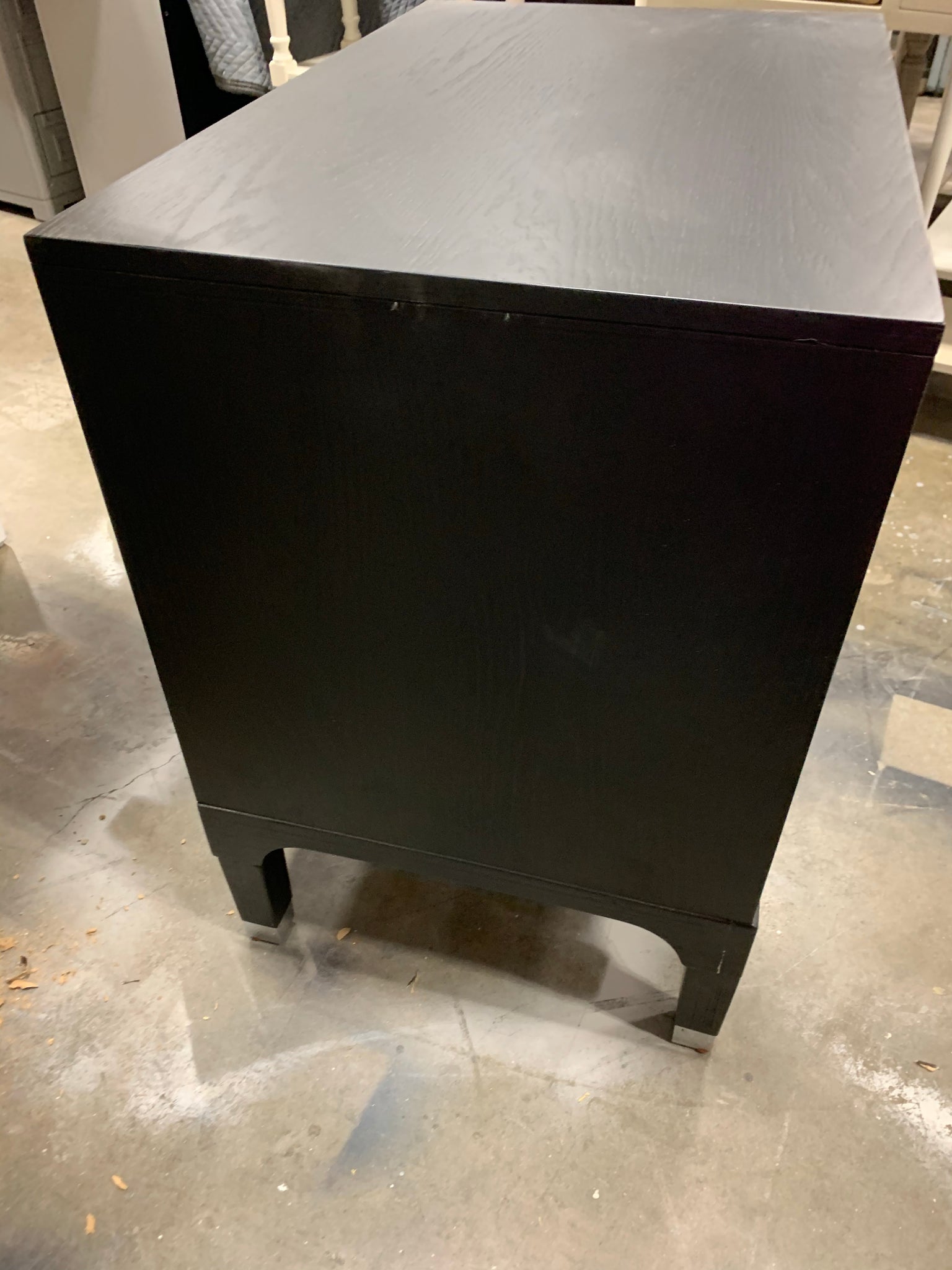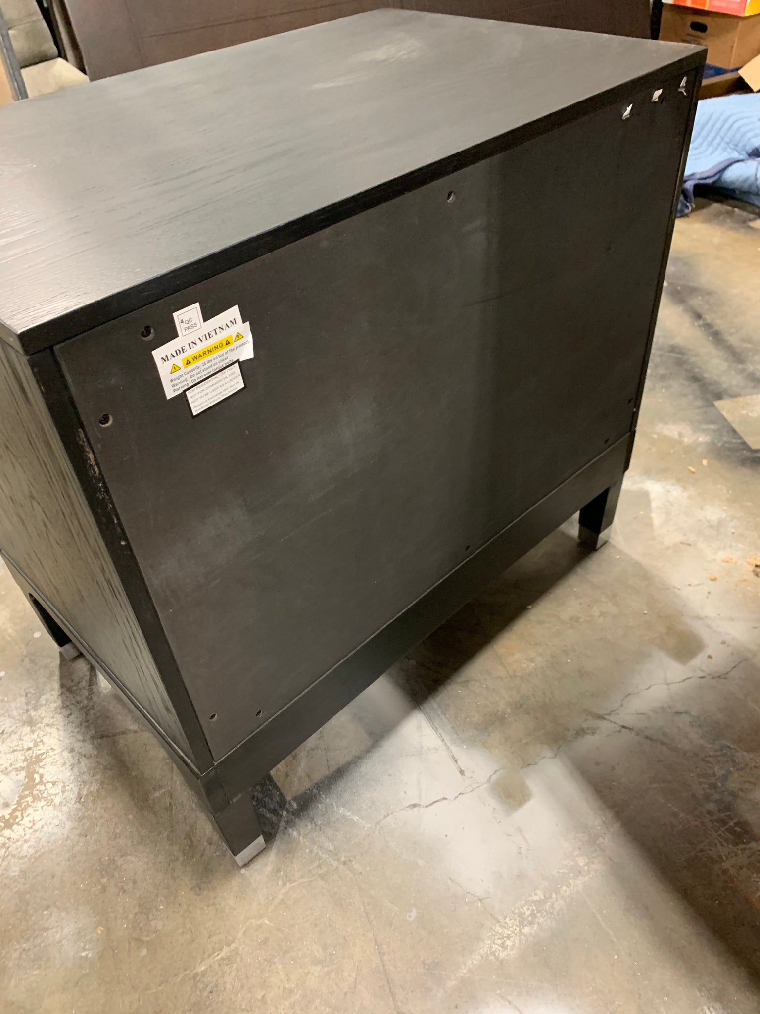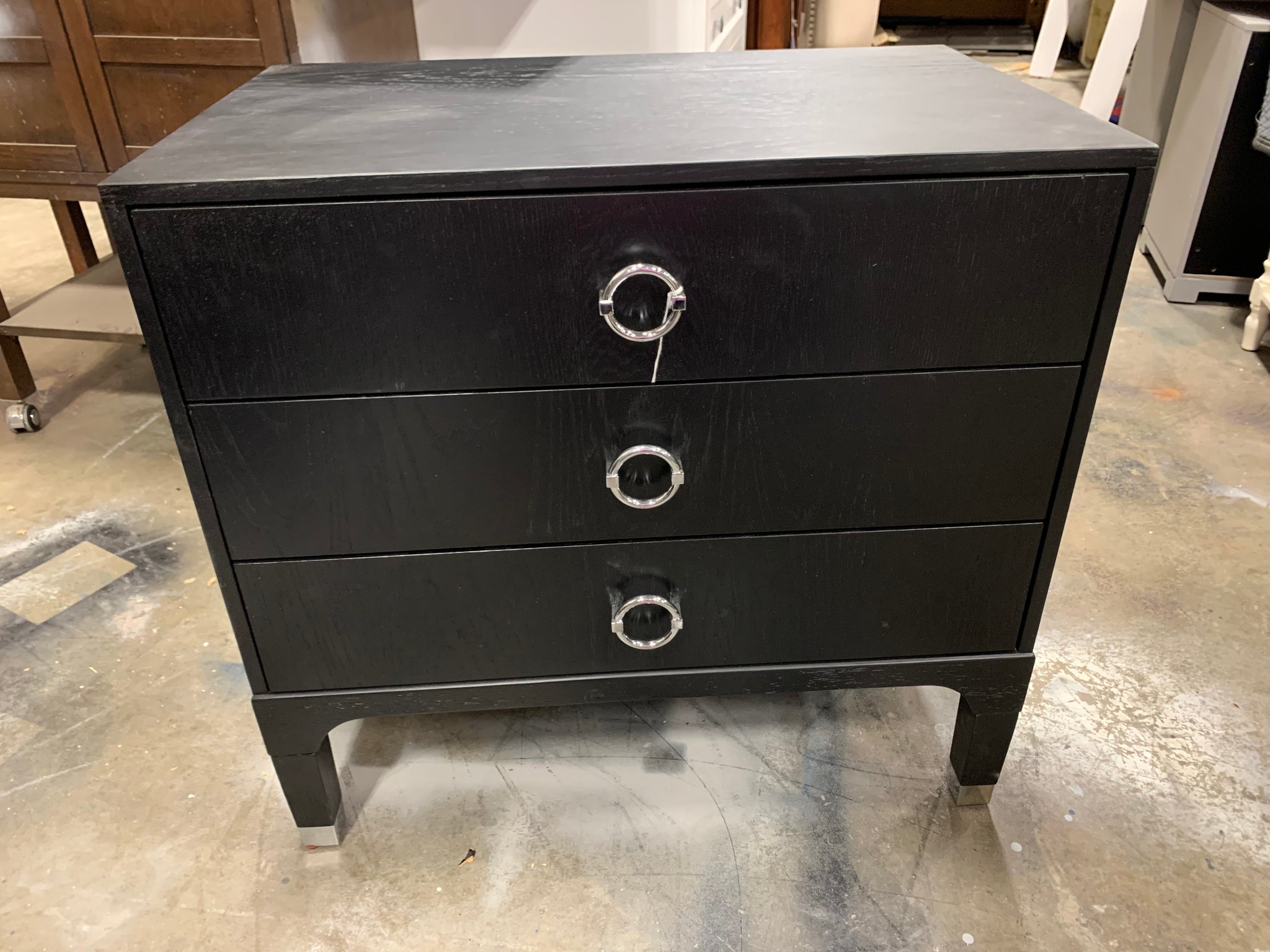 Fully assembled 3 drawer nightstand made of wood in a black finish. Item has a minor cosmetic blemish (see photos for reference) but is otherwise in great condition.
