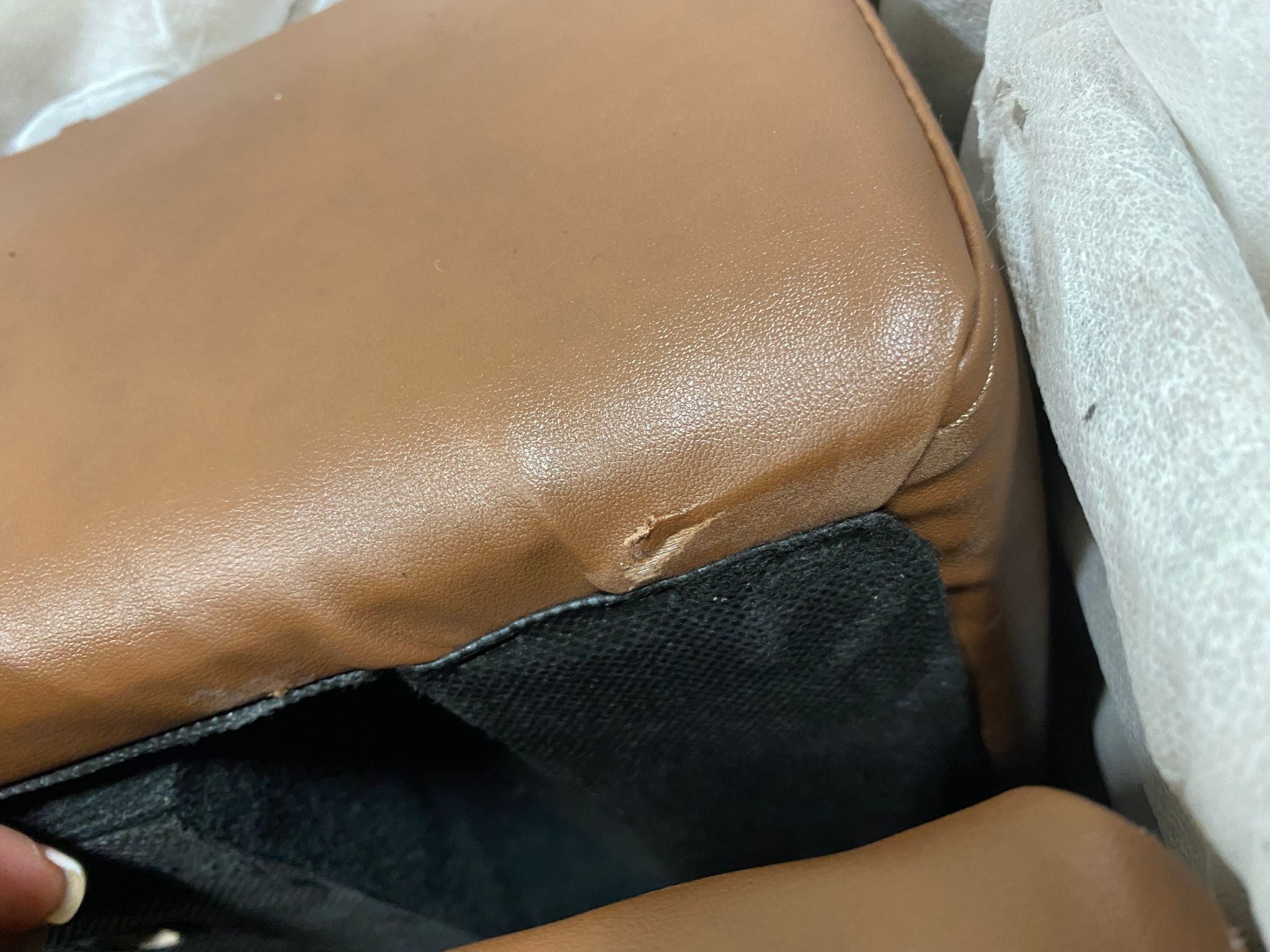 Open Box, The color is brown, AS IS Condition: Item has small tears on outside edges of seats and inner corners of back rest. See photos.