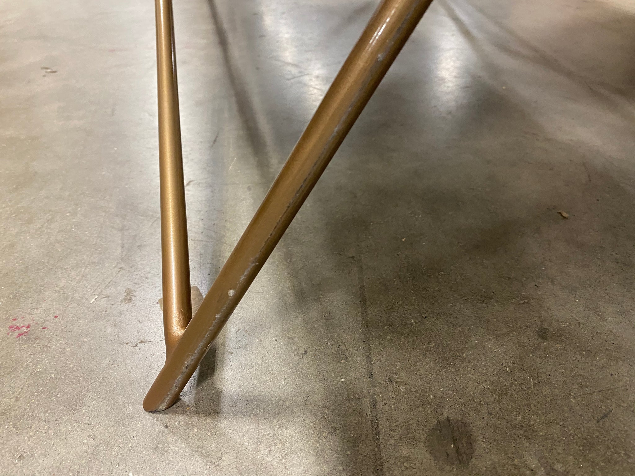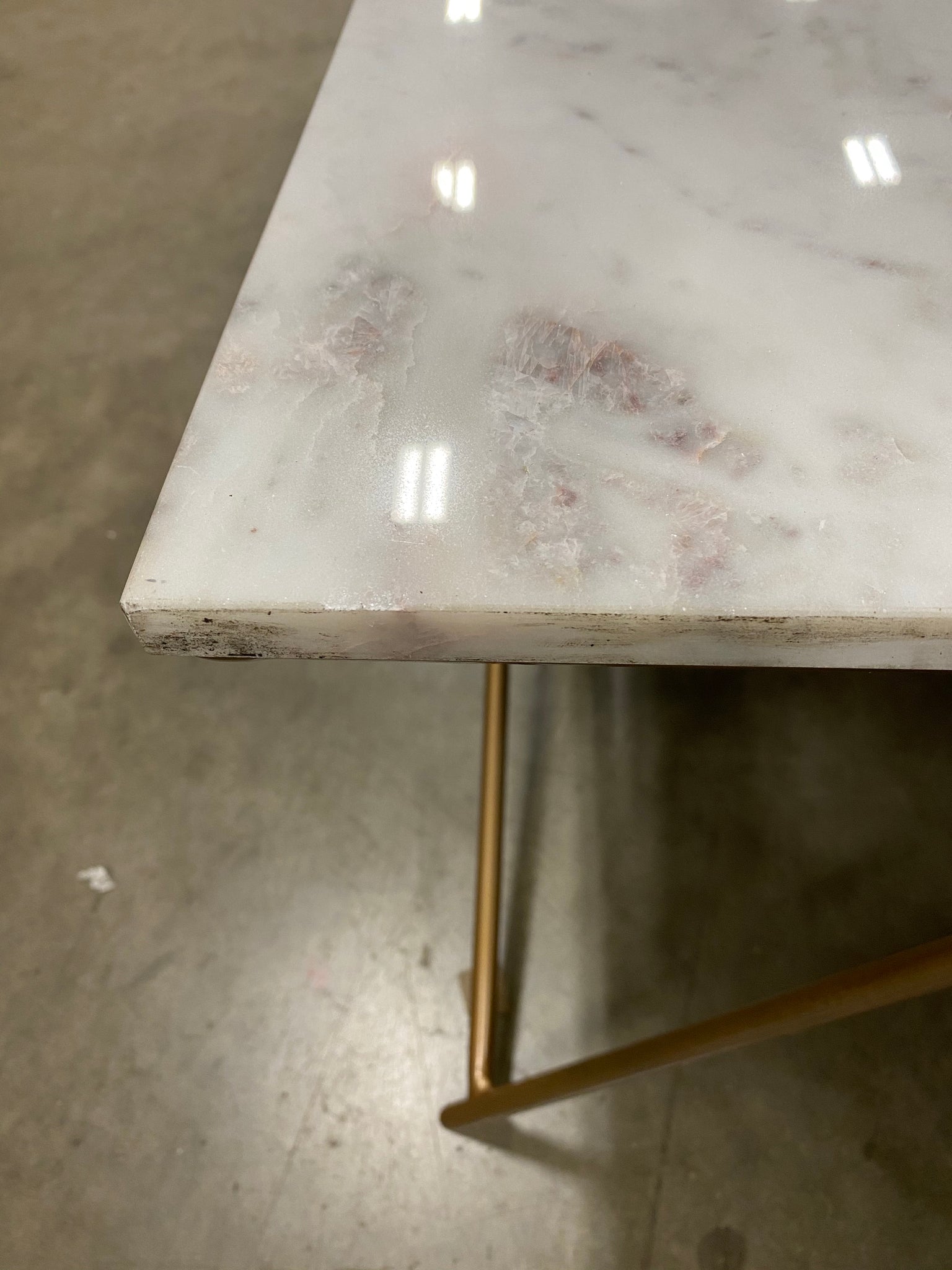 AS IS Condition- Marble top scuffed/slightly chipped on edges/corners due to shipment; metal base has some scuffs along sides due to shipment. Item is in otherwise good condition. See photos.