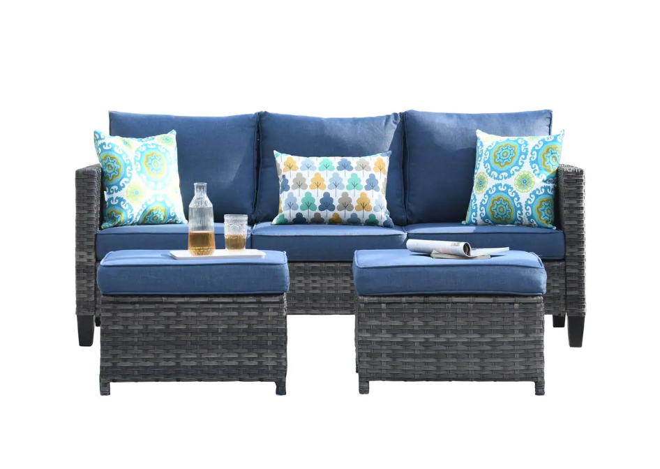 Open Box, The color is grey/navy blue, The color of this bundle is actually grey rattan with navy blue cushions NOT red. The throw pillows are a blue floral as well. See photos of true colors. ONLY Loveseat / 2 ottomans