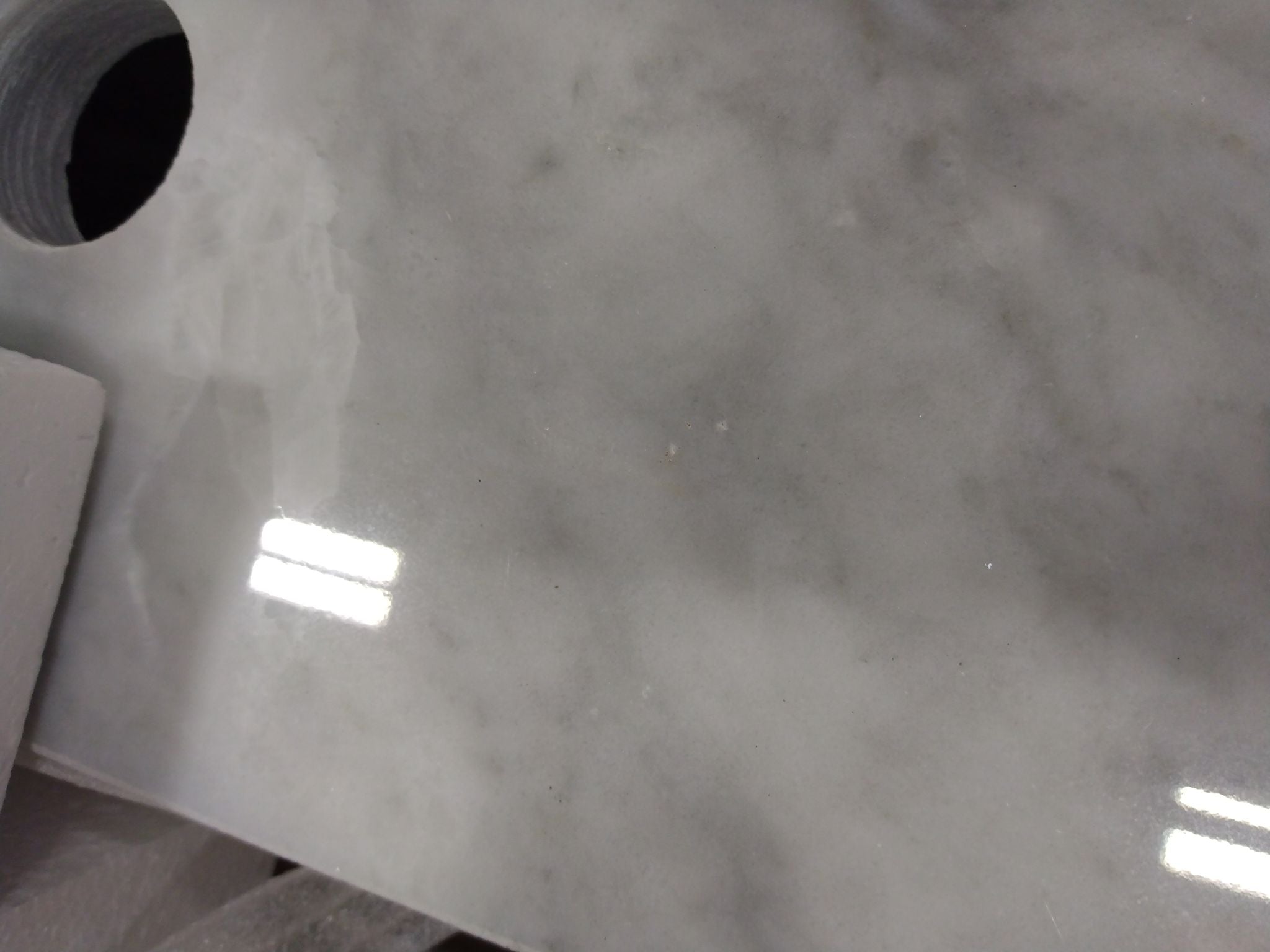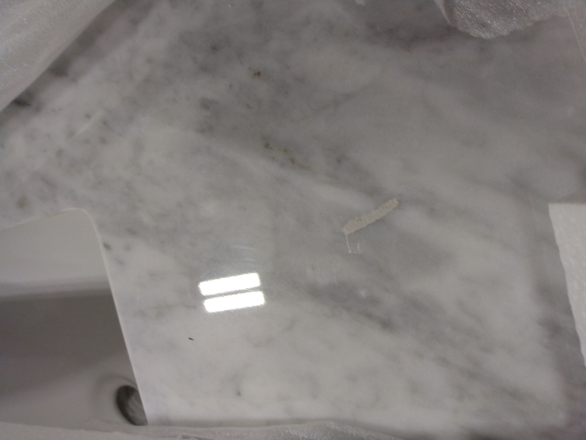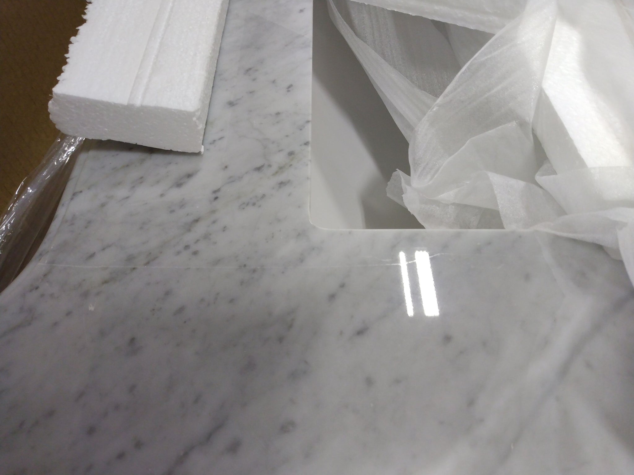 Open box, The color is White, There is a scratch along the right side of the countertop. The left side of the countertop has a few chips in it.