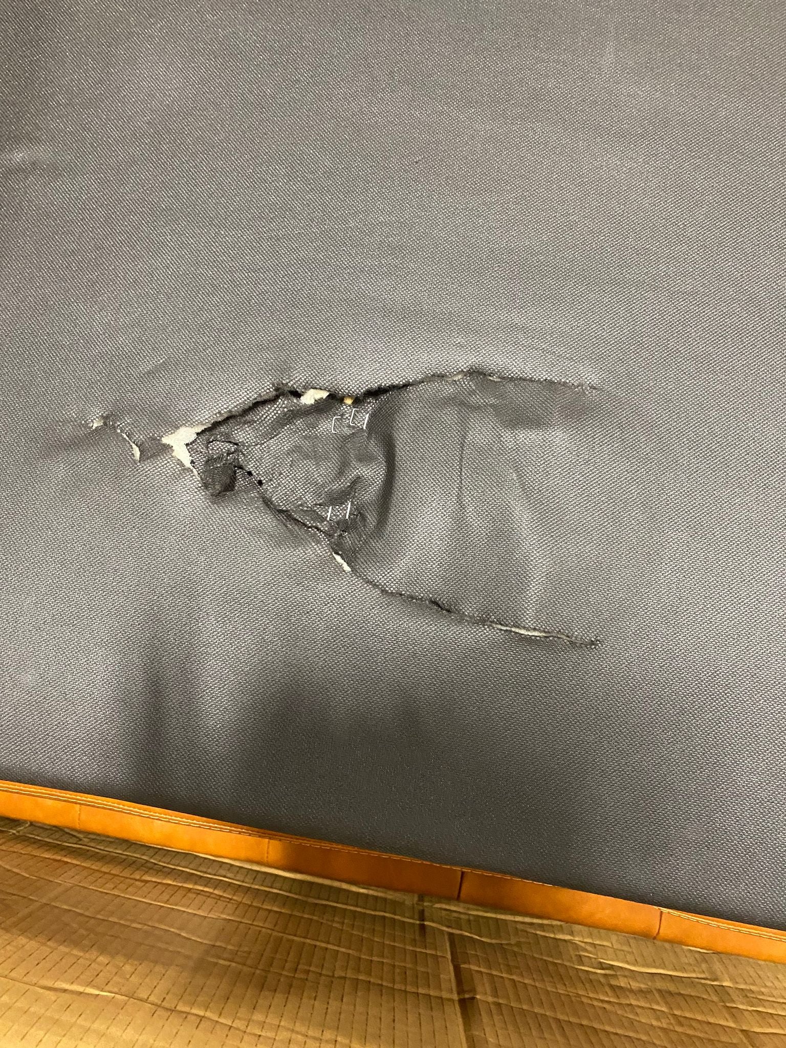 Open box, The color is camel, AS IS Condition: Small tear on underside of cushion. Seat deck torn due to shipment. See photos. Item in otherwise good condition.