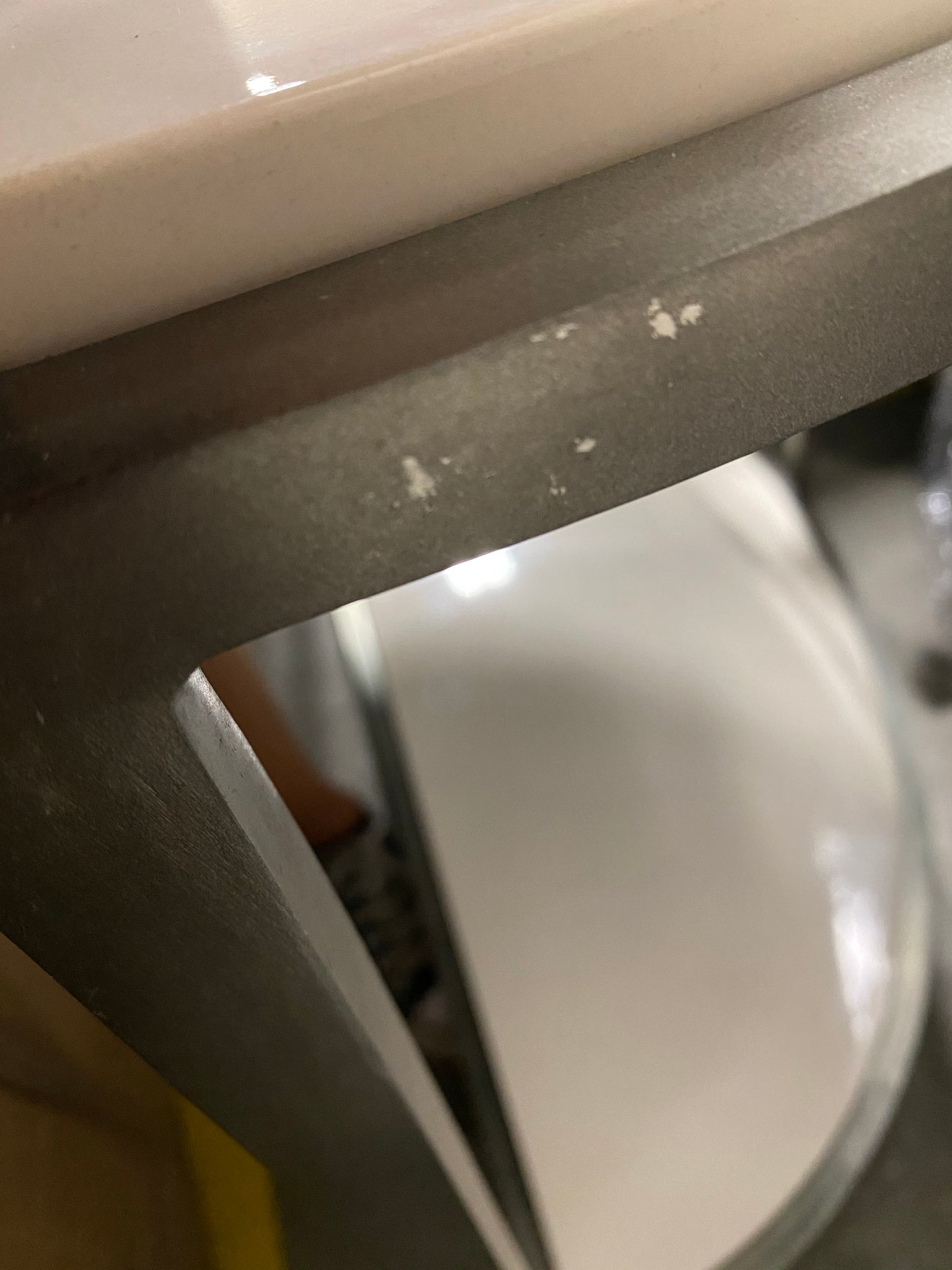 Left corner of table base has slight blemishes; very slight residue blemish on front of edge. Table in otherwise excellent condition.