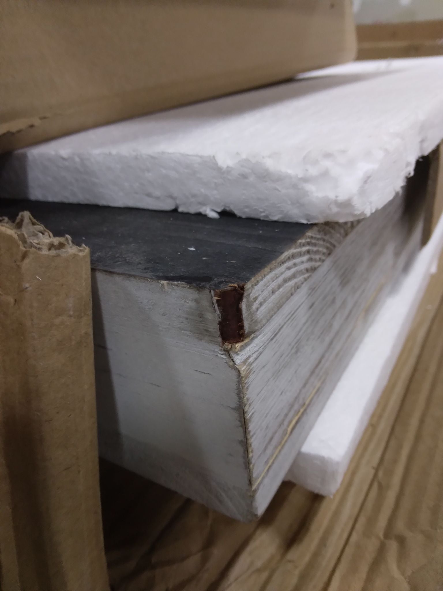 Open Box, The color is weathered white, There is a slight chip underneath the table top on the corner. See photo