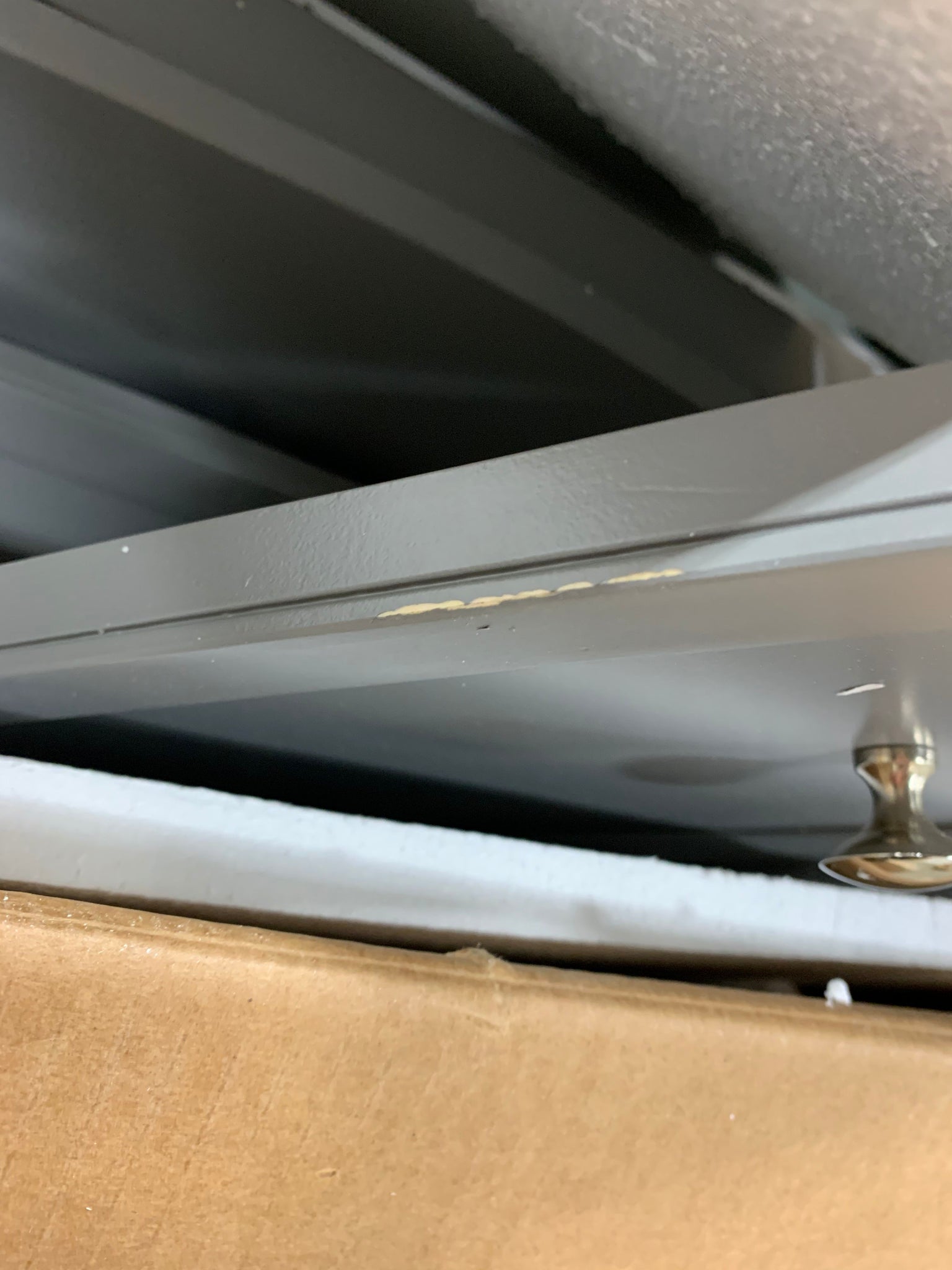 Open box, The color is weathered oak. Item has slight damage due to open shipment.