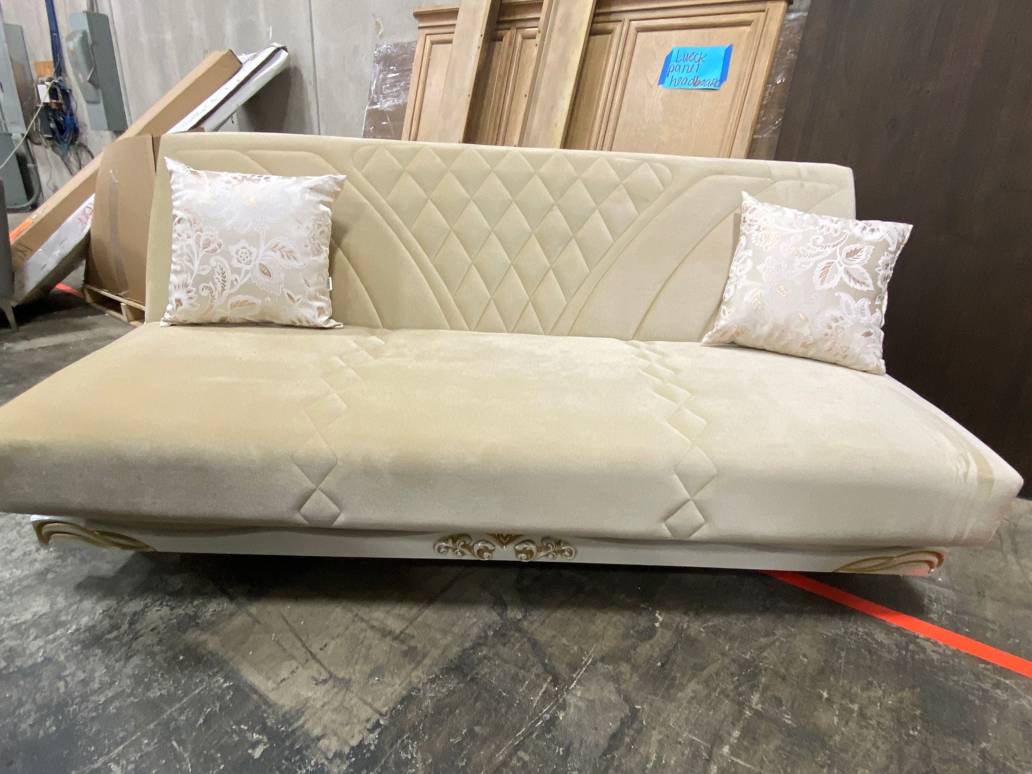 Out of the box, The color is beige, AS IS: missing arms. Comes with 2 throw pillows. Item does have some slight spotting on back and side due to open shipment. Storage area underneath seat. Item in otherwise good condition.