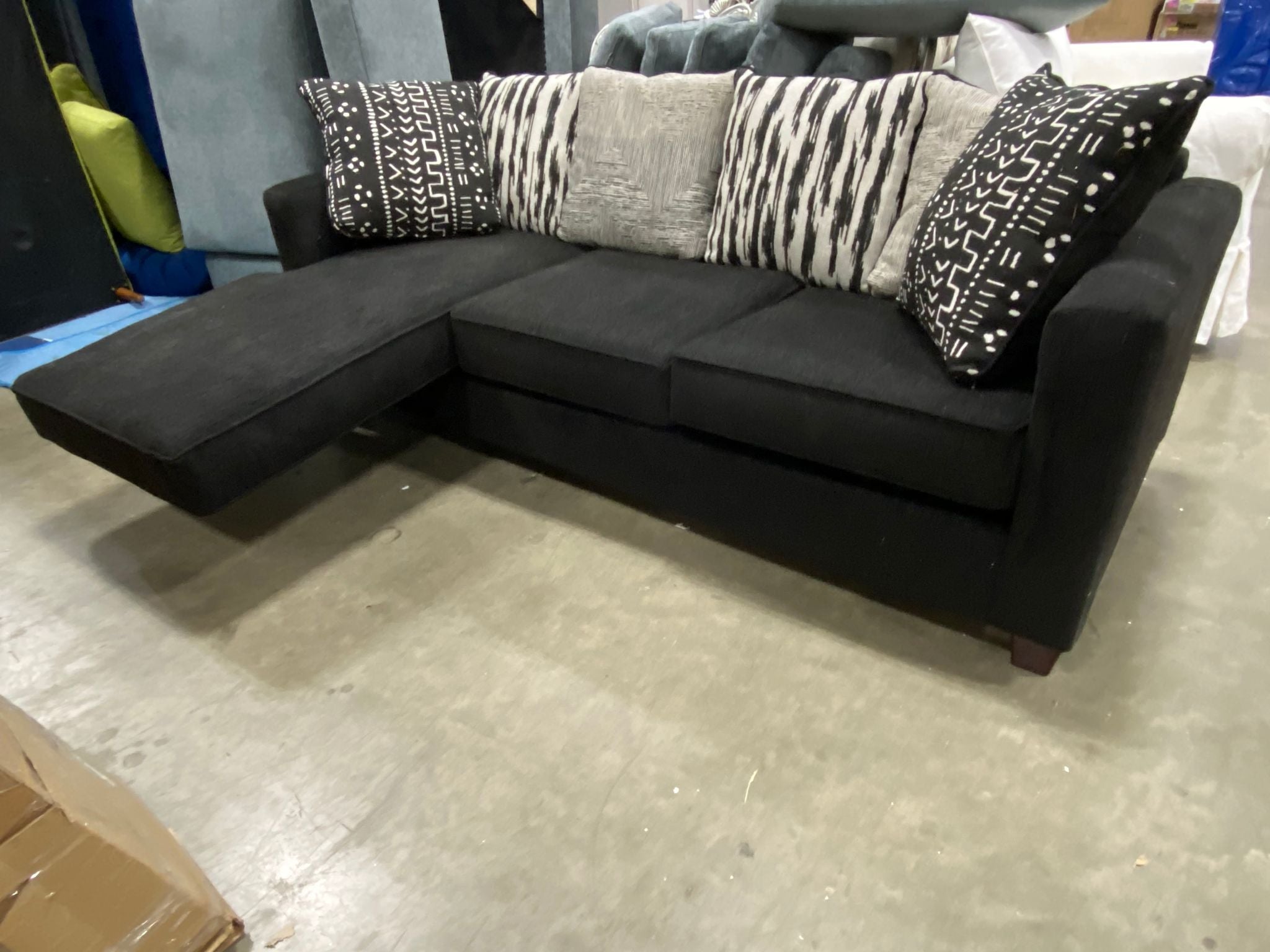 Out of box, The color is black, AS IS: Sofa missing ottoman.