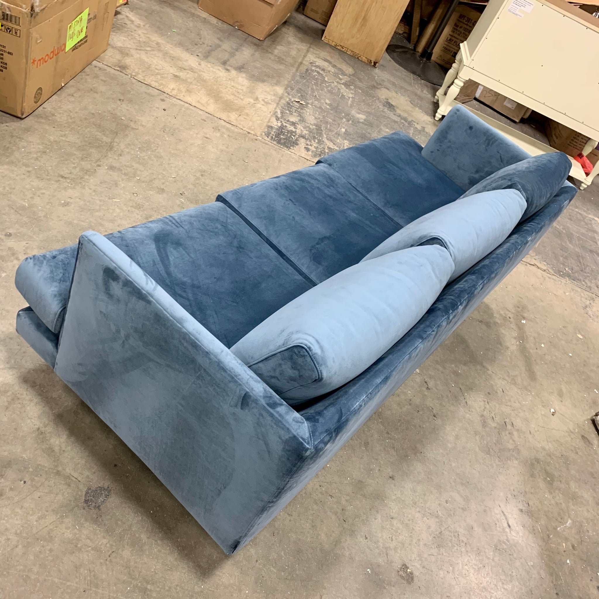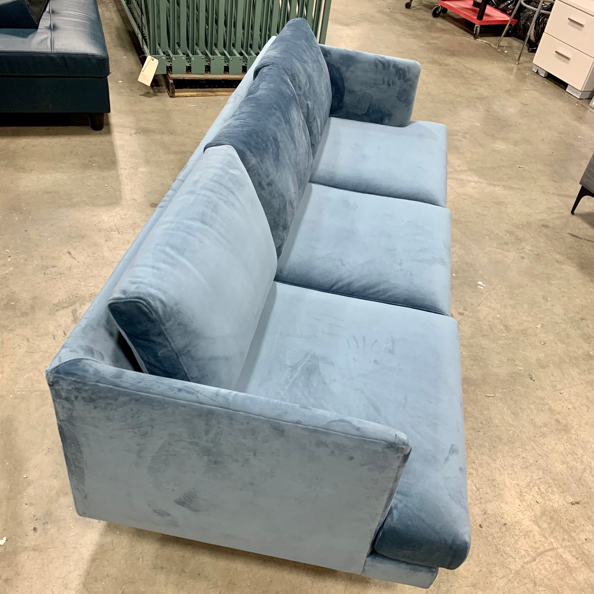 Fully assembled 84 inch recessed arms sofa upholstered in stax dust blue velvet with a wooden frame and brown finished legs. This item includes removable seat and back cushions and appears to be in great condition.