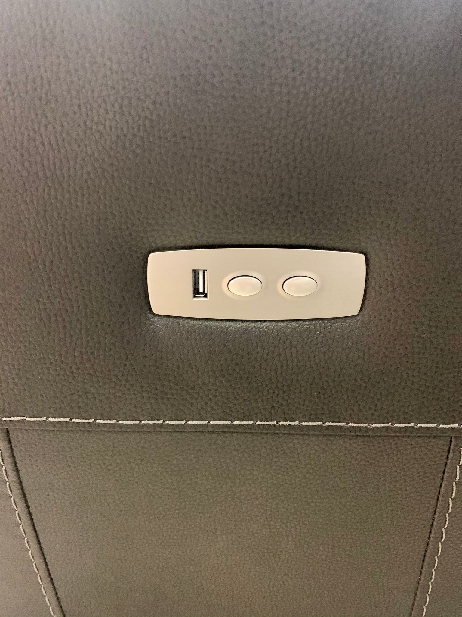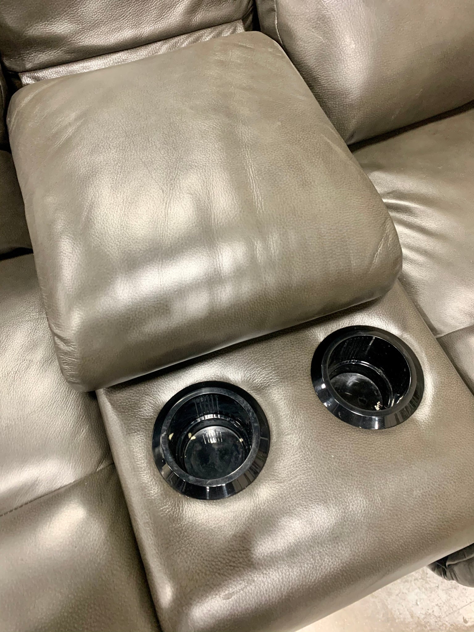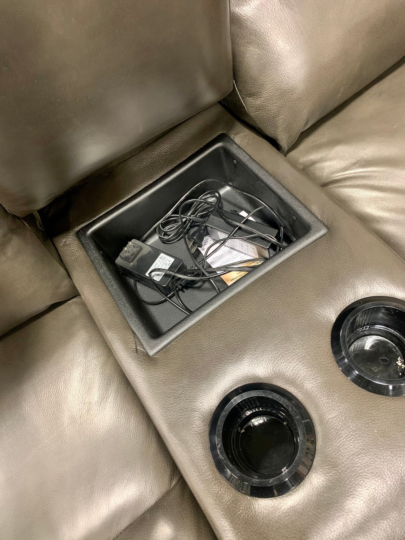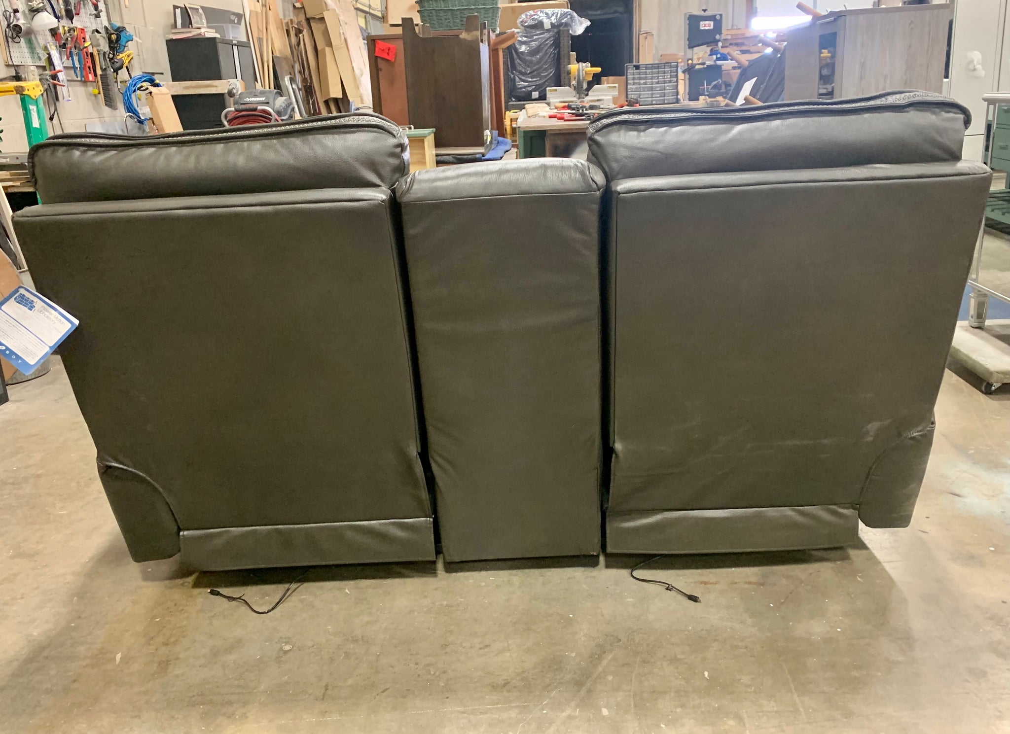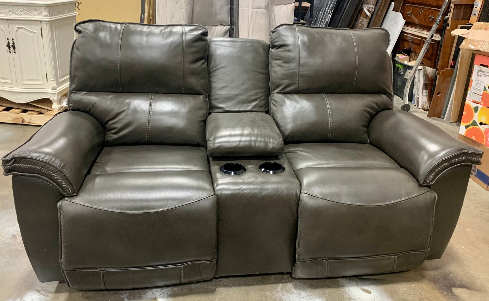 Out of box item. Good condition, has minor "out of packaging" scuffs but nothing major. Fully assembled leather power recliner wit chair padded arms, chaise seats, and leg rests. There are latch releases on the outside arms that allow you to adjust the left and right backs for personalized comfort. This loveseat also features built in USB ports on both sides of the chair. The middle console allows for hidden storage and there's room for drinks with two cup holders. Item has been quality checked and all the functions seem to work properly. Adapter is included.