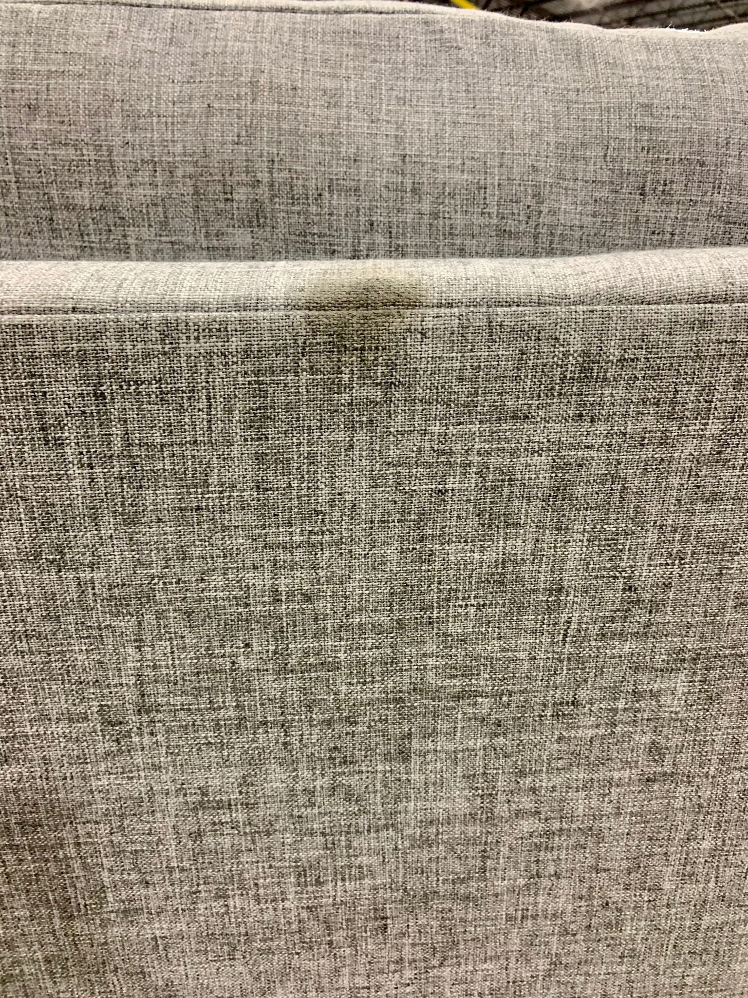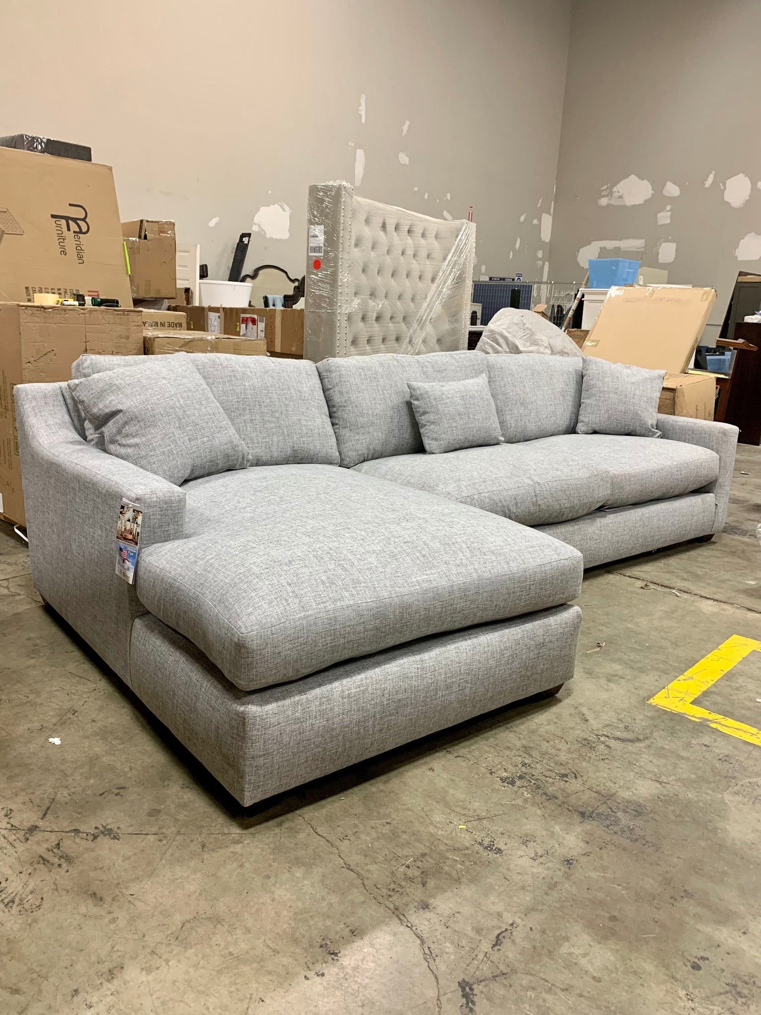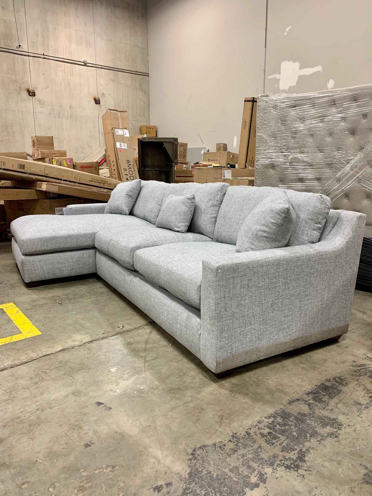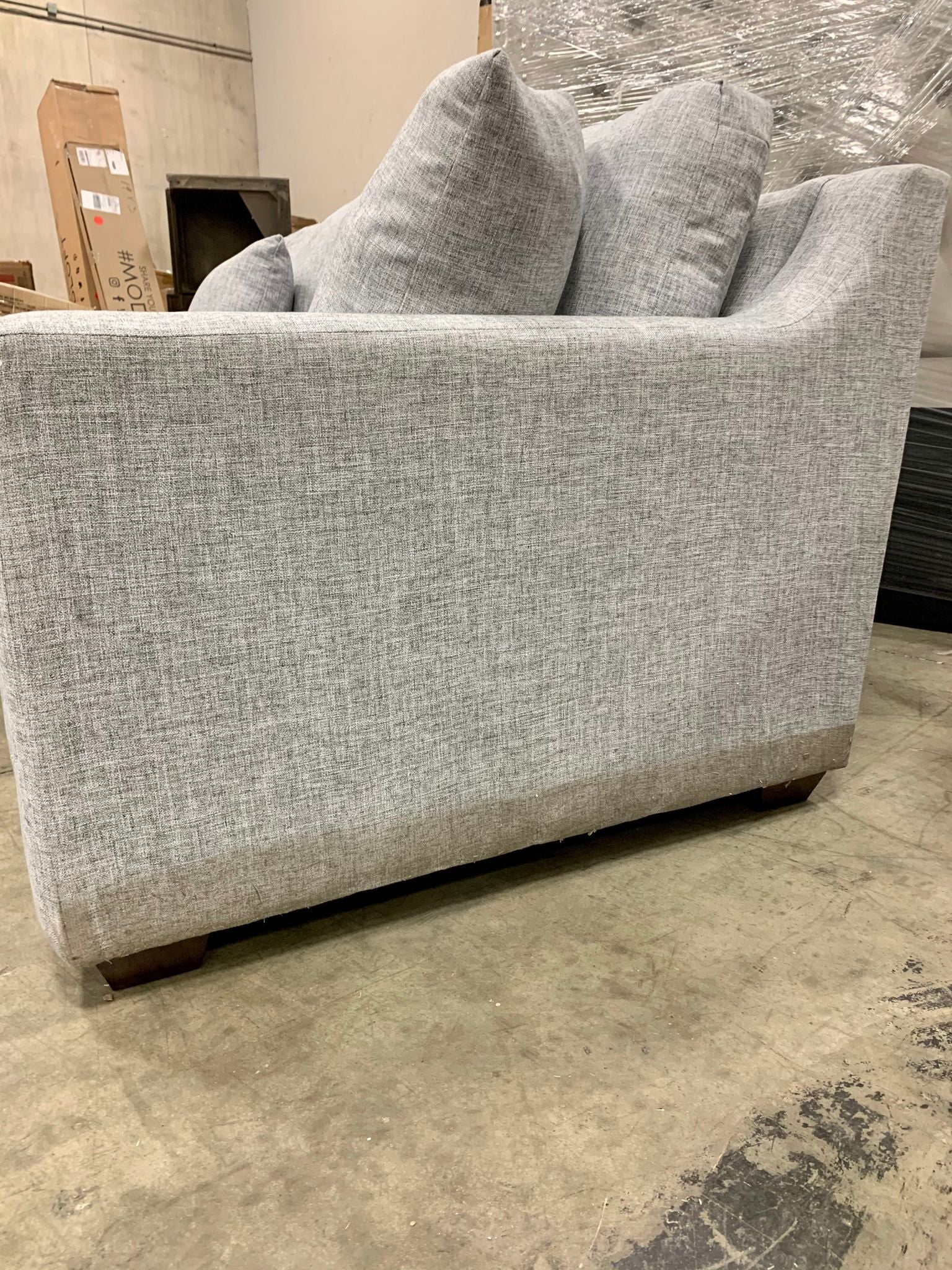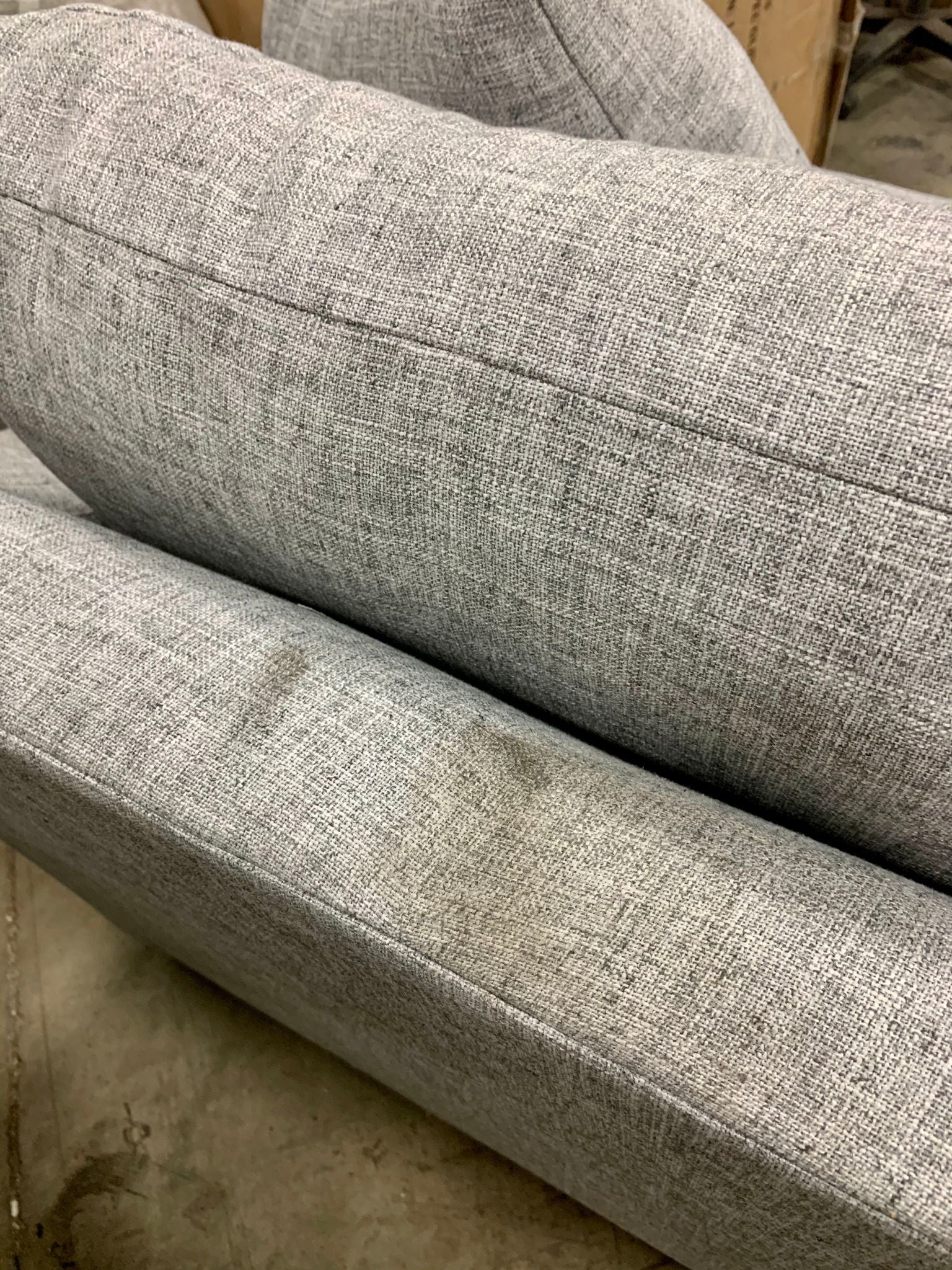 Out of box, The color is Zula Pumice. Item has some spotting due to open shipment, but otherwise appears in great condition. See photos for reference. 3 toss pillows are included. Orientation is left hand facing.