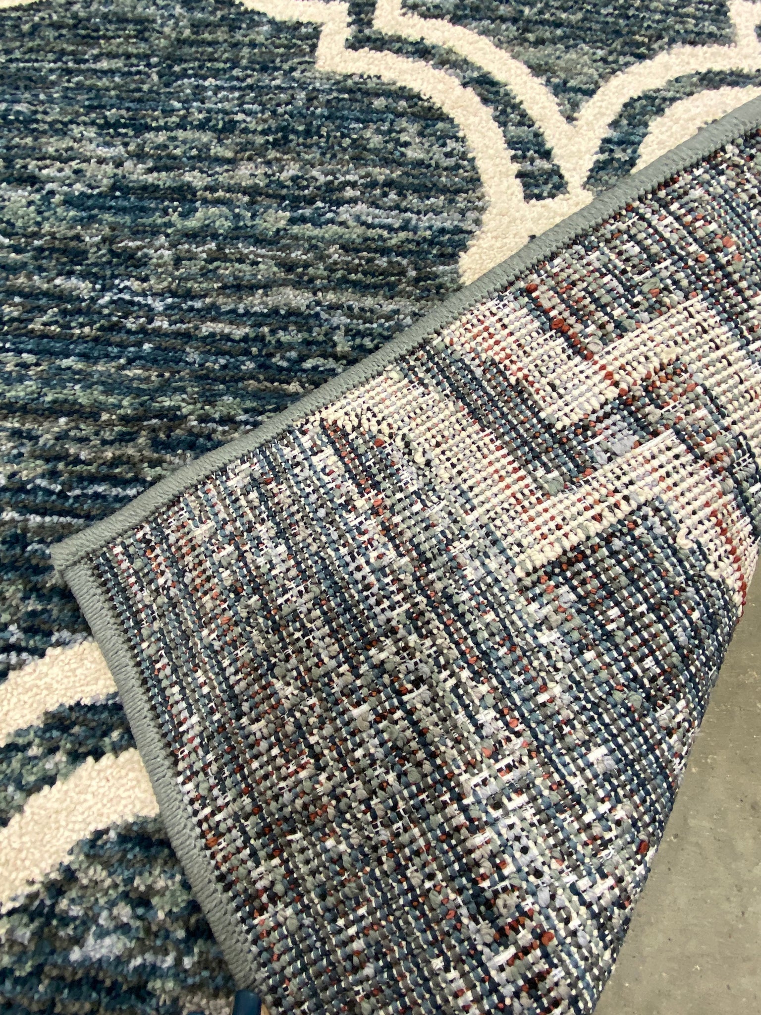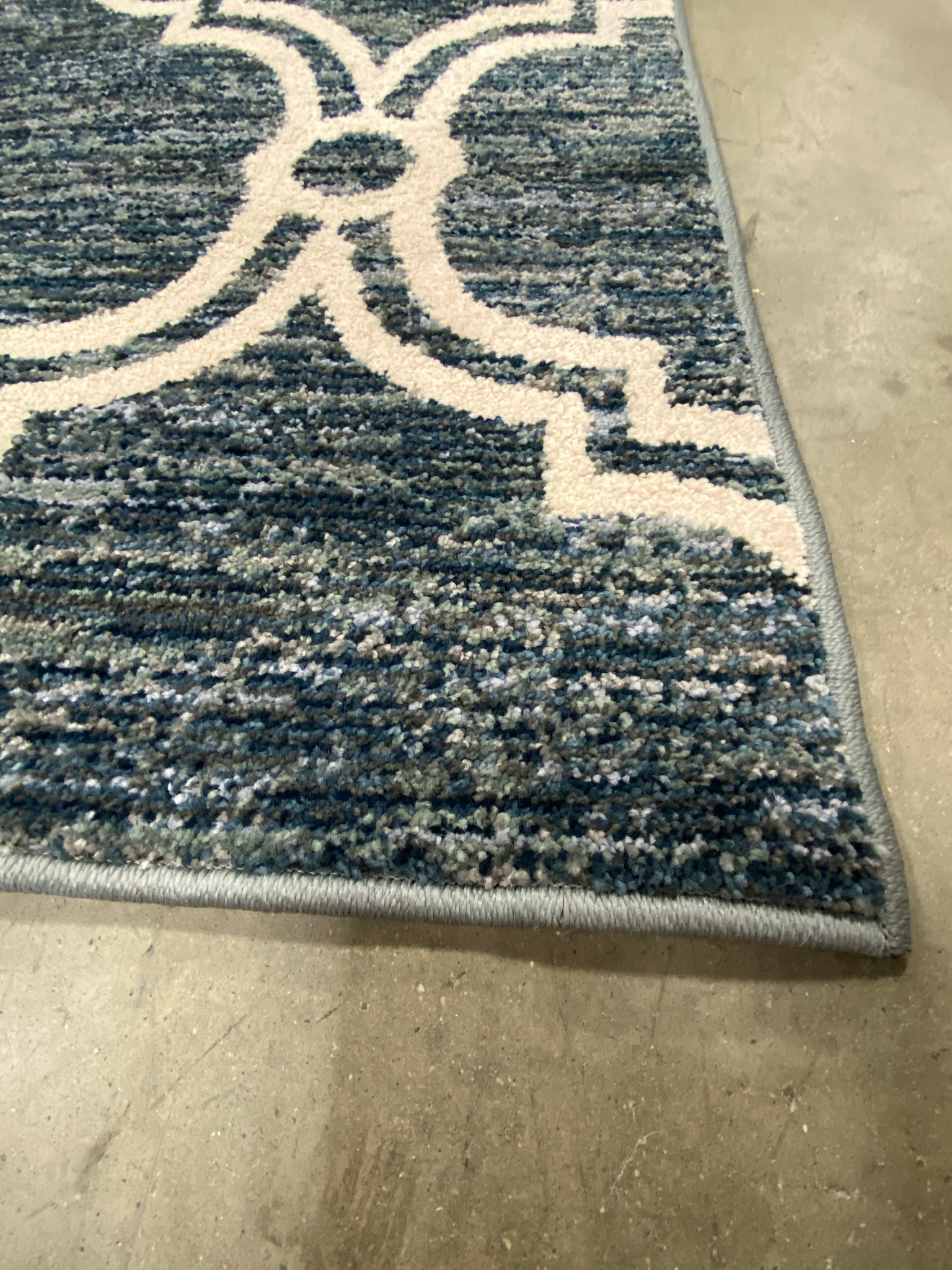7'10" x 12' area rug with large geometric print in Dark blue/Ivory. Light vacuum recommended.