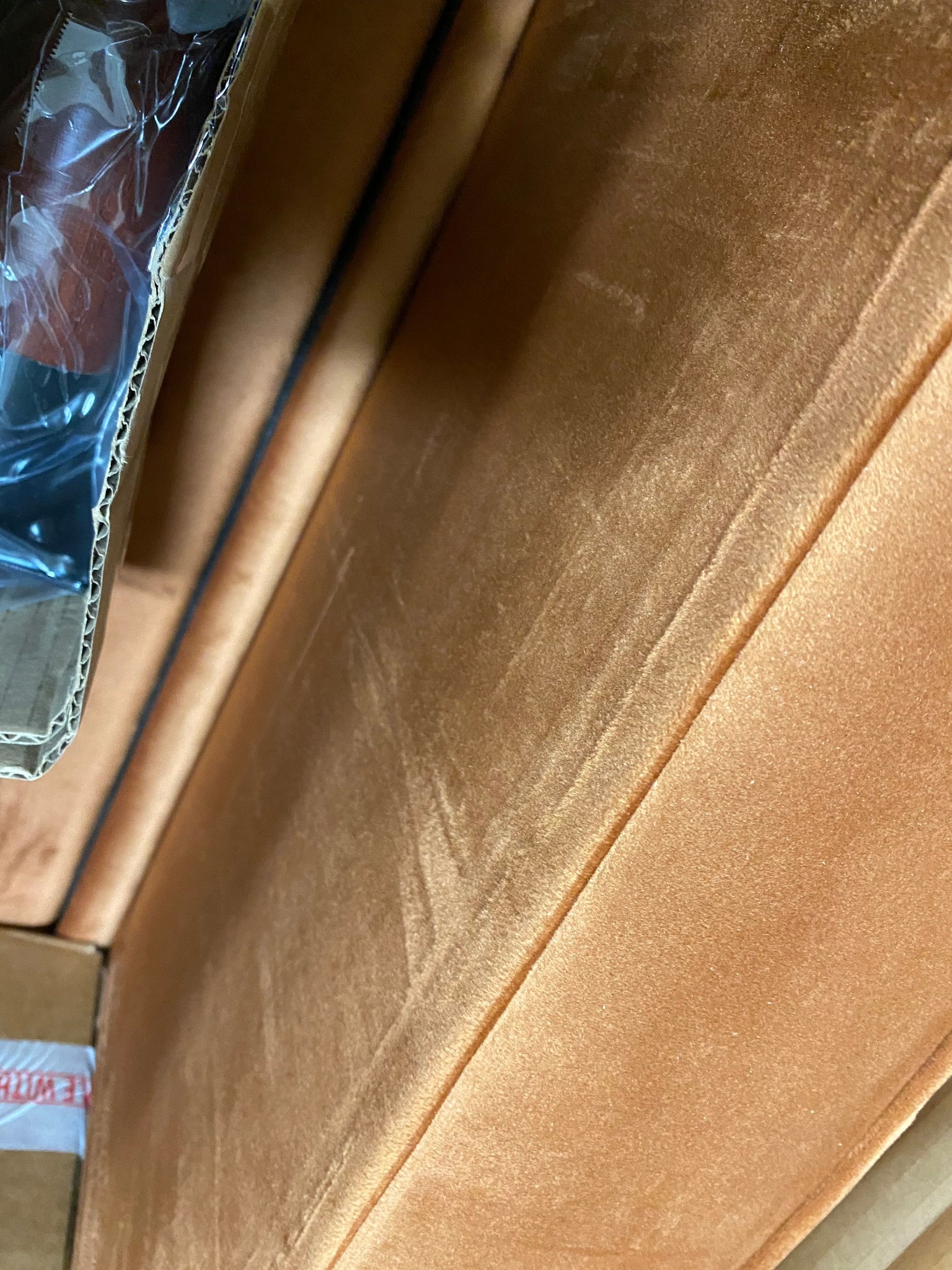 Open Box, The color is rust, AS IS Condition: Imperfections in the velvet due to tight shipment. See photos.