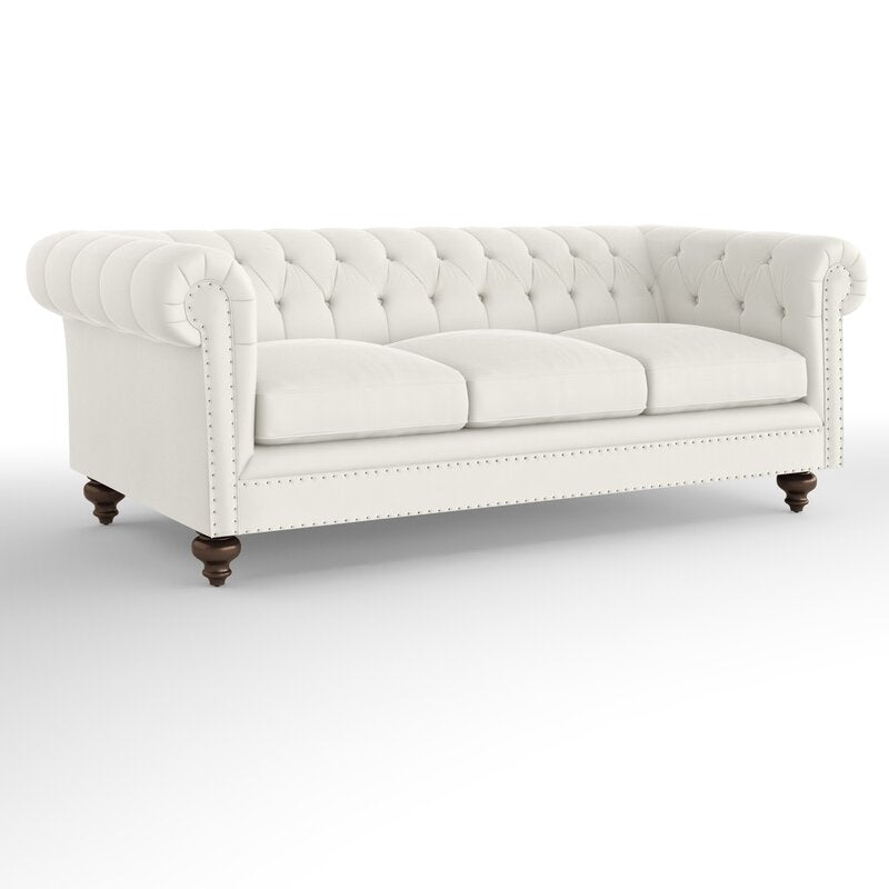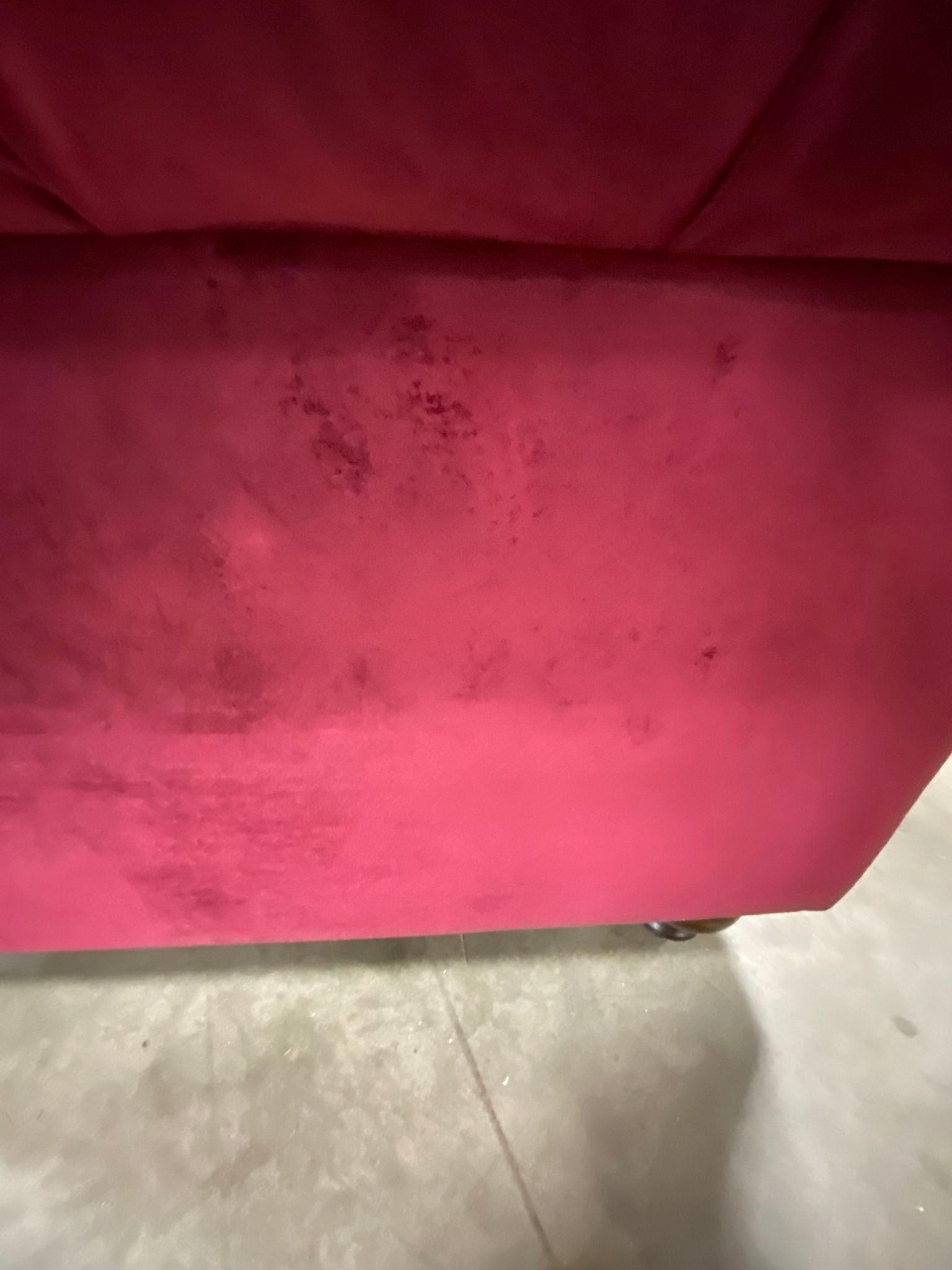 Out of box, The color is bayou flame, Item has tear repair on back right corner of sofa. Item has slight imperfections on bottom right side panel due to open shipment. Item in otherwise good condition.